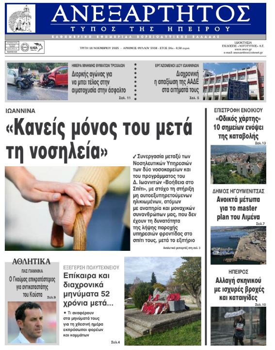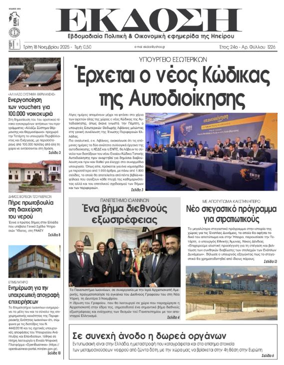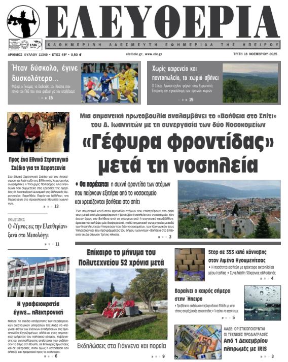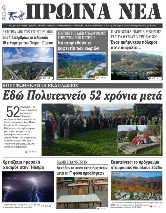 ΑρχικήTOP STORIES TOP STORIESΗΠΕΙΡΟΣ Τα πρωτοσέλιδα των γιαννιώτικων εφημερίδων 18.11.2025 0 FacebookTwitterWhatsAppEmailΤυπώνωViber Διαβάστε στα πρωτοσέλιδα των γιαννιώτικων εφημερίδων Τρίτη 18 Νοεμβρίου 2025 TagsΓΙΑΝΝΙΩΤΙΚΕΣ ΕΦΗΜΕΡΙΔΕΣΠΡΩΤΟΣΕΛΙΔΑ FacebookTwitterWhatsAppEmailΤυπώνωViber Προηγούμενο άρθροΕΥΡΩΠΑΪΚΗ ΗΜΕΡΑ ΣΤΙΣ 17 ΝΟΕΜΒΡΙΟΥ -Μία δέσμευση για την Ισότητα των ΑμοιβώνΕπόμενο άρθρο“Βοήθεια στο Σπίτι” μετά τη νοσηλεία ΣΧΕΤΙΚΑ ΑΡΘΡΑ Τα πρωτοσέλιδα των γιαννιώτικων εφημερίδων ΗΠΕΙΡΟΣ 15.11.2025 Τα πρωτοσέλιδα των γιαννιώτικων εφημερίδων ΗΠΕΙΡΟΣ 14.11.2025 Τα πρωτοσέλιδα των γιαννιώτικων εφημερίδων ΗΠΕΙΡΟΣ 13.11.2025 Τα πρωτοσέλιδα των γιαννιώτικων εφημερίδων ΗΠΕΙΡΟΣ 12.11.2025 Τα πρωτοσέλιδα των γιαννιώτικων εφημερίδων ΗΠΕΙΡΟΣ 11.11.2025 Τα πρωτοσέλιδα των γιαννιώτικων εφημερίδων TOP STORIES 08.11.2025 ΣΤΗΝ ΙΔΙΑ ΚΑΤΗΓΟΡΙΑ Προσβάσεις – ντροπή στα σχολεία στο Τσιφλικόπουλο ΗΠΕΙΡΟΣ 18.11.2025 Βελτίωση και επέκταση οριζόντιας σήμανσης ΗΠΕΙΡΟΣ 18.11.2025 Πράσινο φως για την κατασκευή νέου Νηπιαγωγείου στα Γιάννενα ΗΠΕΙΡΟΣ 18.11.2025 250.000 ευρώ για νέες ψηφιακές υπηρεσίες στον Δήμο Ιωαννιτών ΗΠΕΙΡΟΣ 18.11.2025 875.000 ευρώ για την αναβάθμιση υποδομών στο Κουτσελιό ΗΠΕΙΡΟΣ 18.11.2025 ΕΜΥ: Επικίνδυνες βροχές σε Ιόνιο, Ήπειρο και Αιτωλοακαρνανία ΗΠΕΙΡΟΣ 18.11.2025 ΜΗ ΧΑΣΕΤΕ Προσβάσεις – ντροπή στα σχολεία στο Τσιφλικόπουλο 250.000 ευρώ για νέες ψηφιακές υπηρεσίες στον Δήμο Ιωαννιτών ΕΜΥ: Επικίνδυνες βροχές σε Ιόνιο, Ήπειρο και Αιτωλοακαρνανία Στο επίκεντρο ακρίβεια, στεγαστική πολιτική και ενεργειακές συμφωνίες «Πάγωσε» το σχέδιο, όχι τα προβλήματα ΔΗΜΟΦΙΛΗ Αυξημένο πρωτογενές πλεόνασμα εμφάνισε ο προϋπολογισμός στο τέλος Οκτωβρίου Ο ΟΗΕ ενέκρινε το σχέδιο Τραμπ για στρατιωτική δύναμη στη Γάζα Αποχρώσεις Αλλαγή σελίδας για τον ΠΑΣ με κάλεσμα για ψυχραιμία και ρεαλισμό Μπόνους συνταξιούχων – Πόση θα είναι η ετήσια αύξηση