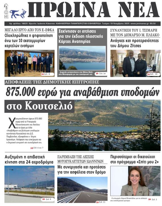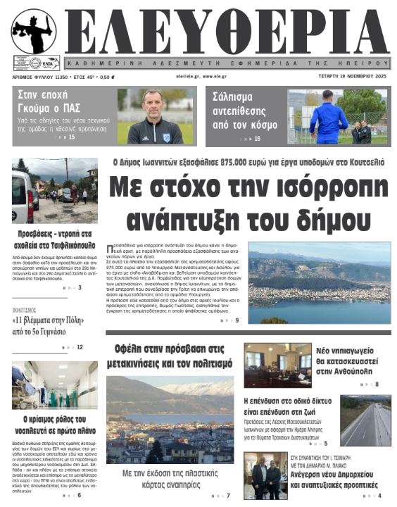 ΑρχικήΕΙΔΗΣΕΙΣΗΠΕΙΡΟΣ ΗΠΕΙΡΟΣ Τα πρωτοσέλιδα των γιαννιώτικων εφημερίδων 19.11.2025 0 FacebookTwitterWhatsAppEmailΤυπώνωViber Διαβάστε στα πρωτοσέλιδα των γιαννιώτικων εφημερίδων Τετάρτη 19 Νοεμβρίου 2025 TagsΓΙΑΝΝΙΩΤΙΚΕΣ ΕΦΗΜΕΡΙΔΕΣΠΡΩΤΟΣΕΛΙΔΑ FacebookTwitterWhatsAppEmailΤυπώνωViber Προηγούμενο άρθροΚεραυνός άνοιξε τρύπα σε στέγη τριώροφης πολυκατοικίαςΕπόμενο άρθροEurobank | 23 χρόνια «Μπροστά για την Παιδεία» ΣΧΕΤΙΚΑ ΑΡΘΡΑ Τα πρωτοσέλιδα των γιαννιώτικων εφημερίδων TOP STORIES 21.11.2025 Τα πρωτοσέλιδα των γιαννιώτικων εφημερίδων TOP STORIES 20.11.2025 Τα πρωτοσέλιδα των γιαννιώτικων εφημερίδων ΗΠΕΙΡΟΣ 18.11.2025 Τα πρωτοσέλιδα των γιαννιώτικων εφημερίδων ΗΠΕΙΡΟΣ 15.11.2025 Τα πρωτοσέλιδα των γιαννιώτικων εφημερίδων ΗΠΕΙΡΟΣ 14.11.2025 Τα πρωτοσέλιδα των γιαννιώτικων εφημερίδων ΗΠΕΙΡΟΣ 13.11.2025 ΣΤΗΝ ΙΔΙΑ ΚΑΤΗΓΟΡΙΑ Βροχές ενάμιση μήνα μέσα σε 48 ώρες στην Ήπειρο ΗΠΕΙΡΟΣ 21.11.2025 Τα πρωτοσέλιδα των γιαννιώτικων εφημερίδων TOP STORIES 21.11.2025 Ανακοινώθηκε η ολοκλήρωση της εξαγοράς της Γαλακτοβιομηχανίας «ΔΩΔΩΝΗ» ΗΠΕΙΡΟΣ 20.11.2025 Ένταση για τη μετατόπιση περιπτέρου στην κεντρική πλατεία ΗΠΕΙΡΟΣ 20.11.2025 Περιμένοντας λύση από την ελεγχόμενη στάθμευση ΗΠΕΙΡΟΣ 20.11.2025 Επικαλούνται τη συναίνεση, αλλά ενισχύουν τη σύγχυση ΗΠΕΙΡΟΣ 20.11.2025 ΜΗ ΧΑΣΕΤΕ Βροχές ενάμιση μήνα μέσα σε 48 ώρες στην Ήπειρο Τα πρωτοσέλιδα των γιαννιώτικων εφημερίδων Ένταση για τη μετατόπιση περιπτέρου στην κεντρική πλατεία Περιμένοντας λύση από την ελεγχόμενη στάθμευση Επικαλούνται τη συναίνεση, αλλά ενισχύουν τη σύγχυση ΔΗΜΟΦΙΛΗ Εκδήλωση για τη βία κατά των γυναικών Μάχη με το χρόνο για τη νέα φιλοσοφία Βροχές ενάμιση μήνα μέσα σε 48 ώρες στην Ήπειρο Παρουσιάζοντας τα μέτρα βιοασφάλειας για την ευλογιά των αιγοπροβάτων Τα του Καίσαρος…