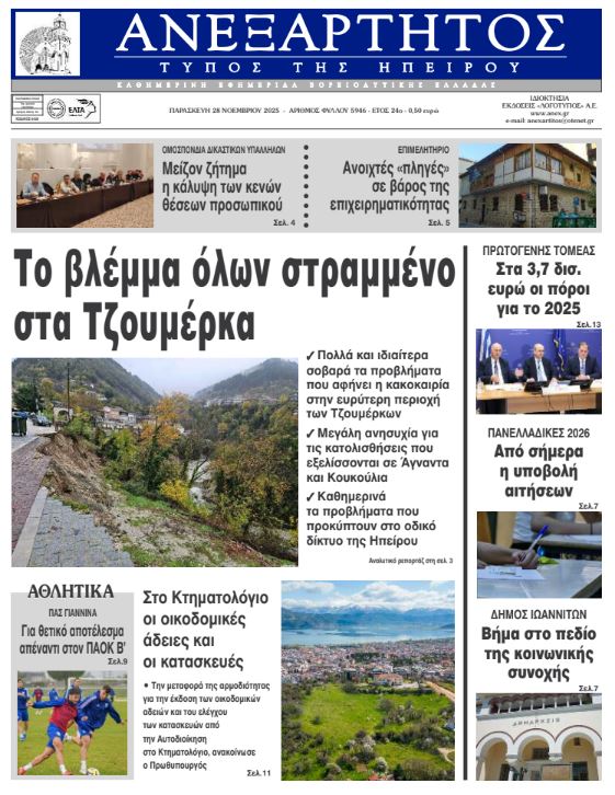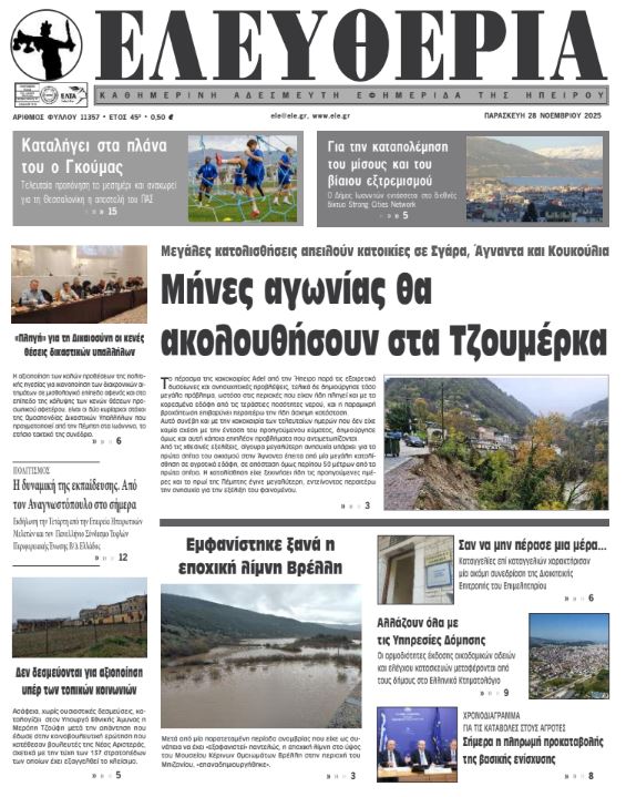 Διαβάστε στα πρωτοσέλιδα των γιαννιώτικων εφημερίδων Παρασκευή 28-11-2025