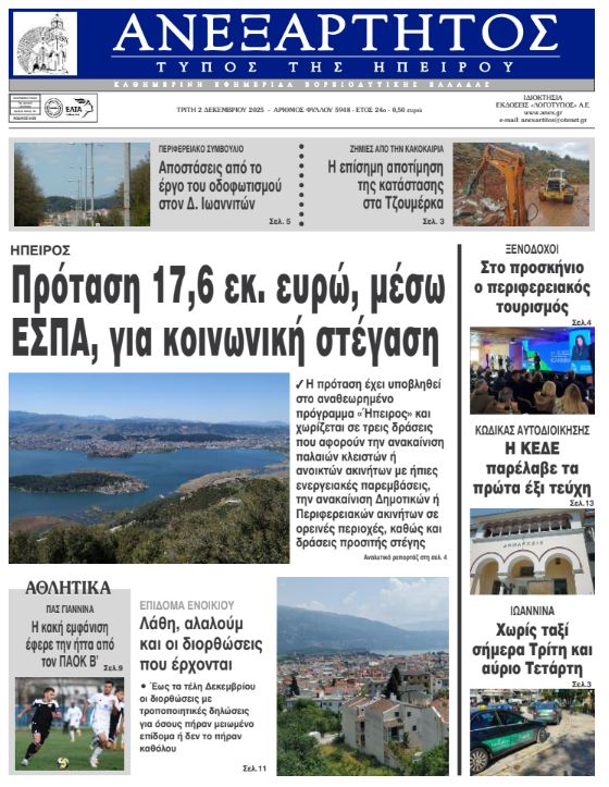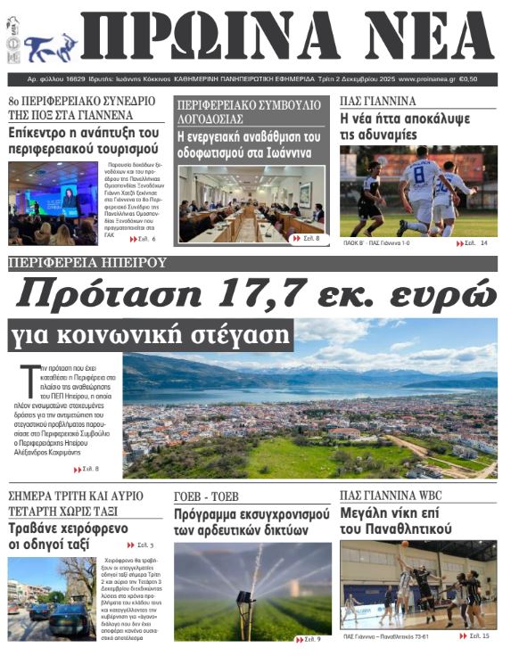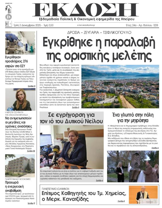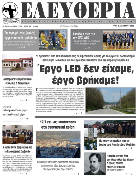 ΑρχικήTOP STORIES TOP STORIESΗΠΕΙΡΟΣ Τα πρωτοσέλιδα των γιαννιώτικων εφημερίδων 02.12.2025 0 FacebookTwitterWhatsAppEmailΤυπώνωViber Διαβάστε στα πρωτοσέλιδα των γιαννιώτικων εφημερίδων Τρίτη 2 Δεκεμβρίου 2025 TagsΓΙΑΝΝΙΩΤΙΚΕΣ ΕΦΗΜΕΡΙΔΕΣΠΡΩΤΟΣΕΛΙΔΑ FacebookTwitterWhatsAppEmailΤυπώνωViber Προηγούμενο άρθροΜητσοτάκης: Έχουμε αύξηση στο πραγματικό καθαρό εισόδημα 22% σε έξι χρόνιαΕπόμενο άρθροΤα του Καίσαρος… ΣΧΕΤΙΚΑ ΑΡΘΡΑ Τα πρωτοσέλιδα των γιαννιώτικων εφημερίδων ΗΠΕΙΡΟΣ 29.11.2025 Τα πρωτοσέλιδα των γιαννιώτικων εφημερίδων ΗΠΕΙΡΟΣ 28.11.2025 Τα πρωτοσέλιδα των γιαννιώτικων εφημερίδων ΗΠΕΙΡΟΣ 27.11.2025 Τα πρωτοσέλιδα των γιαννιώτικων εφημερίδων ΗΠΕΙΡΟΣ 26.11.2025 Τα πρωτοσέλιδα των γιαννιώτικων εφημερίδων ΗΠΕΙΡΟΣ 25.11.2025 Τα πρωτοσέλιδα των γιαννιώτικων εφημερίδων ΗΠΕΙΡΟΣ 22.11.2025 ΣΤΗΝ ΙΔΙΑ ΚΑΤΗΓΟΡΙΑ «Θα κάνουμε Χριστούγεννα στα μπλόκα» λένε οι αγρότες ΗΠΕΙΡΟΣ 02.12.2025 Μεγάλες ζημιές από πυρκαγιά σε διαμέρισμα στους Αμπελόκηπους ΗΠΕΙΡΟΣ 02.12.2025 Αυτοψία Τσίμαρη στις πληγείσες περιοχές των Τζουμέρκων ΗΠΕΙΡΟΣ 02.12.2025 Στα Ιωάννινα το 1ο Πολυθεματικό Επιστημονικό Συνέδριο ΟΤΑ ΗΠΕΙΡΟΣ 02.12.2025 800.000 ευρώ για το οδικό δίκτυο Καρδαμιτσίων και Νέας Ζωής ΗΠΕΙΡΟΣ 02.12.2025 Φωτιά σε πολυκατοικία στους Αμπελόκηπους ΗΠΕΙΡΟΣ 02.12.2025 ΜΗ ΧΑΣΕΤΕ «Θα κάνουμε Χριστούγεννα στα μπλόκα» λένε οι αγρότες Μεγάλες ζημιές από πυρκαγιά σε διαμέρισμα στους Αμπελόκηπους 800.000 ευρώ για το οδικό δίκτυο Καρδαμιτσίων και Νέας Ζωής Απολογισμός Οδικής Ασφάλειας για τον Νοέμβριο στην Ήπειρο Δώρο Χριστουγέννων: Γιατί φέτος θα δοθεί νωρίτερα και πώς υπολογίζεται ΔΗΜΟΦΙΛΗ Εργαζόμενοι ΠΓΝΙ – Ζητούν την μετατροπή των ΣΟΧ σε αορίστου χρόνου Έργο LED δεν είχαμε, έργο βρήκαμε! Υποχώρησε στο 2,9% ο πληθωρισμός στην Ελλάδα φέτος τον Νοέμβριο Τιμή στον παπα-Θανάση της Δουραχάνης – Ονοματοδοσία παραλίμνιου δρόμου στη μνήμη του Κίνδυνος για τοξικά απόβλητα στο νερό από χιλιάδες χωματερές στην Ευρώπη