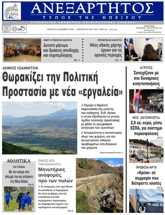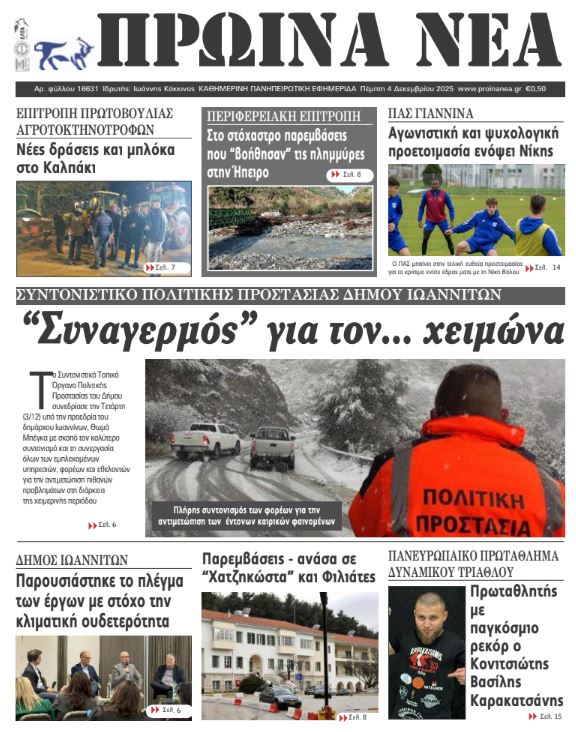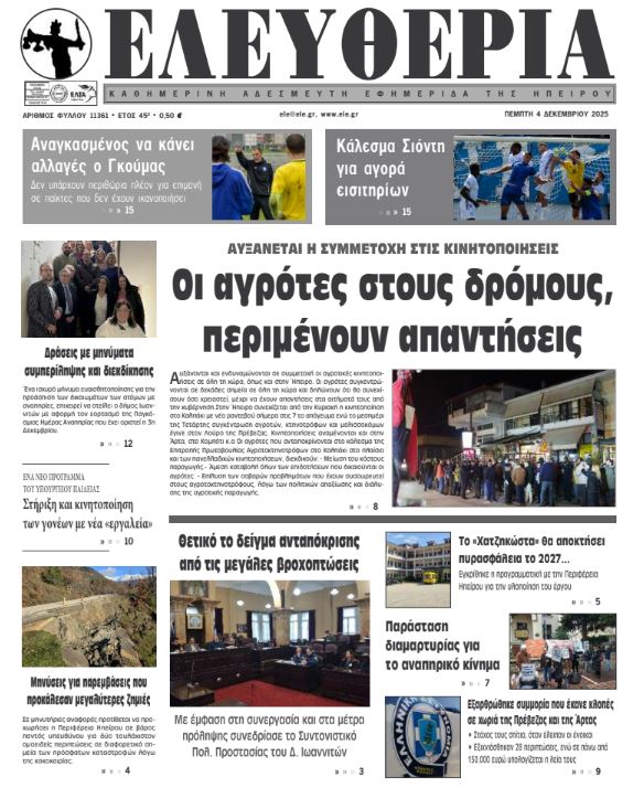 ΑρχικήTOP STORIES TOP STORIESΗΠΕΙΡΟΣΧωρίς κατηγορία Τα πρωτοσέλιδα των γιαννιώτικων εφημερίδων 04.12.2025 0 FacebookTwitterWhatsAppEmailΤυπώνωViber Διαβάστε στα πρωτοσέλιδα των γιαννιώτικων εφημερίδων 4-12-2025 TagsΓΙΑΝΝΙΩΤΙΚΕΣ ΕΦΗΜΕΡΙΔΕΣΠΡΩΤΟΣΕΛΙΔΑ FacebookTwitterWhatsAppEmailΤυπώνωViber Προηγούμενο άρθροΑπεργία ταξί: Παρατείνεται μέχρι την Παρασκευή ΣΧΕΤΙΚΑ ΑΡΘΡΑ Τα πρωτοσέλιδα των γιαννιώτικων εφημερίδων ΗΠΕΙΡΟΣ 03.12.2025 Τα πρωτοσέλιδα των γιαννιώτικων εφημερίδων TOP STORIES 02.12.2025 Τα πρωτοσέλιδα των γιαννιώτικων εφημερίδων ΗΠΕΙΡΟΣ 29.11.2025 Τα πρωτοσέλιδα των γιαννιώτικων εφημερίδων ΗΠΕΙΡΟΣ 28.11.2025 Τα πρωτοσέλιδα των γιαννιώτικων εφημερίδων ΗΠΕΙΡΟΣ 27.11.2025 Τα πρωτοσέλιδα των γιαννιώτικων εφημερίδων ΗΠΕΙΡΟΣ 26.11.2025 ΣΤΗΝ ΙΔΙΑ ΚΑΤΗΓΟΡΙΑ Κέρκυρα: Αυτοκίνητο έπεσε σε ποτάμι από ύψος 7 μέτρων -Επέβαιναν μητέρα και κόρη ΗΠΕΙΡΟΣ 03.12.2025 «Όλοι μαζί, χωρίς εμπόδια» ΗΠΕΙΡΟΣ 03.12.2025 Με μηνύσεις «απαντά» η Περιφέρεια Ηπείρου ΗΠΕΙΡΟΣ 03.12.2025 Εθελοντική αιμοδοσία στην Περιφέρεια Ηπείρου ΗΠΕΙΡΟΣ 03.12.2025 Συνεχίζονται οι κινητοποιήσεις των αγροτών στο μπλόκο Καλπακίου ΗΠΕΙΡΟΣ 03.12.2025 Δράσεις για την Παγκόσμια Ημέρα Ατόμων με Αναπηρία ΗΠΕΙΡΟΣ 03.12.2025 ΜΗ ΧΑΣΕΤΕ Με μηνύσεις «απαντά» η Περιφέρεια Ηπείρου Συνεχίζονται οι κινητοποιήσεις των αγροτών στο μπλόκο Καλπακίου Συντονισμός για την αντιμετώπιση έντονων καιρικών φαινομένων Έκτακτο δελτίο της ΕΜΥ για καταιγίδες, χαλαζοπτώσεις και ισχυρούς ανέμους Αγέλες αδέσποτων προκαλούν καθυστερήσεις στη διανομή των ΕΛΤΑ ΔΗΜΟΦΙΛΗ