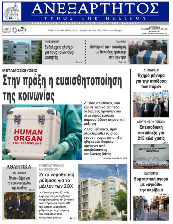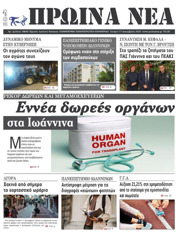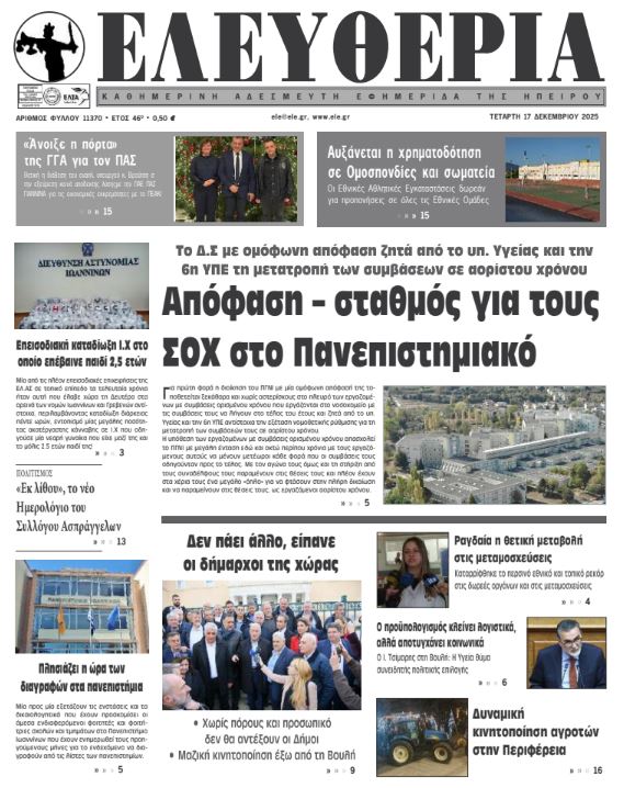 ΑρχικήTOP STORIES TOP STORIESΗΠΕΙΡΟΣ Τα πρωτοσέλιδα των γιαννιώτικων εφημερίδων 17.12.2025 0 FacebookTwitterWhatsAppEmailΤυπώνωViber Διαβάστε στα πρωτοσέλιδα των γιαννιώτικων εφημερίδων Τετάρτη 17-12-2025 TagsΓΙΑΝΝΙΩΤΙΚΕΣ ΕΦΗΜΕΡΙΔΕΣΠΡΩΤΟΣΕΛΙΔΑ FacebookTwitterWhatsAppEmailΤυπώνωViber Προηγούμενο άρθροΣτο τραπέζι λύσεις και προοπτικές – κρίσιμα μέτωπα εντός κι εκτός γηπέδουΕπόμενο άρθροΗχηρό μήνυμα για την απόδοση των πόρων στους δήμους ΣΧΕΤΙΚΑ ΑΡΘΡΑ Τα πρωτοσέλιδα των γιαννιώτικων εφημερίδων ΗΠΕΙΡΟΣ 16.12.2025 Τα πρωτοσέλιδα των γιαννιώτικων εφημερίδων ΗΠΕΙΡΟΣ 13.12.2025 Τα πρωτοσέλιδα των γιαννιώτικων εφημερίδων ΗΠΕΙΡΟΣ 12.12.2025 Τα πρωτοσέλιδα των γιαννιώτικων εφημερίδων ΗΠΕΙΡΟΣ 11.12.2025 Τα πρωτοσέλιδα των γιαννιώτικων εφημερίδων ΗΠΕΙΡΟΣ 10.12.2025 Τα πρωτοσέλιδα των γιαννιώτικων εφημερίδων ΗΠΕΙΡΟΣ 09.12.2025 ΣΤΗΝ ΙΔΙΑ ΚΑΤΗΓΟΡΙΑ Θετική η απόφαση του Δ.Σ. Φιλιατών για νέο σωφρονιστικό κατάστημα ΗΠΕΙΡΟΣ 17.12.2025 Διαγραφές φοιτητών στο Πανεπιστήμιο Ιωαννίνων – Κάλεσμα για συγκέντρωση ΗΠΕΙΡΟΣ 17.12.2025 Τα δύο «πρόσωπα» του παραλίμνιου μετώπου ΗΠΕΙΡΟΣ 17.12.2025 Έκκληση για τήρηση της καθαριότητας τις ημέρες των εορτών ΗΠΕΙΡΟΣ 17.12.2025 Ιστορικό υψηλό σε δωρεές οργάνων και μεταμοσχεύσεις ΗΠΕΙΡΟΣ 17.12.2025 ΠΓΝΙ: Απόφαση-σταθμός για τους εργαζόμενους ορισμένου χρόνου – Στο τραπέζι η μονιμοποίηση ΗΠΕΙΡΟΣ 17.12.2025 ΜΗ ΧΑΣΕΤΕ Νέα μέτρα για το στεγαστικό – Επιδότηση ανακαινίσεων και κίνητρα για εργαζόμενους εκτός αστικών κέντρων Τα δύο «πρόσωπα» του παραλίμνιου μετώπου Ιστορικό υψηλό σε δωρεές οργάνων και μεταμοσχεύσεις ΠΓΝΙ: Απόφαση-σταθμός για τους εργαζόμενους ορισμένου χρόνου – Στο τραπέζι η μονιμοποίηση Ηχηρό μήνυμα για την απόδοση των πόρων στους δήμους ΔΗΜΟΦΙΛΗ Νέα μέτρα για το στεγαστικό – Επιδότηση ανακαινίσεων και κίνητρα για εργαζόμενους εκτός αστικών κέντρων Ξεκινούν οι πληρωμές των συντάξεων Ιανουαρίου με αύξηση 2,4% Χιλιάδες αποτυπώματα δεινοσαύρων εντοπίστηκαν στη βόρεια Ιταλία Τα του Καίσαρος… Θετική η απόφαση του Δ.Σ. Φιλιατών για νέο σωφρονιστικό κατάστημα