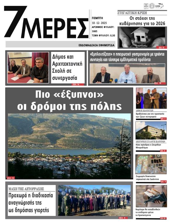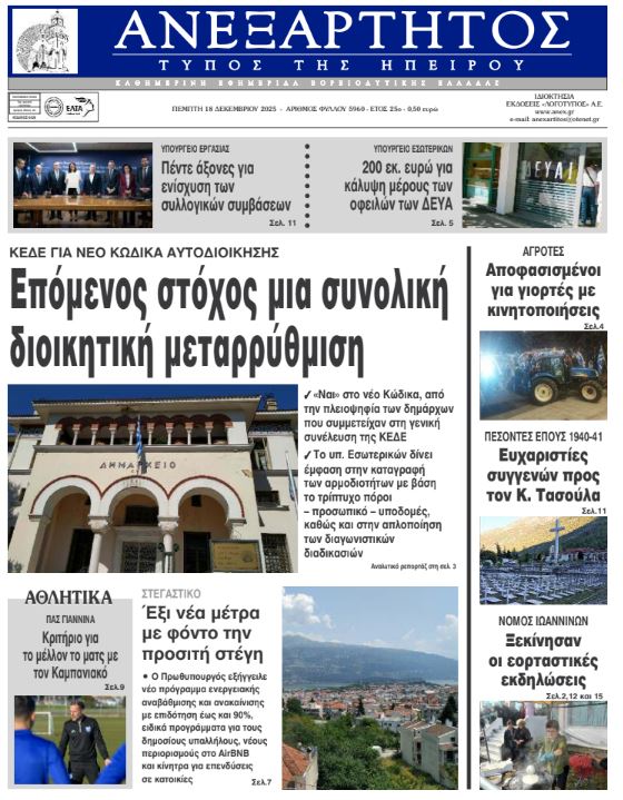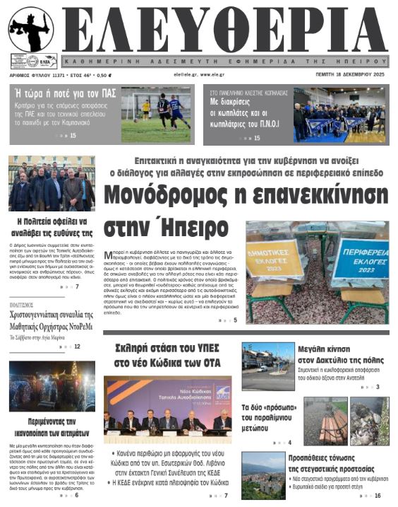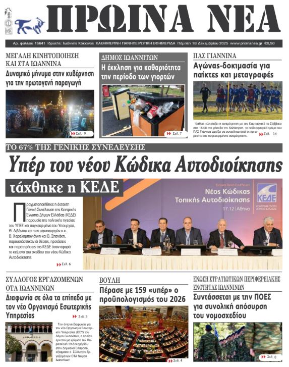ΑρχικήTOP STORIES TOP STORIESΗΠΕΙΡΟΣ Τα πρωτοσέλιδα των γιαννιώτικων εφημερίδων 18.12.2025 0 FacebookTwitterWhatsAppEmailΤυπώνωViber Διαβάστε στα πρωτοσέλιδα των γιαννιώτικων εφημερίδων Πέμπτη 18-12-2025 TagsΓΙΑΝΝΙΩΤΙΚΕΣ ΕΦΗΜΕΡΙΔΕΣΠΡΩΤΟΣΕΛΙΔΑ FacebookTwitterWhatsAppEmailΤυπώνωViber Προηγούμενο άρθροΝεκρός σε τροχαίο 42χρονος μοτοσικλετιστής στην ΧαλκιδικήΕπόμενο άρθροΚώδικας Τοπικής Αυτοδιοίκησης: Ευρεία έγκριση, αλλά ανοιχτά ζητήματα για πόρους και αυτοτέλεια ΣΧΕΤΙΚΑ ΑΡΘΡΑ Τα πρωτοσέλιδα των γιαννιώτικων εφημερίδων ΗΠΕΙΡΟΣ 17.12.2025 Τα πρωτοσέλιδα των γιαννιώτικων εφημερίδων ΗΠΕΙΡΟΣ 16.12.2025 Τα πρωτοσέλιδα των γιαννιώτικων εφημερίδων ΗΠΕΙΡΟΣ 13.12.2025 Τα πρωτοσέλιδα των γιαννιώτικων εφημερίδων ΗΠΕΙΡΟΣ 12.12.2025 Τα πρωτοσέλιδα των γιαννιώτικων εφημερίδων ΗΠΕΙΡΟΣ 11.12.2025 Τα πρωτοσέλιδα των γιαννιώτικων εφημερίδων ΗΠΕΙΡΟΣ 10.12.2025 ΣΤΗΝ ΙΔΙΑ ΚΑΤΗΓΟΡΙΑ Χριστούγεννα με αστάθεια και βροχές – Πιο χειμωνιάτικο το σκηνικό προς την Πρωτοχρονιά TOP STORIES 18.12.2025 Μονόδρομος η επανεκκίνηση στην Ήπειρο ΗΠΕΙΡΟΣ 18.12.2025 Το Πυροσβεστικό Σώμα γιόρτασε τους προστάτες του ΗΠΕΙΡΟΣ 18.12.2025 Έκκληση για αιμοπετάλια και αίμα από τον Σύλλογο Εκπαιδευτικών Ιωαννίνων ΗΠΕΙΡΟΣ 17.12.2025 Αιφνιδιαστικοί έλεγχοι του ΟΠΕΚΕΠΕ σε κτηνοτροφικές μονάδες στους Λιγκιάδες ΗΠΕΙΡΟΣ 17.12.2025 Θετική η απόφαση του Δ.Σ. Φιλιατών για νέο σωφρονιστικό κατάστημα ΗΠΕΙΡΟΣ 17.12.2025 ΜΗ ΧΑΣΕΤΕ Χριστούγεννα με αστάθεια και βροχές – Πιο χειμωνιάτικο το σκηνικό προς την Πρωτοχρονιά Σήμερα οι αποφάσεις για το μέλλον των αγροτικών κινητοποιήσεων Μονόδρομος η επανεκκίνηση στην Ήπειρο Κώδικας Τοπικής Αυτοδιοίκησης: Ευρεία έγκριση, αλλά ανοιχτά ζητήματα για πόρους και αυτοτέλεια Νέα μέτρα για το στεγαστικό – Επιδότηση ανακαινίσεων και κίνητρα για εργαζόμενους εκτός αστικών κέντρων ΔΗΜΟΦΙΛΗ Μονόδρομος η επανεκκίνηση στην Ήπειρο Κώδικας Τοπικής Αυτοδιοίκησης: Ευρεία έγκριση, αλλά ανοιχτά ζητήματα για πόρους και αυτοτέλεια «Εκ λίθου» – Ένα ημερολόγιο αφιερωμένο στην πέτρα και την τέχνη των μαστόρων Μητσοτάκης: Στήριξη στην Ουκρανία με ασφαλή και νόμιμη χρηματοδότηση στο Ευρωπαϊκό Συμβούλιο Σήμερα οι αποφάσεις για το μέλλον των αγροτικών κινητοποιήσεων