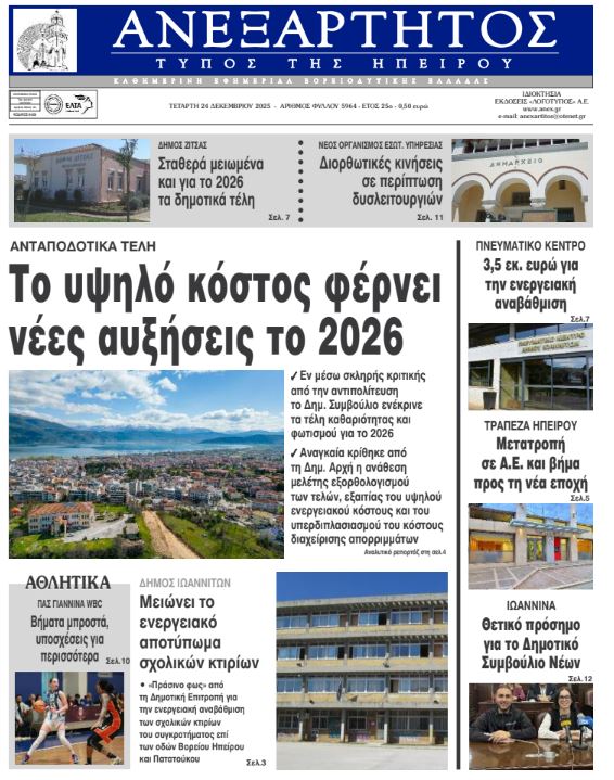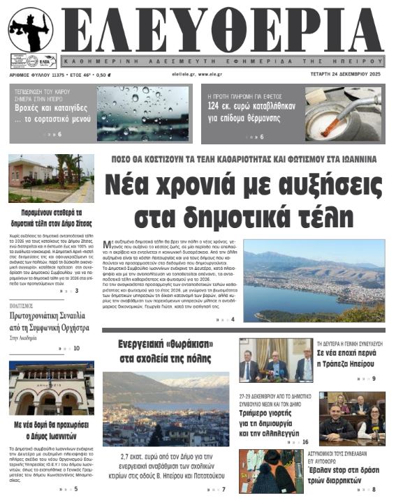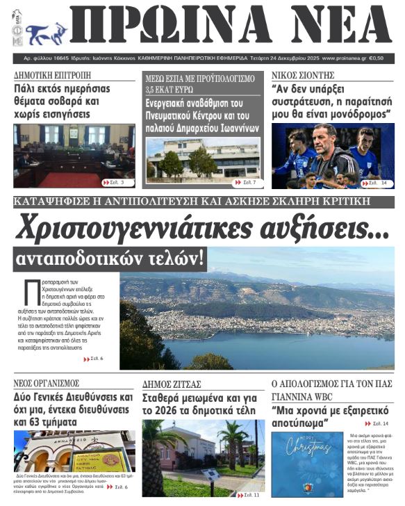 ΑρχικήTOP STORIES TOP STORIESΗΠΕΙΡΟΣ Τα πρωτοσέλιδα των γιαννιώτικων εφημερίδων 24.12.2025 0 FacebookTwitterWhatsAppEmailΤυπώνωViber Διαβάστε στα πρωτοσέλιδα των γιαννιώτικων εφημερίδων Τετάρτη 24-12-2025 TagsΓΙΑΝΝΙΩΤΙΚΕΣ ΕΦΗΜΕΡΙΔΕΣΠΡΩΤΟΣΕΛΙΔΑ FacebookTwitterWhatsAppEmailΤυπώνωViber Προηγούμενο άρθροΙσπανία: Πολωνοί καταληψίες σαλέ δολοφόνησαν δύο Γερμανούς τουρίστες μετά από καβγάΕπόμενο άρθροΚακοκαιρία τα Χριστούγεννα – Ισχυρά φαινόμενα σε πολλές περιοχές ΣΧΕΤΙΚΑ ΑΡΘΡΑ Τα πρωτοσέλιδα των γιαννιώτικων εφημερίδων ΗΠΕΙΡΟΣ 23.12.2025 Τα πρωτοσέλιδα των γιαννιώτικων εφημερίδων ΗΠΕΙΡΟΣ 19.12.2025 Τα πρωτοσέλιδα των γιαννιώτικων εφημερίδων ΗΠΕΙΡΟΣ 18.12.2025 Τα πρωτοσέλιδα των γιαννιώτικων εφημερίδων ΗΠΕΙΡΟΣ 17.12.2025 Τα πρωτοσέλιδα των γιαννιώτικων εφημερίδων ΗΠΕΙΡΟΣ 16.12.2025 Τα πρωτοσέλιδα των γιαννιώτικων εφημερίδων ΗΠΕΙΡΟΣ 13.12.2025 ΣΤΗΝ ΙΔΙΑ ΚΑΤΗΓΟΡΙΑ Ανοιχτά τα καταστήματα την παραμονή Χριστουγέννων TOP STORIES 24.12.2025 Τρεις νέες μόνιμες θέσεις γιατρών στα Κέντρα Υγείας Θεσπρωτίας ΗΠΕΙΡΟΣ 23.12.2025 Επίσκεψη Τσίμαρη στο 1ο ΚΔΑΠμεΑ του Δήμου Ιωαννιτών ΗΠΕΙΡΟΣ 23.12.2025 3,5 εκατ. ευρώ για την αναβάθμιση του Πνευματικού Κέντρου και του παλιού Δημαρχείου ΗΠΕΙΡΟΣ 23.12.2025 2,7 εκατ. ευρώ για την ενεργειακή αναβάθμιση σχολικών κτιρίων στο Δήμο Ιωαννιτών ΗΠΕΙΡΟΣ 23.12.2025 Σταθερά χαμηλά τα δημοτικά τέλη στο Δήμο Ζίτσας και για το 2026 ΗΠΕΙΡΟΣ 23.12.2025 ΜΗ ΧΑΣΕΤΕ Χριστουγεννιάτικη έξοδος με αυξημένη κίνηση και αγροτικά μπλόκα Ανοιχτά τα καταστήματα την παραμονή Χριστουγέννων Κακοκαιρία τα Χριστούγεννα – Ισχυρά φαινόμενα σε πολλές περιοχές 3,5 εκατ. ευρώ για την αναβάθμιση του Πνευματικού Κέντρου και του παλιού Δημαρχείου Μητσοτάκης: Η κυβέρνηση δεν υποκύπτει σε εκβιασμούς ΔΗΜΟΦΙΛΗ Ανοιχτά τα καταστήματα την παραμονή Χριστουγέννων Εντυπωσιακή εικόνα από το Διάστημα: Δύο σπειροειδείς γαλαξίες σε αργή κοσμική σύγκρουση Χριστουγεννιάτικη έξοδος με αυξημένη κίνηση και αγροτικά μπλόκα Κακοκαιρία τα Χριστούγεννα – Ισχυρά φαινόμενα σε πολλές περιοχές