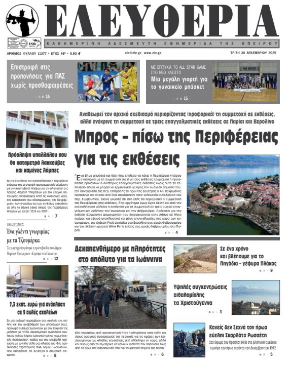 ΑρχικήΕΙΔΗΣΕΙΣΗΠΕΙΡΟΣ ΗΠΕΙΡΟΣ Τα πρωτοσέλιδα των γιαννιώτικων εφημερίδων 30.12.2025 0 FacebookTwitterWhatsAppEmailΤυπώνωViber Διαβάστε στα πρωτοσέλιδα των γιαννιώτικων εφημερίδων Τρίτη 30-12-2025 TagsΓΙΑΝΝΙΩΤΙΚΕΣ ΕΦΗΜΕΡΙΔΕΣΠΡΩΤΟΣΕΛΙΔΑ FacebookTwitterWhatsAppEmailΤυπώνωViber Προηγούμενο άρθροΕντοπίστηκε σορός γυναίκας μετά από προσάραξη λέμβου μεταναστών στη Σάμο Επόμενο άρθροΕπιστροφή στις προπονήσεις χωρίς αλλαγές ΣΧΕΤΙΚΑ ΑΡΘΡΑ Τα πρωτοσέλιδα των γιαννιώτικων εφημερίδων TOP STORIES 11.01.2026 Τα πρωτοσέλιδα των γιαννιώτικων εφημερίδων ΗΠΕΙΡΟΣ 09.01.2026 Τα πρωτοσέλιδα των γιαννιώτικων εφημερίδων ΗΠΕΙΡΟΣ 08.01.2026 Τα πρωτοσέλιδα των γιαννιώτικων εφημερίδων ΗΠΕΙΡΟΣ 06.01.2026 Τα πρωτοσέλιδα των γιαννιώτικων εφημερίδων ΗΠΕΙΡΟΣ 01.01.2026 Τα πρωτοσέλιδα των γιαννιώτικων εφημερίδων ΗΠΕΙΡΟΣ 31.12.2025 ΣΤΗΝ ΙΔΙΑ ΚΑΤΗΓΟΡΙΑ Σύλληψη αλλοδαπού καταζητούμενου στην Κακαβιά ΗΠΕΙΡΟΣ 11.01.2026 Τα πρωτοσέλιδα των γιαννιώτικων εφημερίδων TOP STORIES 11.01.2026 «Απαγορευτικό» στην Εγνατία, πρόστιμα στην παλιά εθνική! ΗΠΕΙΡΟΣ 11.01.2026 ΣΠ. ΚΥΡΙΑΚΗΣ -Συνάντηση συνεργασίας για την αναπτυξιακή πορεία της Πρέβεζας ΗΠΕΙΡΟΣ 11.01.2026 Ο Καχριμάνης και το αγαπημένο (του) διοικητικό… σπορ ΗΠΕΙΡΟΣ 09.01.2026 Κεφάλα: Παραμένει σε λειτουργία το φυλάκιο στις Δρυμάδες Πωγωνίου ΗΠΕΙΡΟΣ 09.01.2026 ΜΗ ΧΑΣΕΤΕ Τα πρωτοσέλιδα των γιαννιώτικων εφημερίδων «Απαγορευτικό» στην Εγνατία, πρόστιμα στην παλιά εθνική! Κεφάλα: Παραμένει σε λειτουργία το φυλάκιο στις Δρυμάδες Πωγωνίου Αυτονόητοι προβληματισμοί, απαιτούν απαντήσεις e-ΕΦΚΑ: Οι ημερομηνίες καταβολής των συντάξεων Φεβρουαρίου ΔΗΜΟΦΙΛΗ «Απαγορευτικό» στην Εγνατία, πρόστιμα στην παλιά εθνική! Ψάχνει μία νέα αρχή ο ΠΑΣ Τα του Καίσαρος… ΣΠ. ΚΥΡΙΑΚΗΣ -Συνάντηση συνεργασίας για την αναπτυξιακή πορεία της Πρέβεζας Μ. ΘΕΜΙΣΤΟΚΛΕΟΥΣ -Στόχος η ένταξη των νοσηλευτών στα βαρέα και ανθυγιεινά μέσα στους επόμενους μήνες