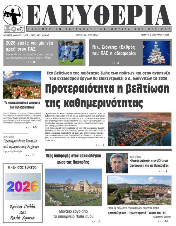 ΑρχικήΕΙΔΗΣΕΙΣΗΠΕΙΡΟΣ ΗΠΕΙΡΟΣ Τα πρωτοσέλιδα των γιαννιώτικων εφημερίδων 01.01.2026 0 FacebookTwitterWhatsAppEmailΤυπώνωViber Διαβάστε στα πρωτοσέλιδα των γιαννιώτικων εφημερίδων Πέμπτη 1-1-2026 TagsΓΙΑΝΝΙΩΤΙΚΕΣ ΕΦΗΜΕΡΙΔΕΣΠΡΩΤΟΣΕΛΙΔΑ FacebookTwitterWhatsAppEmailΤυπώνωViber Προηγούμενο άρθροΕΓΝΑΤΙΑ ΟΔΟΣ -Σε ισχύ οι εξαιρέσεις για τους μόνιμους κατοίκουςΕπόμενο άρθρο«Έφυγε» από τη ζωή ο Άλκης Χήτος ΣΧΕΤΙΚΑ ΑΡΘΡΑ Τα πρωτοσέλιδα των γιαννιώτικων εφημερίδων TOP STORIES 11.01.2026 Τα πρωτοσέλιδα των γιαννιώτικων εφημερίδων ΗΠΕΙΡΟΣ 09.01.2026 Τα πρωτοσέλιδα των γιαννιώτικων εφημερίδων ΗΠΕΙΡΟΣ 08.01.2026 Τα πρωτοσέλιδα των γιαννιώτικων εφημερίδων ΗΠΕΙΡΟΣ 06.01.2026 Τα πρωτοσέλιδα των γιαννιώτικων εφημερίδων ΗΠΕΙΡΟΣ 31.12.2025 Τα πρωτοσέλιδα των γιαννιώτικων εφημερίδων ΗΠΕΙΡΟΣ 30.12.2025 ΣΤΗΝ ΙΔΙΑ ΚΑΤΗΓΟΡΙΑ Σύλληψη αλλοδαπού καταζητούμενου στην Κακαβιά ΗΠΕΙΡΟΣ 11.01.2026 Τα πρωτοσέλιδα των γιαννιώτικων εφημερίδων TOP STORIES 11.01.2026 «Απαγορευτικό» στην Εγνατία, πρόστιμα στην παλιά εθνική! ΗΠΕΙΡΟΣ 11.01.2026 ΣΠ. ΚΥΡΙΑΚΗΣ -Συνάντηση συνεργασίας για την αναπτυξιακή πορεία της Πρέβεζας ΗΠΕΙΡΟΣ 11.01.2026 Ο Καχριμάνης και το αγαπημένο (του) διοικητικό… σπορ ΗΠΕΙΡΟΣ 09.01.2026 Κεφάλα: Παραμένει σε λειτουργία το φυλάκιο στις Δρυμάδες Πωγωνίου ΗΠΕΙΡΟΣ 09.01.2026 ΜΗ ΧΑΣΕΤΕ Τα πρωτοσέλιδα των γιαννιώτικων εφημερίδων «Απαγορευτικό» στην Εγνατία, πρόστιμα στην παλιά εθνική! Κεφάλα: Παραμένει σε λειτουργία το φυλάκιο στις Δρυμάδες Πωγωνίου Αυτονόητοι προβληματισμοί, απαιτούν απαντήσεις e-ΕΦΚΑ: Οι ημερομηνίες καταβολής των συντάξεων Φεβρουαρίου ΔΗΜΟΦΙΛΗ Μ. ΘΕΜΙΣΤΟΚΛΕΟΥΣ -Στόχος η ένταξη των νοσηλευτών στα βαρέα και ανθυγιεινά μέσα στους επόμενους μήνες ΣΠ. ΚΥΡΙΑΚΗΣ -Συνάντηση συνεργασίας για την αναπτυξιακή πορεία της Πρέβεζας Σύλληψη αλλοδαπού καταζητούμενου στην Κακαβιά Τα πρωτοσέλιδα των γιαννιώτικων εφημερίδων Τα του Καίσαρος…
