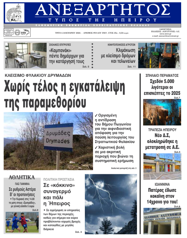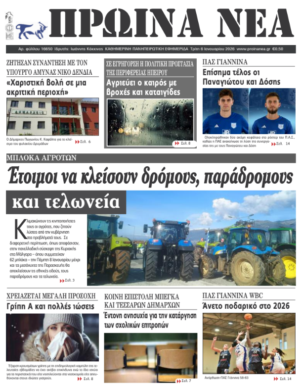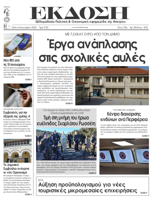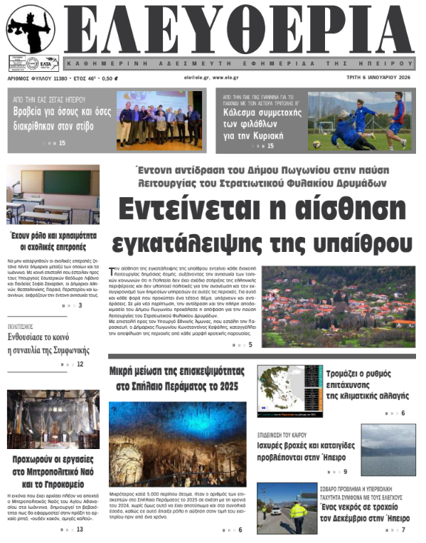 ΑρχικήΕΙΔΗΣΕΙΣΗΠΕΙΡΟΣ ΗΠΕΙΡΟΣ Τα πρωτοσέλιδα των γιαννιώτικων εφημερίδων 06.01.2026 0 FacebookTwitterWhatsAppEmailΤυπώνωViber Διαβάστε στα πρωτοσέλιδα των γιαννιώτικων εφημερίδων Τρίτη 6 Ιανουαρίου 2026 TagsΓΙΑΝΝΙΩΤΙΚΕΣ ΕΦΗΜΕΡΙΔΕΣΠΡΩΤΟΣΕΛΙΔΑ FacebookTwitterWhatsAppEmailΤυπώνωViber Προηγούμενο άρθροΜεγάλη συμμετοχή στον Αγιασμό των Υδάτων στη λίμνη ΠαμβώτιδαΕπόμενο άρθροΤι γιορτάζουμε τα Θεοφάνεια –Γιατί λέγονται εορτή των Φώτων ΣΧΕΤΙΚΑ ΑΡΘΡΑ Τα πρωτοσέλιδα των γιαννιώτικων εφημερίδων TOP STORIES 13.01.2026 Τα πρωτοσέλιδα των γιαννιώτικων εφημερίδων ΗΠΕΙΡΟΣ 11.01.2026 Τα πρωτοσέλιδα των γιαννιώτικων εφημερίδων ΗΠΕΙΡΟΣ 09.01.2026 Τα πρωτοσέλιδα των γιαννιώτικων εφημερίδων ΗΠΕΙΡΟΣ 08.01.2026 Τα πρωτοσέλιδα των γιαννιώτικων εφημερίδων ΗΠΕΙΡΟΣ 01.01.2026 Τα πρωτοσέλιδα των γιαννιώτικων εφημερίδων ΗΠΕΙΡΟΣ 31.12.2025 ΣΤΗΝ ΙΔΙΑ ΚΑΤΗΓΟΡΙΑ Με λαμπρότητα εορτάστηκε η μνήμη του Αγίου Ιερεμία στη Ζίτσα ΗΠΕΙΡΟΣ 13.01.2026 Γεωργόπουλος για Περιφέρεια Ηπείρου: «Αναγκαία αλλαγή ηγεσίας και διαφάνειας» ΗΠΕΙΡΟΣ 13.01.2026 Στην Κομισιόν οι διακοπές ρεύματος στην Ήπειρο ΗΠΕΙΡΟΣ 13.01.2026 Αντιδράσεις για τη συμφωνία Ε.Ε. – Mercosur και επιπτώσεις στον πρωτογενή τομέα της Ηπείρου ΗΠΕΙΡΟΣ 13.01.2026 Άμεση σύλληψη για κλοπή τσάντας από Ι.Χ. ΗΠΕΙΡΟΣ 13.01.2026 Συνελήφθη φυγόποινος στην Κακαβιά ΗΠΕΙΡΟΣ 13.01.2026 ΜΗ ΧΑΣΕΤΕ Το σχέδιο του Δήμου Ιωαννιτών για την αντιμετώπιση του κυκλοφοριακού προβλήματος Περιβαλλοντική καταστροφή στο Μονολίθι Πλημμύρισε ο χώρος πλύσης των απορριμματοφόρων του Δήμου «Μυρίζει συγκάλυψη ευθυνών» Δοκιμάζονται οι αντοχές των επιχειρήσεων ΔΗΜΟΦΙΛΗ Συνεχίζεται η αιματηρή καταστολή στο Ιράν – Αυξάνονται οι νεκροί, καταδικάζει ο ΟΗΕ Γεωργόπουλος για Περιφέρεια Ηπείρου: «Αναγκαία αλλαγή ηγεσίας και διαφάνειας» Το σχέδιο του Δήμου Ιωαννιτών για την αντιμετώπιση του κυκλοφοριακού προβλήματος Παγετός «παγώνει» τη λειτουργία αεροδρομίων στην Κεντρική Ευρώπη Τα του Καίσαρος…