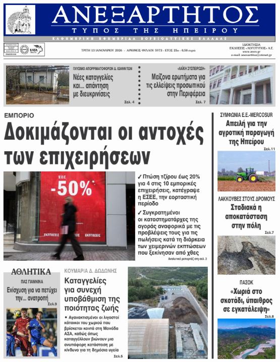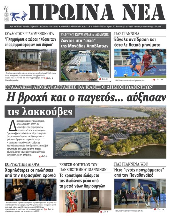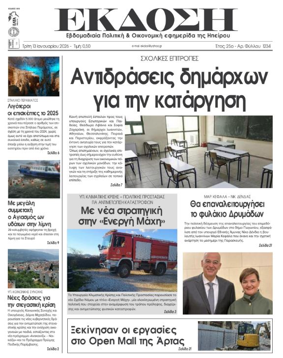 ΑρχικήTOP STORIES TOP STORIESΗΠΕΙΡΟΣ Τα πρωτοσέλιδα των γιαννιώτικων εφημερίδων 13.01.2026 0 FacebookTwitterWhatsAppEmailΤυπώνωViber Διαβάστε στα πρωτοσέλιδα των γιαννιώτικων εφημερίδων Τρίτη 13-1-2026 TagsΓΙΑΝΝΙΩΤΙΚΕΣ ΕΦΗΜΕΡΙΔΕΣΠΡΩΤΟΣΕΛΙΔΑ FacebookTwitterWhatsAppEmailΤυπώνωViber Προηγούμενο άρθροΚ. ΚΥΡΑΝΑΚΗΣ – Το 2025 είχαμε τη μεγαλύτερη μείωση θανατηφόρων τροχαίων στην ιστορία της χώραςΕπόμενο άρθροΗ βροχή και ο παγετός… αύξησαν τις λακκούβες ΣΧΕΤΙΚΑ ΑΡΘΡΑ Τα πρωτοσέλιδα των γιαννιώτικων εφημερίδων ΗΠΕΙΡΟΣ 11.01.2026 Τα πρωτοσέλιδα των γιαννιώτικων εφημερίδων ΗΠΕΙΡΟΣ 09.01.2026 Τα πρωτοσέλιδα των γιαννιώτικων εφημερίδων ΗΠΕΙΡΟΣ 08.01.2026 Τα πρωτοσέλιδα των γιαννιώτικων εφημερίδων ΗΠΕΙΡΟΣ 06.01.2026 Τα πρωτοσέλιδα των γιαννιώτικων εφημερίδων ΗΠΕΙΡΟΣ 01.01.2026 Τα πρωτοσέλιδα των γιαννιώτικων εφημερίδων ΗΠΕΙΡΟΣ 31.12.2025 ΣΤΗΝ ΙΔΙΑ ΚΑΤΗΓΟΡΙΑ Με λαμπρότητα εορτάστηκε η μνήμη του Αγίου Ιερεμία στη Ζίτσα ΗΠΕΙΡΟΣ 13.01.2026 Γεωργόπουλος για Περιφέρεια Ηπείρου: «Αναγκαία αλλαγή ηγεσίας και διαφάνειας» ΗΠΕΙΡΟΣ 13.01.2026 Στην Κομισιόν οι διακοπές ρεύματος στην Ήπειρο ΗΠΕΙΡΟΣ 13.01.2026 Αντιδράσεις για τη συμφωνία Ε.Ε. – Mercosur και επιπτώσεις στον πρωτογενή τομέα της Ηπείρου ΗΠΕΙΡΟΣ 13.01.2026 Άμεση σύλληψη για κλοπή τσάντας από Ι.Χ. ΗΠΕΙΡΟΣ 13.01.2026 Συνελήφθη φυγόποινος στην Κακαβιά ΗΠΕΙΡΟΣ 13.01.2026 ΜΗ ΧΑΣΕΤΕ Το σχέδιο του Δήμου Ιωαννιτών για την αντιμετώπιση του κυκλοφοριακού προβλήματος Περιβαλλοντική καταστροφή στο Μονολίθι Πλημμύρισε ο χώρος πλύσης των απορριμματοφόρων του Δήμου «Μυρίζει συγκάλυψη ευθυνών» Δοκιμάζονται οι αντοχές των επιχειρήσεων ΔΗΜΟΦΙΛΗ Αντιδράσεις για τη συμφωνία Ε.Ε. – Mercosur και επιπτώσεις στον πρωτογενή τομέα της Ηπείρου Τζούφη: Υποστελέχωση και εξουθένωση στην Πνευμονολογική Κλινική του Νοσοκομείου Άρτας Το σχέδιο του Δήμου Ιωαννιτών για την αντιμετώπιση του κυκλοφοριακού προβλήματος Η βροχή και ο παγετός… αύξησαν τις λακκούβες Τα του Καίσαρος…