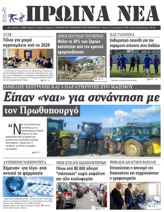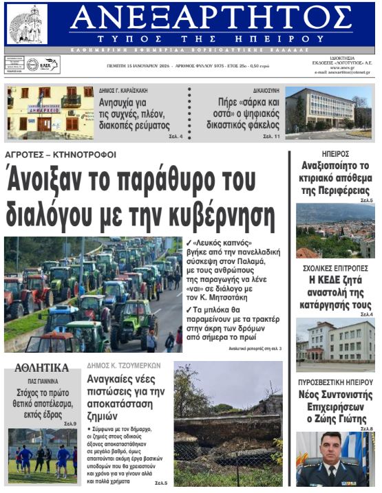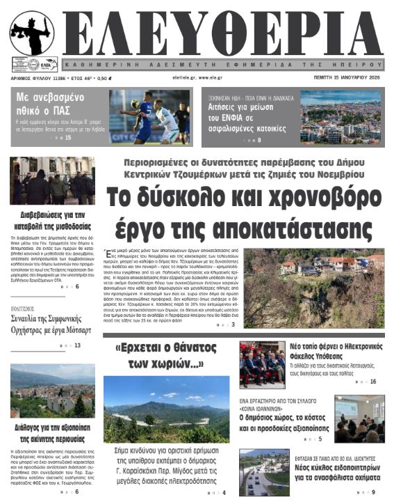 ΑρχικήTOP STORIES TOP STORIESΗΠΕΙΡΟΣ Τα πρωτοσέλιδα των γιαννιώτικων εφημερίδων 15.01.2026 0 FacebookTwitterWhatsAppEmailΤυπώνωViber Διαβάστε στα πρωτοσέλιδα των γιαννιώτικων εφημερίδων Πέμπτη 15-1-2026 TagsΓΙΑΝΝΙΩΤΙΚΕΣ ΕΦΗΜΕΡΙΔΕΣΠΡΩΤΟΣΕΛΙΔΑ FacebookTwitterWhatsAppEmailΤυπώνωViber Προηγούμενο άρθροΣ. ΦΑΜΕΛΛΟΣ -«Απαιτείται πολιτική αλλαγή για να έχουμε ελληνική βιώσιμη επιχειρηματικότητα»Επόμενο άρθροΓυμνή Αλήθεια ΣΧΕΤΙΚΑ ΑΡΘΡΑ Τα πρωτοσέλιδα των γιαννιώτικων εφημερίδων ΗΠΕΙΡΟΣ 14.01.2026 Τα πρωτοσέλιδα των γιαννιώτικων εφημερίδων ΗΠΕΙΡΟΣ 13.01.2026 Τα πρωτοσέλιδα των γιαννιώτικων εφημερίδων ΗΠΕΙΡΟΣ 11.01.2026 Τα πρωτοσέλιδα των γιαννιώτικων εφημερίδων ΗΠΕΙΡΟΣ 09.01.2026 Τα πρωτοσέλιδα των γιαννιώτικων εφημερίδων ΗΠΕΙΡΟΣ 08.01.2026 Τα πρωτοσέλιδα των γιαννιώτικων εφημερίδων ΗΠΕΙΡΟΣ 06.01.2026 ΣΤΗΝ ΙΔΙΑ ΚΑΤΗΓΟΡΙΑ Το δύσκολο και χρονοβόρο έργο της αποκατάστασης ΗΠΕΙΡΟΣ 15.01.2026 «Έρχεται ο θάνατος των χωριών…» ΗΠΕΙΡΟΣ 15.01.2026 Διάλογος για την αξιοποίηση της ακίνητης περιουσίας ΗΠΕΙΡΟΣ 15.01.2026 Ξέμειναν -για λίγο- από αντιικά τα φαρμακεία ΗΠΕΙΡΟΣ 15.01.2026 Σε πλήρη λειτουργία το σύστημα «ΙΡΙΔΑ» στην Αποκεντρωμένη Διοίκηση Ηπείρου – Δυτ. Μακεδονίας ΗΠΕΙΡΟΣ 14.01.2026 Συνάντηση για τα προβλήματα και τις προτεραιότητες του Δήμου Βορ. Τζουμέρκων ΗΠΕΙΡΟΣ 14.01.2026 ΜΗ ΧΑΣΕΤΕ Άνοιξαν το παράθυρο του διαλόγου με την κυβέρνηση Το δύσκολο και χρονοβόρο έργο της αποκατάστασης «Έρχεται ο θάνατος των χωριών…» Διάλογος για την αξιοποίηση της ακίνητης περιουσίας Ξέμειναν -για λίγο- από αντιικά τα φαρμακεία ΔΗΜΟΦΙΛΗ «Έρχεται ο θάνατος των χωριών…» Το δύσκολο και χρονοβόρο έργο της αποκατάστασης Ξέμειναν -για λίγο- από αντιικά τα φαρμακεία Τα του Καίσαρος… Διάλογος για την αξιοποίηση της ακίνητης περιουσίας