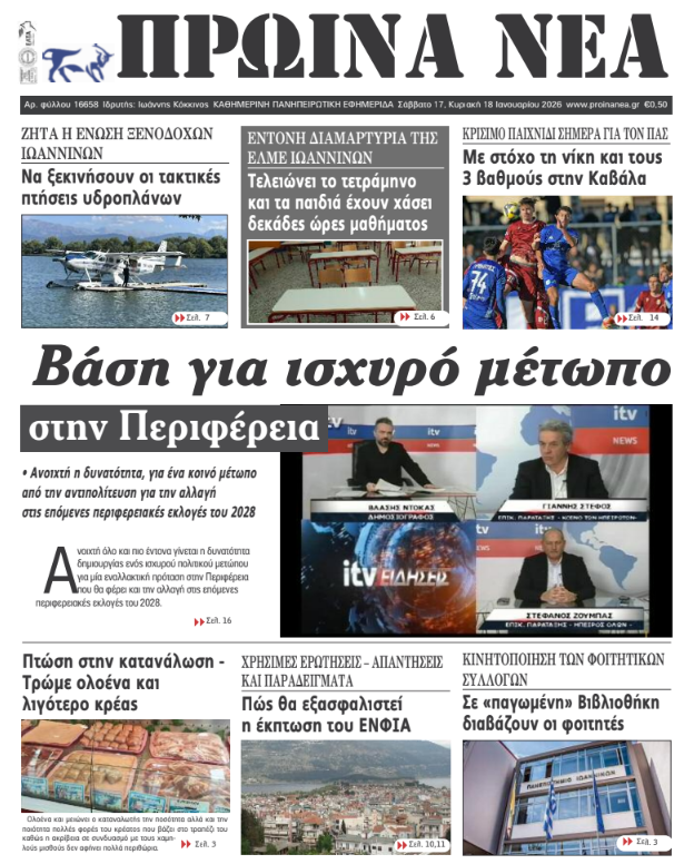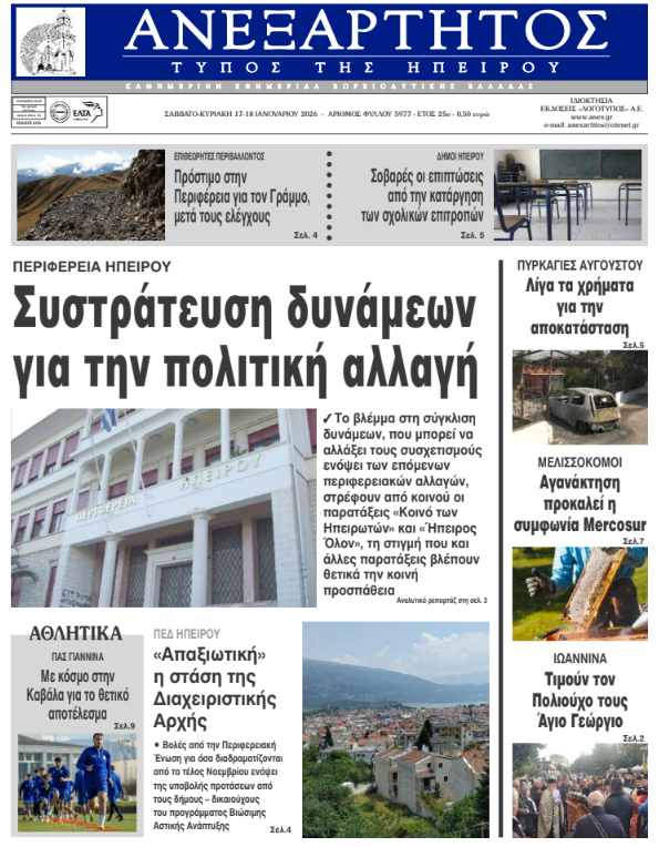 ΑρχικήTOP STORIES TOP STORIESΗΠΕΙΡΟΣ Τα πρωτοσέλιδα των γιαννιώτικων εφημερίδων 17.01.2026 0 FacebookTwitterWhatsAppEmailΤυπώνωViber Διαβάστε στα πρωτοσέλιδα των γιαννιώτικων εφημερίδων 17-18-1-2026 TagsΓΙΑΝΝΙΩΤΙΚΕΣ ΕΦΗΜΕΡΙΔΕΣΠΡΩΤΟΣΕΛΙΔΑ FacebookTwitterWhatsAppEmailΤυπώνωViber Προηγούμενο άρθροΠίεση, άγχος και πίστη για τη νίκη στον ΠΑΣΕπόμενο άρθροΤα του Καίσαρος… ΣΧΕΤΙΚΑ ΑΡΘΡΑ Τα πρωτοσέλιδα των γιαννιώτικων εφημερίδων ΗΠΕΙΡΟΣ 16.01.2026 Τα πρωτοσέλιδα των γιαννιώτικων εφημερίδων ΗΠΕΙΡΟΣ 15.01.2026 Τα πρωτοσέλιδα των γιαννιώτικων εφημερίδων ΗΠΕΙΡΟΣ 14.01.2026 Τα πρωτοσέλιδα των γιαννιώτικων εφημερίδων ΗΠΕΙΡΟΣ 13.01.2026 Τα πρωτοσέλιδα των γιαννιώτικων εφημερίδων ΗΠΕΙΡΟΣ 11.01.2026 Τα πρωτοσέλιδα των γιαννιώτικων εφημερίδων ΗΠΕΙΡΟΣ 09.01.2026 ΣΤΗΝ ΙΔΙΑ ΚΑΤΗΓΟΡΙΑ Περιφερειακό μέτωπο για την πολιτική αλλαγή ΗΠΕΙΡΟΣ 17.01.2026 «Απαξιωτική η στάση της Διαχειριστικής Αρχής» ΗΠΕΙΡΟΣ 17.01.2026 Υπαρκτός ο κίνδυνος εξαφάνισης της μελισσοκομίας ΗΠΕΙΡΟΣ 17.01.2026 Να συμμορφωθεί η Περιφέρεια με το πόρισμα των Επιθεωρητών ΗΠΕΙΡΟΣ 17.01.2026 Επιμνημόσυνη δέηση στο παρεκκλήσι του Αγίου Γεωργίου TOP STORIES 16.01.2026 Φτάνει πια κύριε Καχριμάνη! ΗΠΕΙΡΟΣ 16.01.2026 ΜΗ ΧΑΣΕΤΕ Περιφερειακό μέτωπο για την πολιτική αλλαγή «Απαξιωτική η στάση της Διαχειριστικής Αρχής» Υπαρκτός ο κίνδυνος εξαφάνισης της μελισσοκομίας Να συμμορφωθεί η Περιφέρεια με το πόρισμα των Επιθεωρητών Επιμνημόσυνη δέηση στο παρεκκλήσι του Αγίου Γεωργίου ΔΗΜΟΦΙΛΗ Υπαρκτός ο κίνδυνος εξαφάνισης της μελισσοκομίας Περιφερειακό μέτωπο για την πολιτική αλλαγή «Απαξιωτική η στάση της Διαχειριστικής Αρχής» Τα του Καίσαρος… Να συμμορφωθεί η Περιφέρεια με το πόρισμα των Επιθεωρητών
