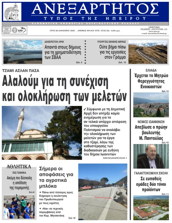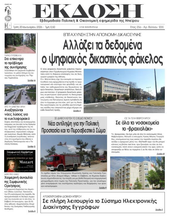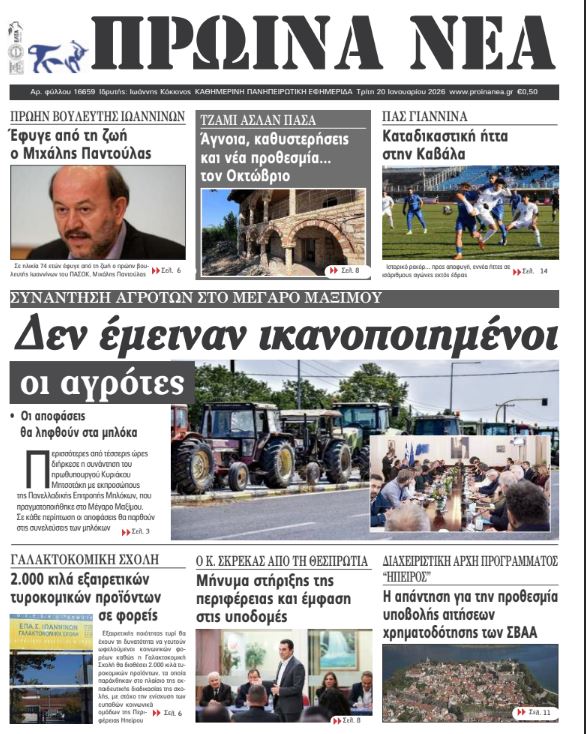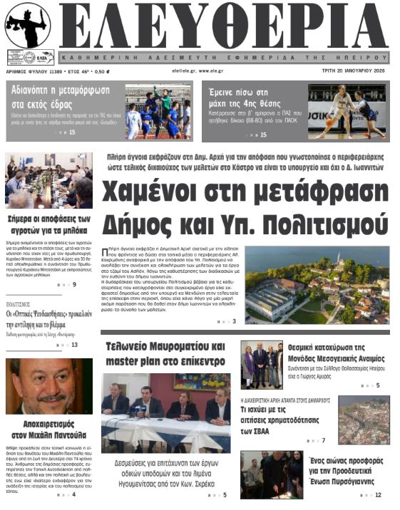 ΑρχικήTOP STORIES TOP STORIESΗΠΕΙΡΟΣ Τα πρωτοσέλιδα των γιαννιώτικων εφημερίδων 20.01.2026 0 FacebookTwitterWhatsAppEmailΤυπώνωViber Διαβάστε στα πρωτοσέλιδα των γιαννιώτικων εφημερίδων Τρίτη 20-1-2026 TagsΓΙΑΝΝΙΩΤΙΚΕΣ ΕΦΗΜΕΡΙΔΕΣΠΡΩΤΟΣΕΛΙΔΑ FacebookTwitterWhatsAppEmailΤυπώνωViber Προηγούμενο άρθροΤελωνείο Μαυροματίου και master plan στο επίκεντροΕπόμενο άρθροΧαμένοι στη μετάφραση Δήμος και Υπ. Πολιτισμού ΣΧΕΤΙΚΑ ΑΡΘΡΑ Τα πρωτοσέλιδα των γιαννιώτικων εφημερίδων ΗΠΕΙΡΟΣ 17.01.2026 Τα πρωτοσέλιδα των γιαννιώτικων εφημερίδων ΗΠΕΙΡΟΣ 16.01.2026 Τα πρωτοσέλιδα των γιαννιώτικων εφημερίδων ΗΠΕΙΡΟΣ 15.01.2026 Τα πρωτοσέλιδα των γιαννιώτικων εφημερίδων ΗΠΕΙΡΟΣ 14.01.2026 Τα πρωτοσέλιδα των γιαννιώτικων εφημερίδων ΗΠΕΙΡΟΣ 13.01.2026 Τα πρωτοσέλιδα των γιαννιώτικων εφημερίδων ΗΠΕΙΡΟΣ 11.01.2026 ΣΤΗΝ ΙΔΙΑ ΚΑΤΗΓΟΡΙΑ Στόχος να συνεχιστεί η λειτουργία του Στρατοδικείου Ιωαννίνων ΗΠΕΙΡΟΣ 20.01.2026 Απινιδωτές σε κτίρια της Αποκεντρωμένης Διοίκησης ΗΠΕΙΡΟΣ 20.01.2026 Ο αέρας τα σάρωσε όλα στο παραλίμνιο ΗΠΕΙΡΟΣ 20.01.2026 Χαμένοι στη μετάφραση Δήμος και Υπ. Πολιτισμού ΗΠΕΙΡΟΣ 20.01.2026 Τελωνείο Μαυροματίου και master plan στο επίκεντρο ΗΠΕΙΡΟΣ 20.01.2026 Να ξεκινήσουν οι τακτικές πτήσεις υδροπλάνων ζητά η Ένωση Ξενοδόχων ΗΠΕΙΡΟΣ 19.01.2026 ΜΗ ΧΑΣΕΤΕ Ο αέρας τα σάρωσε όλα στο παραλίμνιο Σήμερα οι αποφάσεις για τα αγροτικά μπλόκα Χαμένοι στη μετάφραση Δήμος και Υπ. Πολιτισμού Τελωνείο Μαυροματίου και master plan στο επίκεντρο Απεβίωσε ο πρώην βουλευτής Ιωαννίνων Μιχάλης Παντούλας ΔΗΜΟΦΙΛΗ Τα του Καίσαρος… Σήμερα οι αποφάσεις για τα αγροτικά μπλόκα Άνοιξε η πλατφόρμα Ε9 για το 2027 – Τι πρέπει να προσέξουν οι φορολογούμενοι Πρέβεζα: Πανελλήνιο Κύπελλο Ξίφους Μονομαχίας με 200 αθλητές Τελωνείο Μαυροματίου και master plan στο επίκεντρο