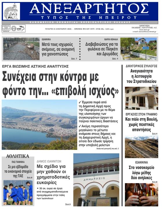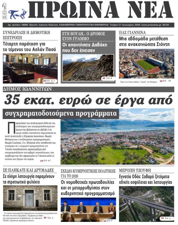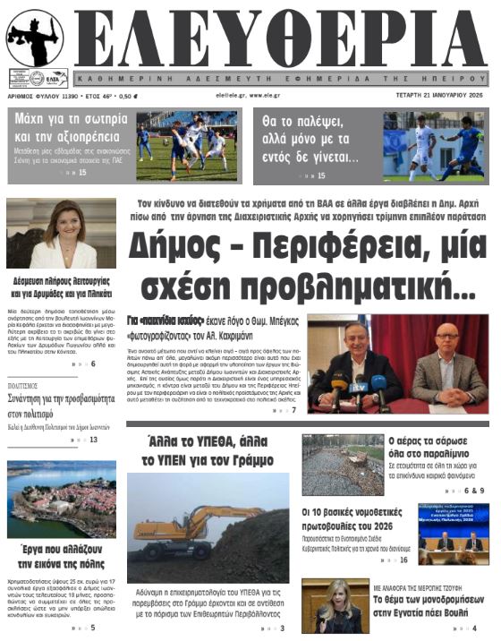 Διαβάστε στα πρωτοσέλιδα των γιαννιώτικων εφημερίδων Τετάρτη 21-1-2026