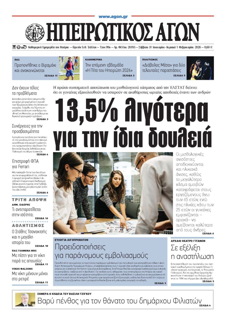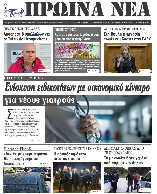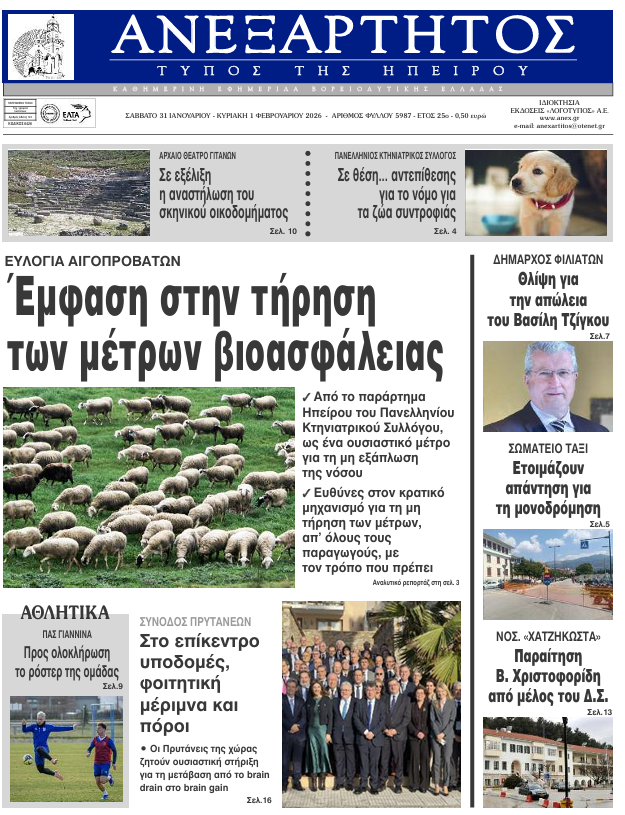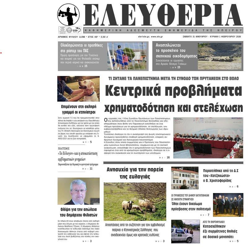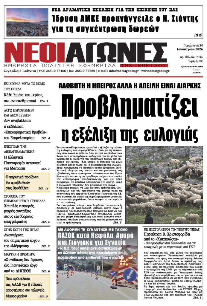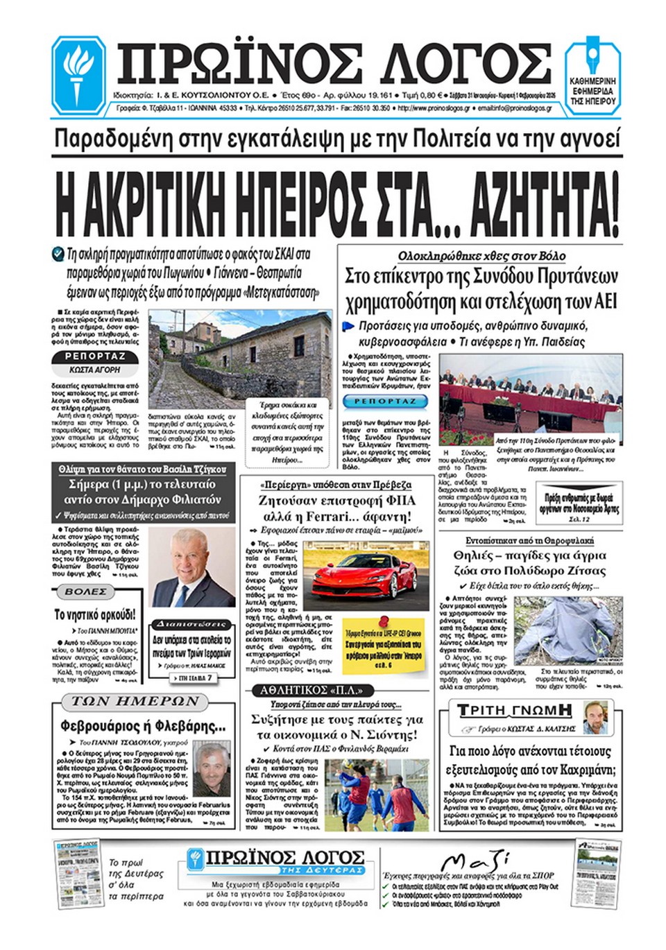 ΑρχικήTOP STORIES TOP STORIESΗΠΕΙΡΟΣ Τα πρωτοσέλιδα των γιαννιώτικων εφημερίδων 31.01.2026 0 FacebookTwitterWhatsAppEmailΤυπώνωViber Διαβάστε στα πρωτοσέλιδα των γιαννιώτικων εφημερίδων 31 Ιανουαρίου-1 Φεβρουαρίου TagsΓΙΑΝΝΙΩΤΙΚΕΣ ΕΦΗΜΕΡΙΔΕΣΠΡΩΤΟΣΕΛΙΔΑ FacebookTwitterWhatsAppEmailΤυπώνωViber Προηγούμενο άρθροΣτο δεύτερο χαμηλότερο σημείο στην ιστορία της χώρας η ανεργία ΣΧΕΤΙΚΑ ΑΡΘΡΑ Τα πρωτοσέλιδα των γιαννιώτικων εφημερίδων ΗΠΕΙΡΟΣ 30.01.2026 Τα πρωτοσέλιδα των γιαννιώτικων εφημερίδων ΗΠΕΙΡΟΣ 29.01.2026 Τα πρωτοσέλιδα των γιαννιώτικων εφημερίδων ΗΠΕΙΡΟΣ 28.01.2026 Τα πρωτοσέλιδα των γιαννιώτικων εφημερίδων ΗΠΕΙΡΟΣ 27.01.2026 Τα πρωτοσέλιδα των γιαννιώτικων εφημερίδων ΗΠΕΙΡΟΣ 24.01.2026 Τα πρωτοσέλιδα των γιαννιώτικων εφημερίδων ΗΠΕΙΡΟΣ 23.01.2026 ΣΤΗΝ ΙΔΙΑ ΚΑΤΗΓΟΡΙΑ ΔΗΜΟΣ ΖΗΡΟΥ -Οι Δημοτικές Κοινότητες ενσωματώνονται στο σύστημα του Κτηματολογίου ΗΠΕΙΡΟΣ 31.01.2026 ΝΟΣΟΚΟΜΕΙΟ ΧΑΤΖΗΚΩΣΤΑ -Την Τετάρτη τα εγκαίνια της Μονάδας Τεχνητού Νεφρού ΗΠΕΙΡΟΣ 31.01.2026 Κυκλοφοριακές ρυθμίσεις στην οδό Ελ. Βενιζέλου στα Ιωάννινα ΗΠΕΙΡΟΣ 30.01.2026 Δήμος Ζηρού: Απεγκλωβίστηκε οδηγός από λιμνάζοντα ύδατα ΗΠΕΙΡΟΣ 30.01.2026 Συνελήφθη αλλοδαπός στα Ιωάννινα για οπλοκατοχή ΗΠΕΙΡΟΣ 30.01.2026 Συνελήφθη αλλοδαπός διωκόμενος στην Κακαβιά ΗΠΕΙΡΟΣ 30.01.2026 ΜΗ ΧΑΣΕΤΕ Ισχυρή κακοκαιρία από Κυριακή με έντονες βροχές, καταιγίδες και χιόνια Αυξήσεις καθαρών μισθών με τη νέα φορολογική κλίμακα «Βλέπουν» αυξήσεις τιμών και προβλήματα τροφοδοσίας Εκπέμπουν «σήμα κινδύνου» λόγω δημογραφικού Ενεργοποιούνται 20.000 κλειστά ακίνητα ΔΗΜΟΦΙΛΗ ΔΗΜΟΣ ΖΗΡΟΥ -Οι Δημοτικές Κοινότητες ενσωματώνονται στο σύστημα του Κτηματολογίου ΕΓΚΡΙΘΗΚΕ ΑΠΟ ΤΗΝ ΕΠΙΤΡΟΠΗ -Η πρώτη στρατηγική της ΕΕ για τις θεωρήσεις ΝΟΣΟΚΟΜΕΙΟ ΧΑΤΖΗΚΩΣΤΑ -Την Τετάρτη τα εγκαίνια της Μονάδας Τεχνητού Νεφρού Στο δεύτερο χαμηλότερο σημείο στην ιστορία της χώρας η ανεργία