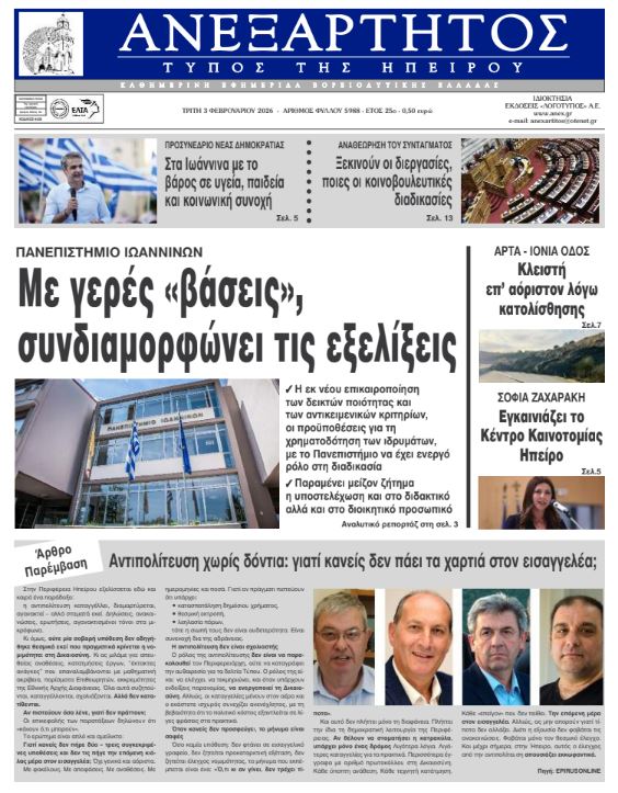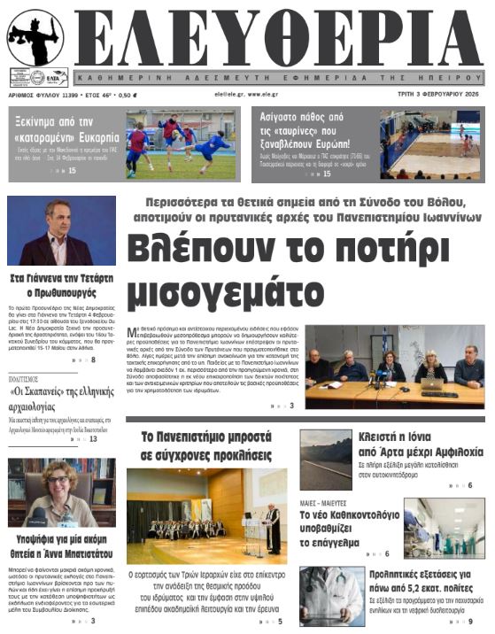 ΑρχικήTOP STORIES TOP STORIESΗΠΕΙΡΟΣ Τα πρωτοσέλιδα των γιαννιώτικων εφημερίδων 03.02.2026 0 FacebookTwitterWhatsAppEmailΤυπώνωViber Διαβάστε στα πρωτοσέλιδα των γιαννιώτικων εφημερίδων Τρίτη 3 Φεβρουαρίου 2026 TagsΓΙΑΝΝΙΩΤΙΚΕΣ ΕΦΗΜΕΡΙΔΕΣΠΡΩΤΟΣΕΛΙΔΑ FacebookTwitterWhatsAppEmailΤυπώνωViber Προηγούμενο άρθροΠροχωρά η μελέτη για τη σύνδεση Ελλάδας- ΑιγύπτουΕπόμενο άρθροΥποψήφια για μία ακόμη θητεία η Άννα Μπατιστάτου ΣΧΕΤΙΚΑ ΑΡΘΡΑ Τα πρωτοσέλιδα των γιαννιώτικων εφημερίδων ΗΠΕΙΡΟΣ 31.01.2026 Τα πρωτοσέλιδα των γιαννιώτικων εφημερίδων ΗΠΕΙΡΟΣ 30.01.2026 Τα πρωτοσέλιδα των γιαννιώτικων εφημερίδων ΗΠΕΙΡΟΣ 29.01.2026 Τα πρωτοσέλιδα των γιαννιώτικων εφημερίδων ΗΠΕΙΡΟΣ 28.01.2026 Τα πρωτοσέλιδα των γιαννιώτικων εφημερίδων ΗΠΕΙΡΟΣ 27.01.2026 Τα πρωτοσέλιδα των γιαννιώτικων εφημερίδων ΗΠΕΙΡΟΣ 24.01.2026 ΣΤΗΝ ΙΔΙΑ ΚΑΤΗΓΟΡΙΑ Όταν ο έλεγχος γίνεται «διαπραγμάτευση» ΗΠΕΙΡΟΣ 03.02.2026 Βλέπουν το ποτήρι μισογεμάτο ΗΠΕΙΡΟΣ 03.02.2026 Υποψήφια για μία ακόμη θητεία η Άννα Μπατιστάτου ΗΠΕΙΡΟΣ 03.02.2026 Προβληματισμός για τις αλλαγές στους ΚΑΔ ΗΠΕΙΡΟΣ 02.02.2026 Άρθρο παρέμβαση – Αντιπολίτευση χωρίς δόντια: γιατί κανείς δεν πάει τα χαρτιά στον εισαγγελέα; ΗΠΕΙΡΟΣ 02.02.2026 Δήμος Αρταίων: Προειδοποίηση για την απόρριψη στάχτης σε κάδους σκουπιδιών ΗΠΕΙΡΟΣ 02.02.2026 ΜΗ ΧΑΣΕΤΕ Όταν ο έλεγχος γίνεται «διαπραγμάτευση» Βλέπουν το ποτήρι μισογεμάτο Υποψήφια για μία ακόμη θητεία η Άννα Μπατιστάτου Άρθρο παρέμβαση – Αντιπολίτευση χωρίς δόντια: γιατί κανείς δεν πάει τα χαρτιά στον εισαγγελέα; Στα Ιωάννινα το προσυνέδριο της ΝΔ με επίκεντρο Υγεία, Παιδεία και Κοινωνική Συνοχή ΔΗΜΟΦΙΛΗ Ξεκινά το Μητρώο Ακινήτων της ΑΑΔΕ με πλήρη απογραφή ιδιοκτησιών Βλέπουν το ποτήρι μισογεμάτο ΠΑΣΟΚ-ΚΙΝΑΛ: Οι Συντονιστές στην Ήπειρο ενόψει Συνεδρίου Υποψήφια για μία ακόμη θητεία η Άννα Μπατιστάτου Όταν ο έλεγχος γίνεται «διαπραγμάτευση»