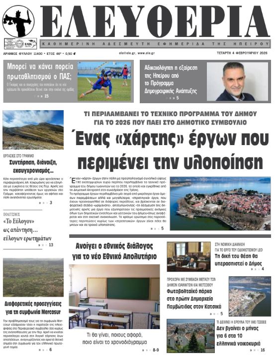 ΑρχικήTOP STORIES TOP STORIESΗΠΕΙΡΟΣ Τα πρωτοσέλιδα των γιαννιώτικων εφημερίδων 04.02.2026 0 FacebookTwitterWhatsAppEmailΤυπώνωViber Διαβάστε στα πρωτοσέλιδα των γιαννιώτικων εφημερίδων Τετάρτη 4 Φεβρουαρίου 2026 TagsΓΙΑΝΝΙΩΤΙΚΕΣ ΕΦΗΜΕΡΙΔΕΣΠΡΩΤΟΣΕΛΙΔΑ FacebookTwitterWhatsAppEmailΤυπώνωViber Προηγούμενο άρθροΗ Πορτογαλία έτοιμη να απαγορεύσει τα social media στους κάτω των 16 ετώνΕπόμενο άρθροΣυντήρηση, διάνοιξη, εκσυγχρονισμός… ΣΧΕΤΙΚΑ ΑΡΘΡΑ Τα πρωτοσέλιδα των γιαννιώτικων εφημερίδων ΗΠΕΙΡΟΣ 03.02.2026 Τα πρωτοσέλιδα των γιαννιώτικων εφημερίδων ΗΠΕΙΡΟΣ 31.01.2026 Τα πρωτοσέλιδα των γιαννιώτικων εφημερίδων ΗΠΕΙΡΟΣ 30.01.2026 Τα πρωτοσέλιδα των γιαννιώτικων εφημερίδων ΗΠΕΙΡΟΣ 29.01.2026 Τα πρωτοσέλιδα των γιαννιώτικων εφημερίδων ΗΠΕΙΡΟΣ 28.01.2026 Τα πρωτοσέλιδα των γιαννιώτικων εφημερίδων ΗΠΕΙΡΟΣ 27.01.2026 ΣΤΗΝ ΙΔΙΑ ΚΑΤΗΓΟΡΙΑ Ουσιαστική παρέμβαση για το κυκλοφοριακό ΗΠΕΙΡΟΣ 04.02.2026 Αυξήθηκαν οι παραβάσεις για μη χρήση κράνους ΗΠΕΙΡΟΣ 04.02.2026 Στο προσκήνιο η αποτελεσματική λειτουργία των Υπηρεσιών ΗΠΕΙΡΟΣ 04.02.2026 Σε μακρά αναμονή η Ιόνια Οδός μετά τη μεγάλη κατολίσθηση ΗΠΕΙΡΟΣ 04.02.2026 Διαφορετικές προσεγγίσεις για τη συμφωνία Mercosur ΗΠΕΙΡΟΣ 04.02.2026 Συντήρηση, διάνοιξη, εκσυγχρονισμός… ΗΠΕΙΡΟΣ 04.02.2026 ΜΗ ΧΑΣΕΤΕ Διαφορετικές προσεγγίσεις για τη συμφωνία Mercosur Συντήρηση, διάνοιξη, εκσυγχρονισμός… Οδοφωτισμός LED – Το έργο παραμένει αναγκαίο και σε πλήρη εκτέλεση Έργα συνολικού ύψους 189,9 εκατ. ευρώ στον Δήμο Ιωαννιτών Σε τροχιά υλοποίησης το Εθνικό Απολυτήριο ΔΗΜΟΦΙΛΗ Ουσιαστική παρέμβαση για το κυκλοφοριακό Στο προσκήνιο η αποτελεσματική λειτουργία των Υπηρεσιών Επιστήμη, θεολογία και τεχνολογία στη διαφύλαξη της πολιτιστικής κληρονομιάς Στοίχημα οι πρώτες νίκες και ανοιχτά όλα τα ενδεχόμενα Σε μακρά αναμονή η Ιόνια Οδός μετά τη μεγάλη κατολίσθηση