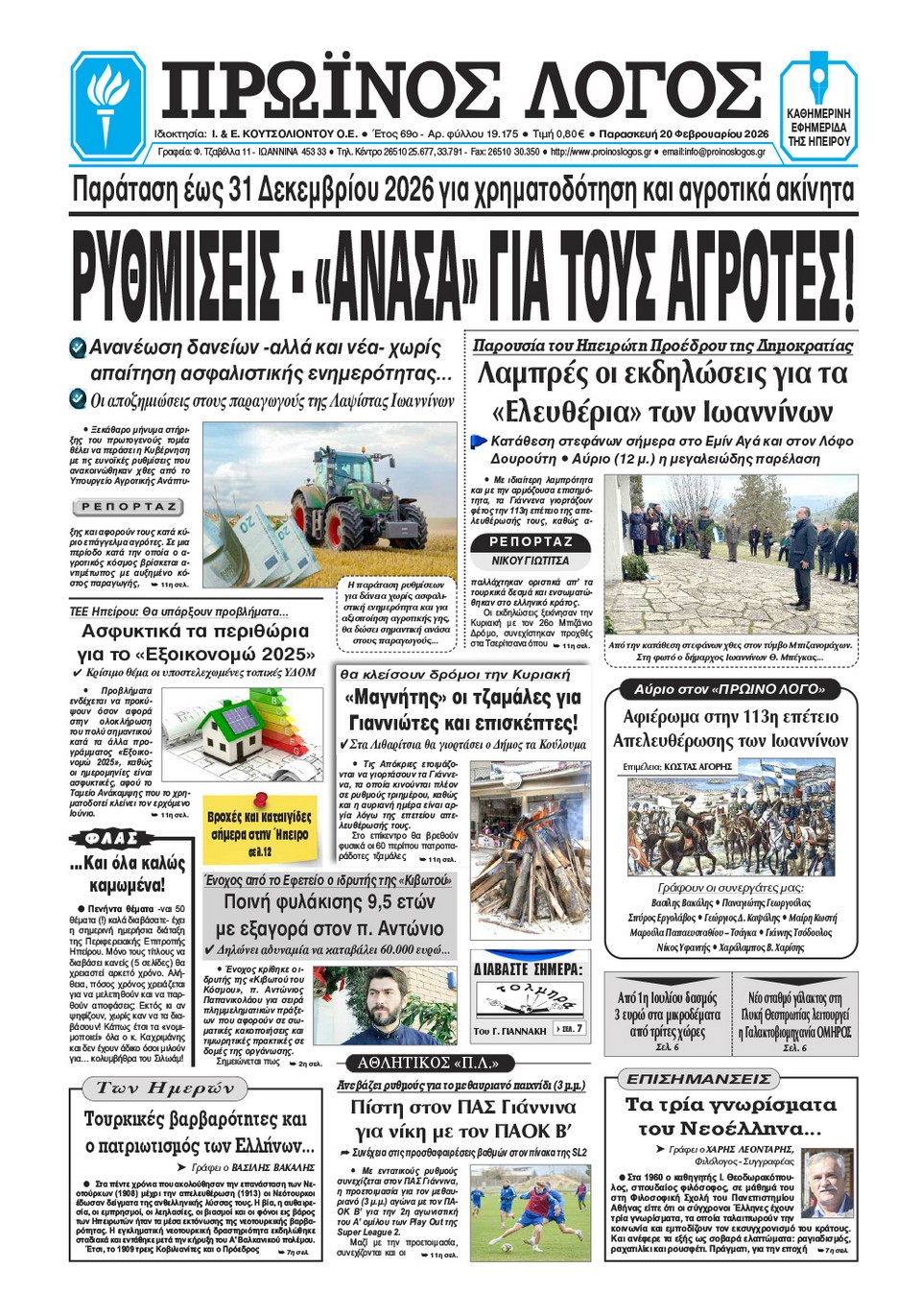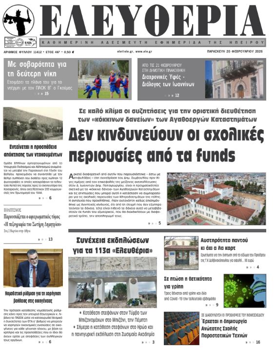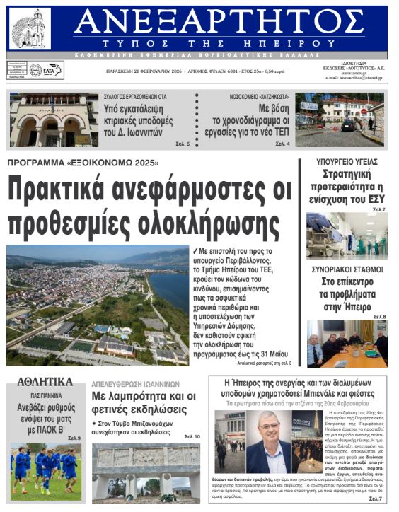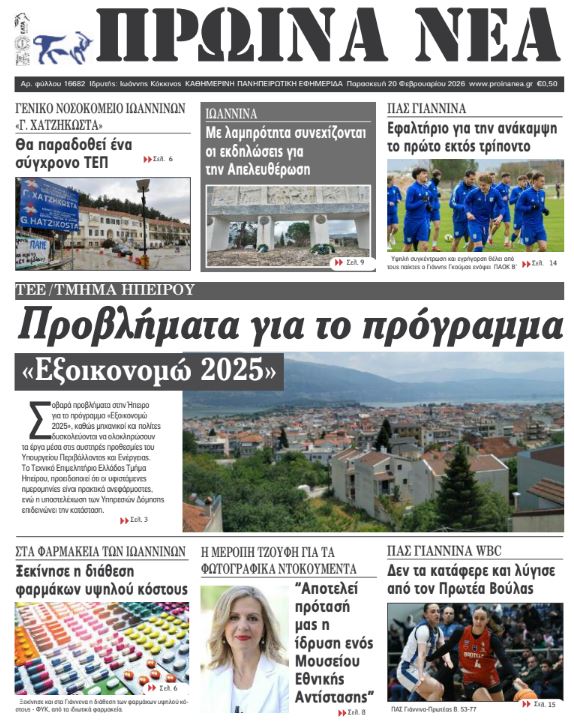 ΑρχικήΕΙΔΗΣΕΙΣΗΠΕΙΡΟΣ ΗΠΕΙΡΟΣ Τα πρωτοσέλιδα των γιαννιώτικων εφημερίδων 20.02.2026 0 FacebookTwitterWhatsAppEmailΤυπώνωViber Διαβάστε στα πρωτοσέλιδα των γιαννιώτικων εφημερίδων Παρασκευή 20-2-2026 TagsΓΙΑΝΝΙΩΤΙΚΕΣ ΕΦΗΜΕΡΙΔΕΣΠΡΩΤΟΣΕΛΙΔΑ FacebookTwitterWhatsAppEmailΤυπώνωViber Προηγούμενο άρθροΑυστηρότητα παντού κι όχι α λα καρτΕπόμενο άρθροΠρακτικά ανεφάρμοστες οι προθεσμίες ολοκλήρωσης ΣΧΕΤΙΚΑ ΑΡΘΡΑ Τα πρωτοσέλιδα των γιαννιώτικων εφημερίδων TOP STORIES 12.03.2026 Τα πρωτοσέλιδα των γιαννιώτικων εφημερίδων ΗΠΕΙΡΟΣ 11.03.2026 Τα πρωτοσέλιδα των γιαννιώτικων εφημερίδων ΗΠΕΙΡΟΣ 10.03.2026 Τα πρωτοσέλιδα των γιαννιώτικων εφημερίδων TOP STORIES 07.03.2026 Τα πρωτοσέλιδα των γιαννιώτικων εφημερίδων ΗΠΕΙΡΟΣ 06.03.2026 Τα πρωτοσέλιδα των γιαννιώτικων εφημερίδων ΗΠΕΙΡΟΣ 05.03.2026 ΣΤΗΝ ΙΔΙΑ ΚΑΤΗΓΟΡΙΑ Θα τραβήξει σε μάκρος η ταλαιπωρία στην Εγνατία ΗΠΕΙΡΟΣ 12.03.2026 Διαμαρτυρία για την καθυστέρηση έργων στο Δημ. Σχολείο Ανατολικής ΗΠΕΙΡΟΣ 12.03.2026 Χάος στο Περ. Συμβούλιο! ΗΠΕΙΡΟΣ 12.03.2026 Ιωάννινα: Συνελήφθη αλλοδαπός για κλοπή κλιματιστικών ΗΠΕΙΡΟΣ 12.03.2026 Άμεση σύλληψη για κλοπή στην Ηγουμενίτσα ΗΠΕΙΡΟΣ 12.03.2026 Άμεση καταγραφή ζημιών και αποζημιώσεις για τους πληγέντες ΗΠΕΙΡΟΣ 12.03.2026 ΜΗ ΧΑΣΕΤΕ Θα τραβήξει σε μάκρος η ταλαιπωρία στην Εγνατία Αυτά είναι τα 61 προϊόντα που επιβάλλεται πλαφόν στα περιθώρια κέρδους Προσοχή σε παραπλανητικά SMS τύπου phishing – Οδηγίες από το Υπουργείο Ψηφιακής Διακυβέρνησης Χάος στο Περ. Συμβούλιο! Άμεση καταγραφή ζημιών και αποζημιώσεις για τους πληγέντες ΔΗΜΟΦΙΛΗ Τραμπ: Οι ΗΠΑ έχουν κέρδος από την αύξηση της τιμής του πετρελαίου Νέα Τεχνολογία στα Slot Machines Βελτιώνει τη Διαφάνεια και την Προστασία των Παικτών σε Περιφερειακό Venue Κομισιόν: Απαγορεύεται η ταφή ανεπεξέργαστων αποβλήτων στη Βλαχέρνα Θεοδωρικάκος: Σκληρό αλλά αναγκαίο το μέτρο του πλαφόν στα κέρδη Υπήρξε ωριμότητα, θα έχουμε και σχέδιο