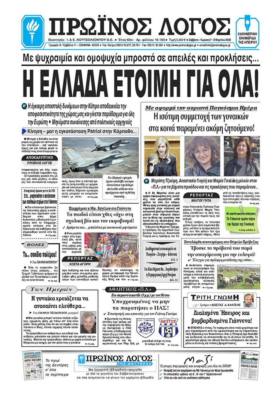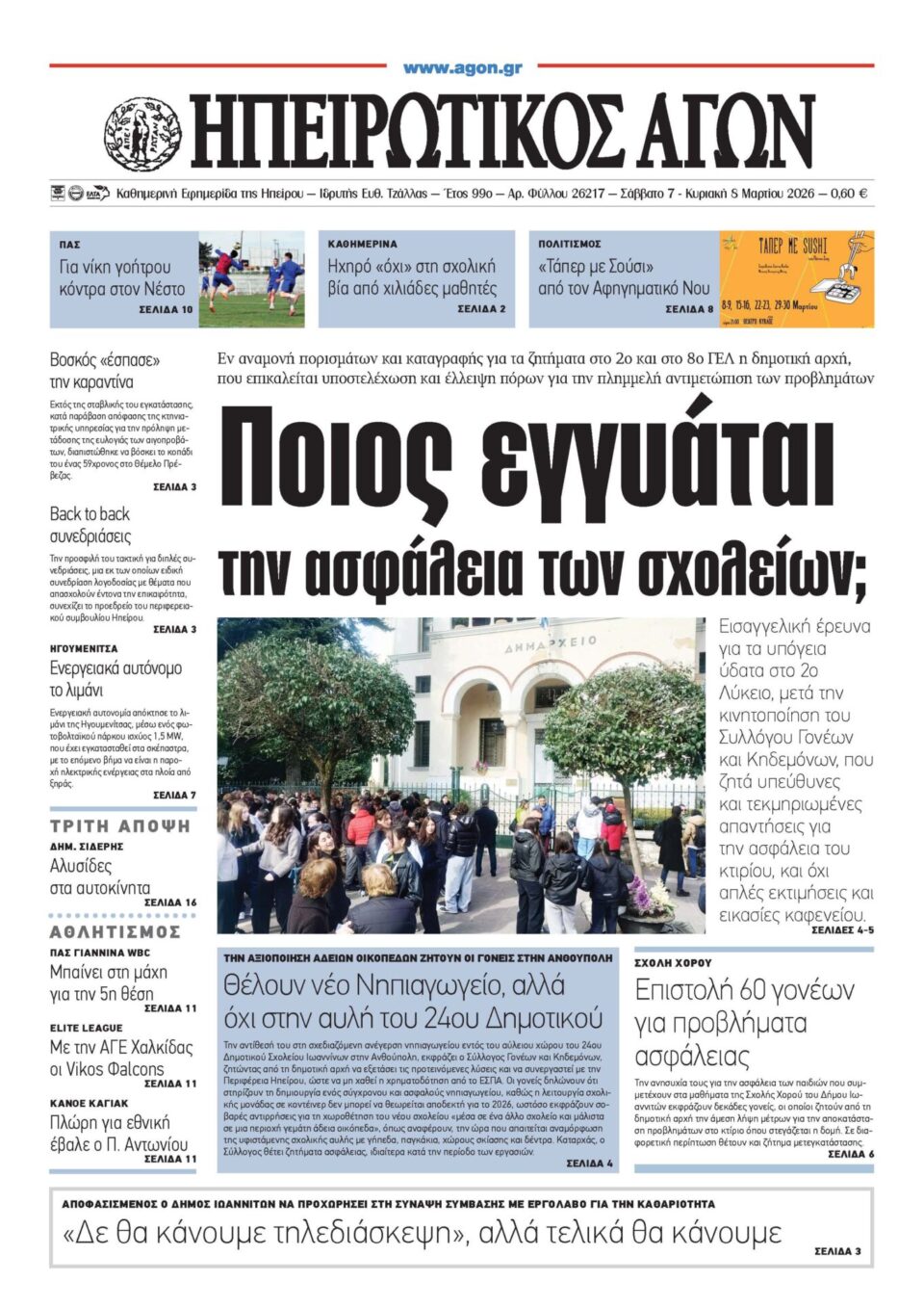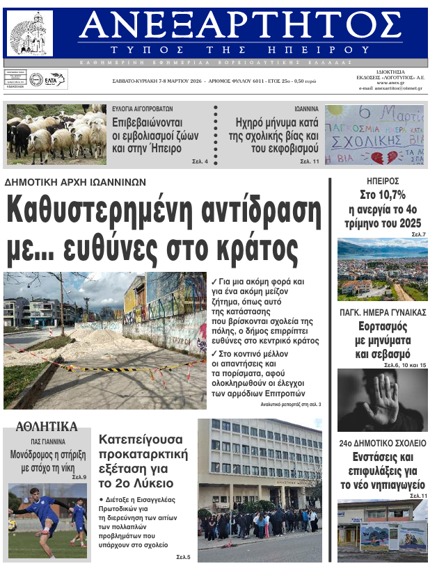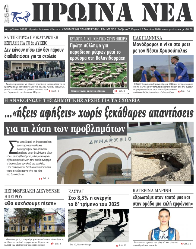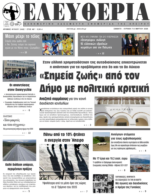 ΑρχικήTOP STORIES TOP STORIESΗΠΕΙΡΟΣ Τα πρωτοσέλιδα των γιαννιώτικων εφημερίδων 07.03.2026 0 FacebookTwitterWhatsAppEmailΤυπώνωViber Διαβάστε στα πρωτοσέλιδα των γιαννιώτικων εφημερίδων 7-3-2026 TagsΓΙΑΝΝΙΩΤΙΚΕΣ ΕΦΗΜΕΡΙΔΕΣΠΡΩΤΟΣΕΛΙΔΑ FacebookTwitterWhatsAppEmailΤυπώνωViber Προηγούμενο άρθροΔΗΜΟΣ ΖΗΡΟΥ -Δύο νέοι μηχανικοί στην Υπηρεσία Δόμησης ΣΧΕΤΙΚΑ ΑΡΘΡΑ Τα πρωτοσέλιδα των γιαννιώτικων εφημερίδων ΗΠΕΙΡΟΣ 06.03.2026 Τα πρωτοσέλιδα των γιαννιώτικων εφημερίδων ΗΠΕΙΡΟΣ 05.03.2026 Τα πρωτοσέλιδα των γιαννιώτικων εφημερίδων ΗΠΕΙΡΟΣ 04.03.2026 Τα πρωτοσέλιδα των γιαννιώτικων εφημερίδων ΗΠΕΙΡΟΣ 03.03.2026 Τα πρωτοσέλιδα των γιαννιώτικων εφημερίδων ΗΠΕΙΡΟΣ 28.02.2026 Τα πρωτοσέλιδα των γιαννιώτικων εφημερίδων ΗΠΕΙΡΟΣ 27.02.2026 ΣΤΗΝ ΙΔΙΑ ΚΑΤΗΓΟΡΙΑ ΔΗΜΟΣ ΖΗΡΟΥ -Δύο νέοι μηχανικοί στην Υπηρεσία Δόμησης ΗΠΕΙΡΟΣ 07.03.2026 ΔΕΥΑ ΑΡΤΑΣ -Σε λειτουργία η Μονάδα Επεξεργασίας Αφυδατωμένης Ιλύος της Ε.Ε.Λ. ΗΠΕΙΡΟΣ 07.03.2026 Σύσκεψη για το διαδημοτικό καταφυγίου αδέσποτων ζώων ΗΠΕΙΡΟΣ 07.03.2026 Φταίνε όλοι εκτός από την ίδια… ΗΠΕΙΡΟΣ 06.03.2026 Σύλληψη μετά από επεισόδιο στο ΤΕΠ του Νοσοκομείου Πρέβεζας ΗΠΕΙΡΟΣ 06.03.2026 Πρέβεζα: Συνελήφθη κτηνοτρόφος – Έβγαλε για βοσκή τα πρόβατα παρά τα μέτρα για την ευλογιά ΗΠΕΙΡΟΣ 06.03.2026 ΜΗ ΧΑΣΕΤΕ Φταίνε όλοι εκτός από την ίδια… Οι απαντήσεις στην Εισαγγελία Τρίτη συνεχόμενη αναβολή με… σκόρδα για το ξεμάτιασμα Αδιαπραγμάτευτο δικαίωμα η ασφάλεια παιδιών και εκπαιδευτικών Ενίσχυση της διαφάνειας, μείωση της γραφειοκρατίας ΔΗΜΟΦΙΛΗ ΔΗΜΟΣ ΖΗΡΟΥ -Δύο νέοι μηχανικοί στην Υπηρεσία Δόμησης ΔΕΥΑ ΑΡΤΑΣ -Σε λειτουργία η Μονάδα Επεξεργασίας Αφυδατωμένης Ιλύος της Ε.Ε.Λ. Σύσκεψη για το διαδημοτικό καταφυγίου αδέσποτων ζώων ΕΞΩΔΙΚΑΣΤΙΚΟΣ ΜΗΧΑΝΙΣΜΟΣ -Σε υψηλό ρυθμό οι ρυθμίσεις οφειλών τον Φεβρουάριο