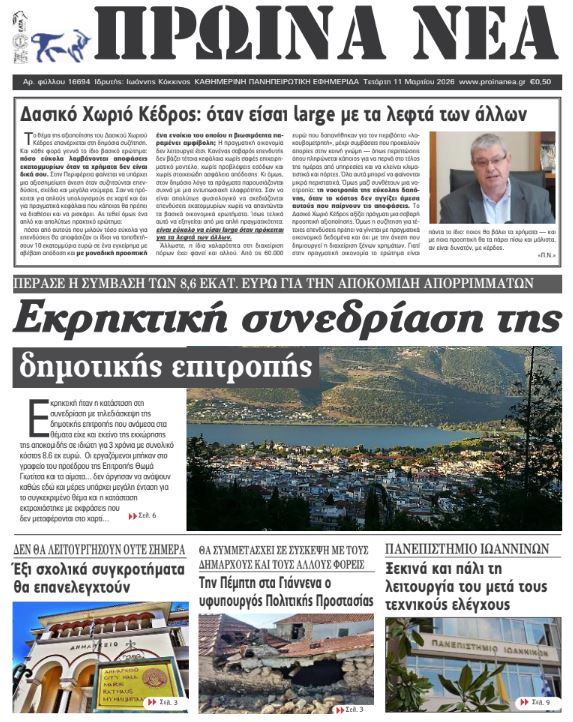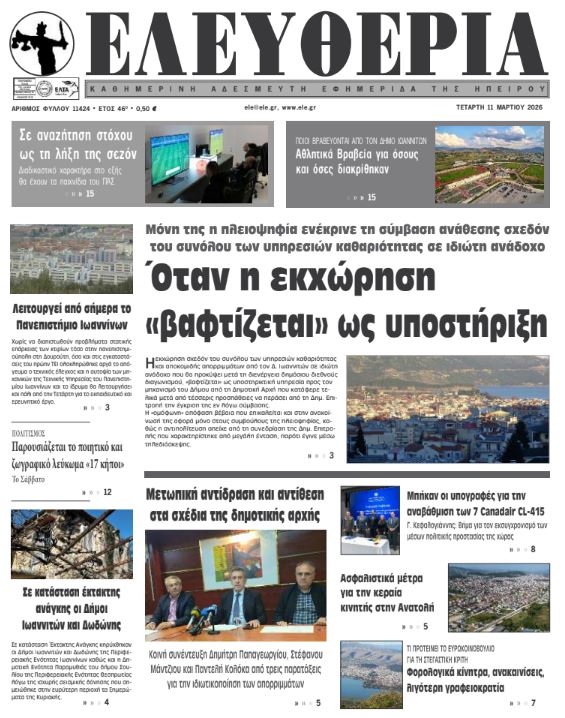 ΑρχικήTOP STORIES TOP STORIESΗΠΕΙΡΟΣ Τα πρωτοσέλιδα των γιαννιώτικων εφημερίδων 11.03.2026 0 FacebookTwitterWhatsAppEmailΤυπώνωViber Διαβάστε στα πρωτοσέλιδα των γιαννιώτικων εφημερίδων Τετάρτη 11-3-2026 TagsΓΙΑΝΝΙΩΤΙΚΕΣ ΕΦΗΜΕΡΙΔΕΣΠΡΩΤΟΣΕΛΙΔΑ FacebookTwitterWhatsAppEmailΤυπώνωViber Προηγούμενο άρθροΑΑΔΕ -1,9 εκατ. επιχειρήσεις εντάχθηκαν στους νέους Ευρωπαϊκούς ΚΑΔΕπόμενο άρθροΣφοδρή κριτική της αντιπολίτευσης για τα σχέδια αποκομιδής της δημοτικής αρχής ΣΧΕΤΙΚΑ ΑΡΘΡΑ Τα πρωτοσέλιδα των γιαννιώτικων εφημερίδων ΗΠΕΙΡΟΣ 10.03.2026 Τα πρωτοσέλιδα των γιαννιώτικων εφημερίδων TOP STORIES 07.03.2026 Τα πρωτοσέλιδα των γιαννιώτικων εφημερίδων ΗΠΕΙΡΟΣ 06.03.2026 Τα πρωτοσέλιδα των γιαννιώτικων εφημερίδων ΗΠΕΙΡΟΣ 05.03.2026 Τα πρωτοσέλιδα των γιαννιώτικων εφημερίδων ΗΠΕΙΡΟΣ 04.03.2026 Τα πρωτοσέλιδα των γιαννιώτικων εφημερίδων ΗΠΕΙΡΟΣ 03.03.2026 ΣΤΗΝ ΙΔΙΑ ΚΑΤΗΓΟΡΙΑ Δασικό Χωριό Κέδρος: όταν είσαι large με τα λεφτά των άλλων ΗΠΕΙΡΟΣ 11.03.2026 Σε κατάσταση έκτακτης ανάγκης οι Δήμοι Ιωαννιτών και Δωδώνης ΗΠΕΙΡΟΣ 11.03.2026 Σφοδρή κριτική της αντιπολίτευσης για τα σχέδια αποκομιδής της δημοτικής αρχής ΗΠΕΙΡΟΣ 11.03.2026 Αυτοψίες μηχανικών και καταγραφή ΗΠΕΙΡΟΣ 10.03.2026 Λειτουργεί από αύριο το Πανεπιστήμιο Ιωαννίνων ΗΠΕΙΡΟΣ 10.03.2026 Ολοκληρώθηκε ο έλεγχος των σχολικών και δημοτικών κτιρίων – Ποια σχολεία παραμένουν κλειστά ΗΠΕΙΡΟΣ 10.03.2026 ΜΗ ΧΑΣΕΤΕ Δασικό Χωριό Κέδρος: όταν είσαι large με τα λεφτά των άλλων Σε κατάσταση έκτακτης ανάγκης οι Δήμοι Ιωαννιτών και Δωδώνης Σφοδρή κριτική της αντιπολίτευσης για τα σχέδια αποκομιδής της δημοτικής αρχής Απίθανο! Έσπασε αγωγός ύδρευσης μόλις πέρασαν τον αγωγό φυσικού αερίου! Ασφαλιστικά μέτρα για την κεραία κινητής τηλεφωνίας στην Ανατολή ΔΗΜΟΦΙΛΗ ΠΑΣΟΚ: Τα εκλογικά τμήματα στα Ιωάννινα για την ανάδειξη συνέδρων του 4ου Συνεδρίου Σε αναζήτηση στόχου ως τη λήξη της σεζόν Επίθεση από άγνωστο βλήμα σε εμπορικό πλοίο κοντά στα Στενά του Ορμούζ Δασικό Χωριό Κέδρος: όταν είσαι large με τα λεφτά των άλλων Νέοι κωδικοί στο έντυπο Ε1 – Εκπτώσεις και απαλλαγές από τα τεκμήρια για επαγγελματίες και νέους έως 25 ετών
