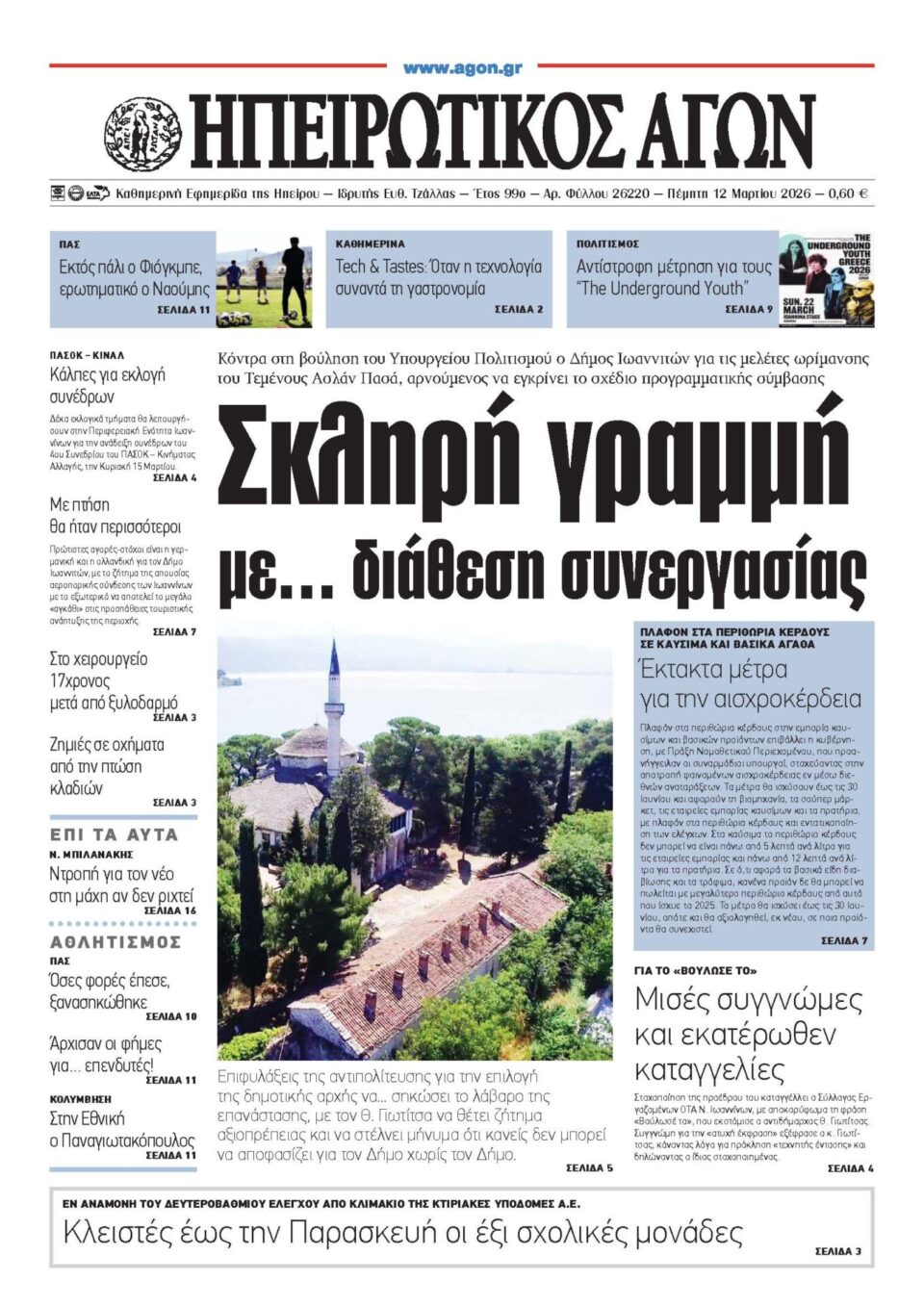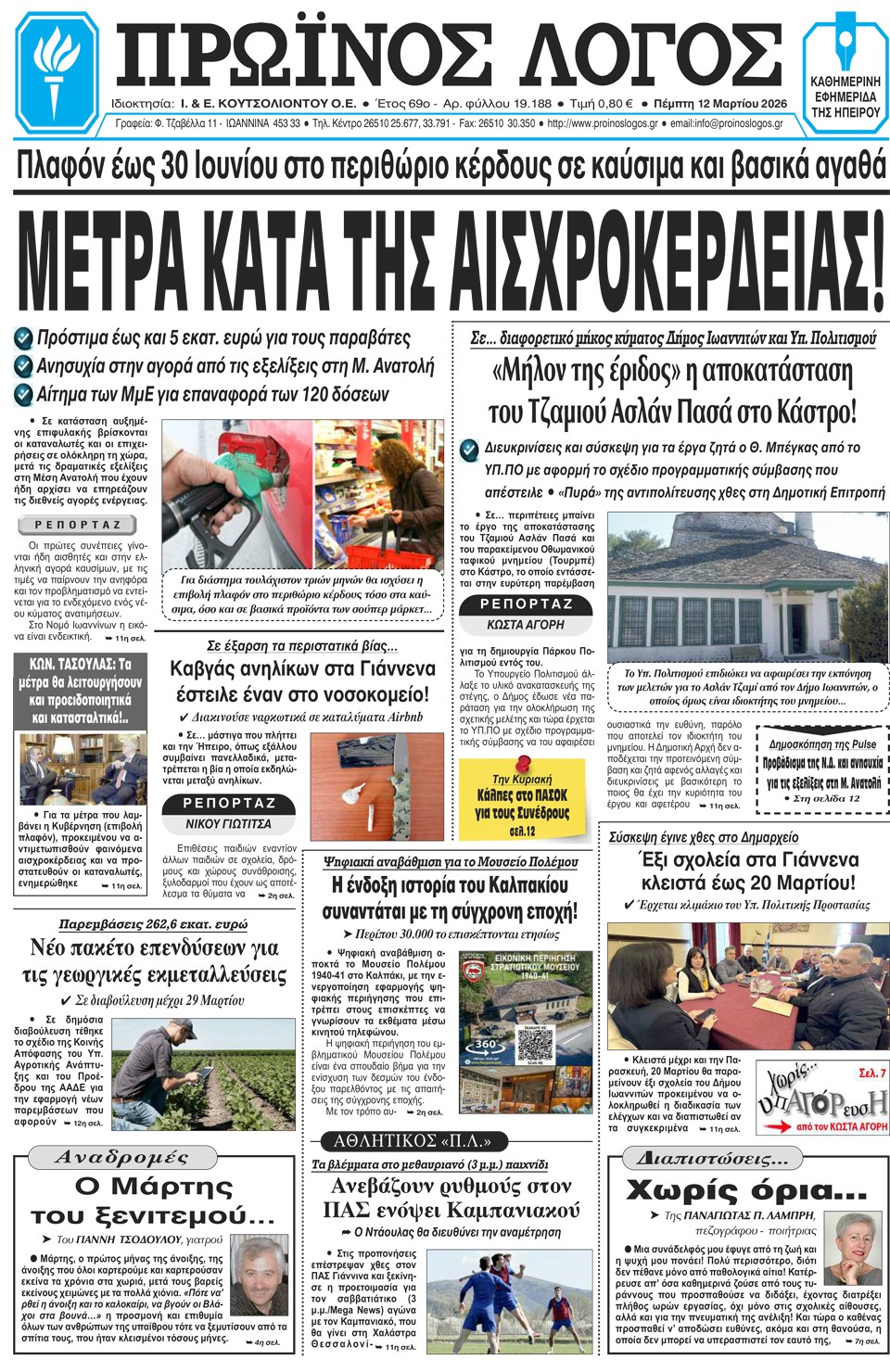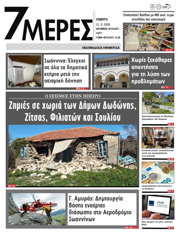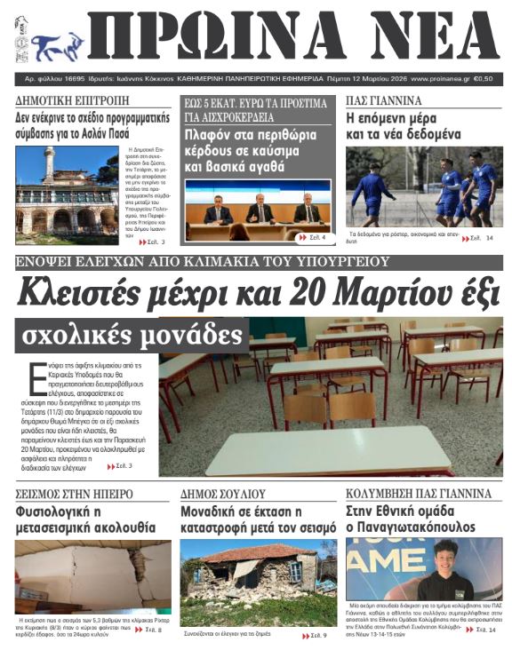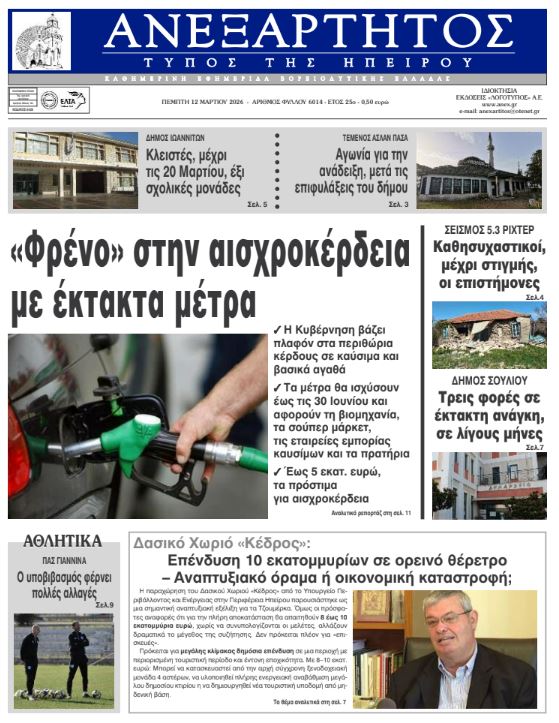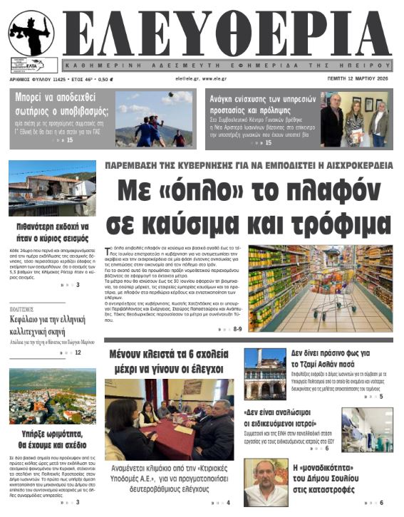 ΑρχικήTOP STORIES TOP STORIESΗΠΕΙΡΟΣ Τα πρωτοσέλιδα των γιαννιώτικων εφημερίδων 12.03.2026 0 FacebookTwitterWhatsAppEmailΤυπώνωViber Διαβάστε στα πρωτοσέλιδα των γιαννιώτικων εφημερίδων Πέμπτη 12-3-2026 TagsΓΙΑΝΝΙΩΤΙΚΕΣ ΕΦΗΜΕΡΙΔΕΣΠΡΩΤΟΣΕΛΙΔΑ FacebookTwitterWhatsAppEmailΤυπώνωViber Προηγούμενο άρθροΝέα Τεχνολογία στα Slot Machines Βελτιώνει τη Διαφάνεια και την Προστασία των Παικτών σε Περιφερειακό VenueΕπόμενο άρθροΤα του Καίσαρος… ΣΧΕΤΙΚΑ ΑΡΘΡΑ Τα πρωτοσέλιδα των γιαννιώτικων εφημερίδων ΗΠΕΙΡΟΣ 11.03.2026 Τα πρωτοσέλιδα των γιαννιώτικων εφημερίδων ΗΠΕΙΡΟΣ 10.03.2026 Τα πρωτοσέλιδα των γιαννιώτικων εφημερίδων TOP STORIES 07.03.2026 Τα πρωτοσέλιδα των γιαννιώτικων εφημερίδων ΗΠΕΙΡΟΣ 06.03.2026 Τα πρωτοσέλιδα των γιαννιώτικων εφημερίδων ΗΠΕΙΡΟΣ 05.03.2026 Τα πρωτοσέλιδα των γιαννιώτικων εφημερίδων ΗΠΕΙΡΟΣ 04.03.2026 ΣΤΗΝ ΙΔΙΑ ΚΑΤΗΓΟΡΙΑ Κανονικά η λειτουργία στο Πανεπιστήμιο Ιωαννίνων μετά τον μετασεισμικό έλεγχο ΗΠΕΙΡΟΣ 12.03.2026 Υπήρξε ωριμότητα, θα έχουμε και σχέδιο TOP STORIES 12.03.2026 Κομισιόν: Απαγορεύεται η ταφή ανεπεξέργαστων αποβλήτων στη Βλαχέρνα ΗΠΕΙΡΟΣ 12.03.2026 «Δεν είναι αναλώσιμοι οι ειδικευόμενοι ιατροί» ΗΠΕΙΡΟΣ 12.03.2026 Δασικό Χωριό «Κέδρος»: Επένδυση 10 εκατ. σε ορεινό θέρετρο – Αναπτυξιακό όραμα ή οικονομική καταστροφή; ΗΠΕΙΡΟΣ 12.03.2026 Μονολίθι Πρέβεζας: Το έργο σταμάτησε, η ζημιά έμεινε ΗΠΕΙΡΟΣ 12.03.2026 ΜΗ ΧΑΣΕΤΕ Υπήρξε ωριμότητα, θα έχουμε και σχέδιο Δασικό Χωριό «Κέδρος»: Επένδυση 10 εκατ. σε ορεινό θέρετρο – Αναπτυξιακό όραμα ή οικονομική καταστροφή; Μονολίθι Πρέβεζας: Το έργο σταμάτησε, η ζημιά έμεινε Πιθανότερη εκδοχή να ήταν ο κύριος σεισμός Κλειστά έως τις 20 Μαρτίου έξι σχολεία στα Ιωάννινα ΔΗΜΟΦΙΛΗ Δασικό Χωριό «Κέδρος»: Επένδυση 10 εκατ. σε ορεινό θέρετρο – Αναπτυξιακό όραμα ή οικονομική καταστροφή; Μπορεί να αποδειχθεί σωτήριος ο υποβιβασμός; «Δεν είναι αναλώσιμοι οι ειδικευόμενοι ιατροί» Νέα Τεχνολογία στα Slot Machines Βελτιώνει τη Διαφάνεια και την Προστασία των Παικτών σε Περιφερειακό Venue Μονολίθι Πρέβεζας: Το έργο σταμάτησε, η ζημιά έμεινε