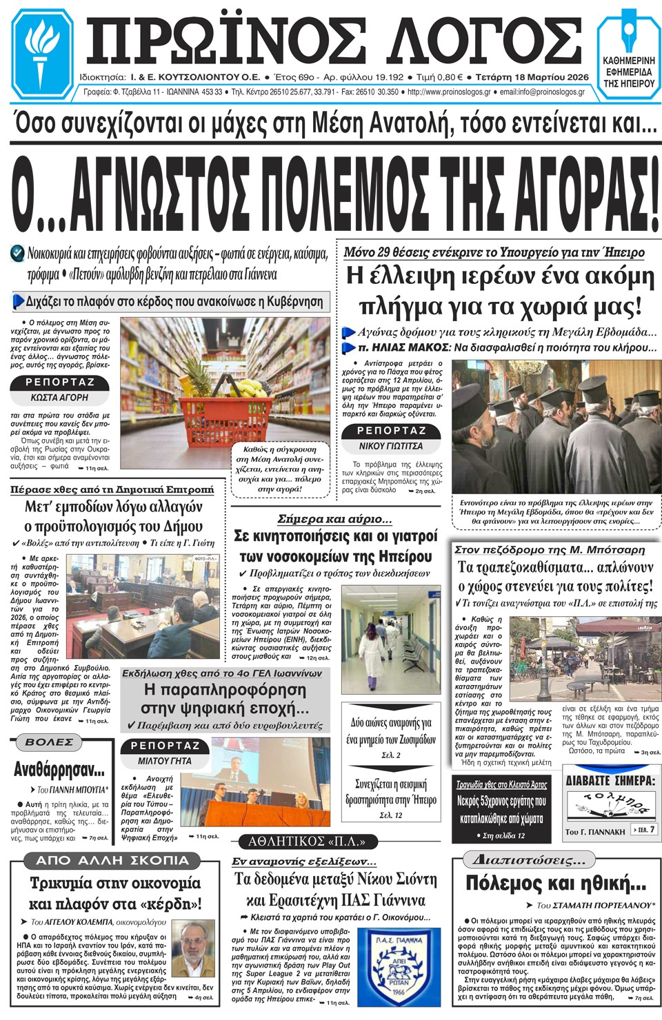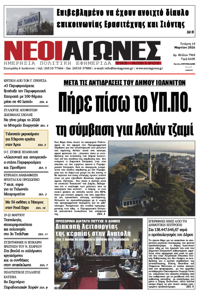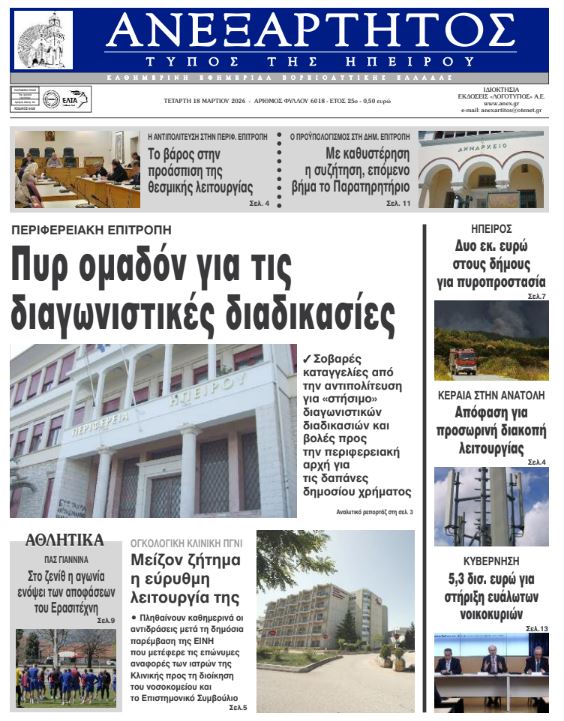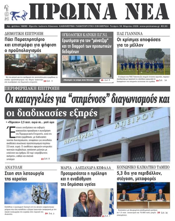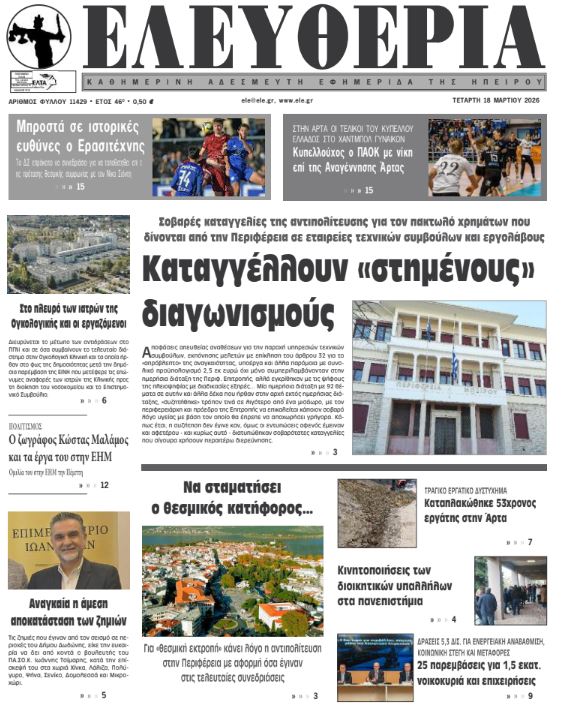 ΑρχικήTOP STORIES TOP STORIESΗΠΕΙΡΟΣ Τα πρωτοσέλιδα των γιαννιώτικων εφημερίδων 18.03.2026 0 FacebookTwitterWhatsAppEmailΤυπώνωViber Διαβάστε στα πρωτοσέλιδα των γιαννιώτικων εφημερίδων Τετάρτη 18-3-2026 TagsΓΙΑΝΝΙΩΤΙΚΕΣ ΕΦΗΜΕΡΙΔΕΣΠΡΩΤΟΣΕΛΙΔΑ FacebookTwitterWhatsAppEmailΤυπώνωViber Προηγούμενο άρθροΦωτιά σε πολυώροφο κτίριο στο κέντρο του Μανχάταν (βίντεο)Επόμενο άρθροΚινητοποιήσεις των διοικητικών υπαλλήλων στα πανεπιστήμια ΣΧΕΤΙΚΑ ΑΡΘΡΑ Τα πρωτοσέλιδα των γιαννιώτικων εφημερίδων ΗΠΕΙΡΟΣ 17.03.2026 Τα πρωτοσέλιδα των γιαννιώτικων εφημερίδων ΗΠΕΙΡΟΣ 14.03.2026 Τα πρωτοσέλιδα των γιαννιώτικων εφημερίδων ΗΠΕΙΡΟΣ 13.03.2026 Τα πρωτοσέλιδα των γιαννιώτικων εφημερίδων ΗΠΕΙΡΟΣ 12.03.2026 Τα πρωτοσέλιδα των γιαννιώτικων εφημερίδων ΗΠΕΙΡΟΣ 11.03.2026 Τα πρωτοσέλιδα των γιαννιώτικων εφημερίδων ΗΠΕΙΡΟΣ 10.03.2026 ΣΤΗΝ ΙΔΙΑ ΚΑΤΗΓΟΡΙΑ Δύο εκ. ευρώ στους δήμους για πυροπροστασία ΗΠΕΙΡΟΣ 18.03.2026 Να σταματήσει ο θεσμικός κατήφορος… ΗΠΕΙΡΟΣ 18.03.2026 Κινητοποιήσεις των διοικητικών υπαλλήλων στα πανεπιστήμια ΗΠΕΙΡΟΣ 18.03.2026 Σημαντική δωρεά φωτοτυπικού μηχανήματος στο Δημοτικό Σχολείο Πωγωνιανής ΗΠΕΙΡΟΣ 17.03.2026 ΧΡ. ΤΣΙΡΟΓΙΑΝΝΗΣ -Αναγκαίο ένα ειδικό πρόγραμμα στήριξης για τους ορεινούς δήμους και την ελληνική ύπαιθρο ΗΠΕΙΡΟΣ 17.03.2026 Καταγγέλλουν «στημένους» διαγωνισμούς ΗΠΕΙΡΟΣ 17.03.2026 ΜΗ ΧΑΣΕΤΕ Να σταματήσει ο θεσμικός κατήφορος… Κινητοποιήσεις των διοικητικών υπαλλήλων στα πανεπιστήμια Καταγγέλλουν «στημένους» διαγωνισμούς Στο πλευρό των ιατρών της Ογκολογικής και οι εργαζόμενοι ΕΝΦΙΑ: Λάθη και εκκρεμότητες μετά την πρώτη εκκαθάριση ΔΗΜΟΦΙΛΗ Δύο εκ. ευρώ στους δήμους για πυροπροστασία Κινητοποιήσεις των διοικητικών υπαλλήλων στα πανεπιστήμια Γυμνή Αλήθεια Να σταματήσει ο θεσμικός κατήφορος… Παρουσίαση του βιβλίου «Το Δέντρο της Ταπεινότητας»