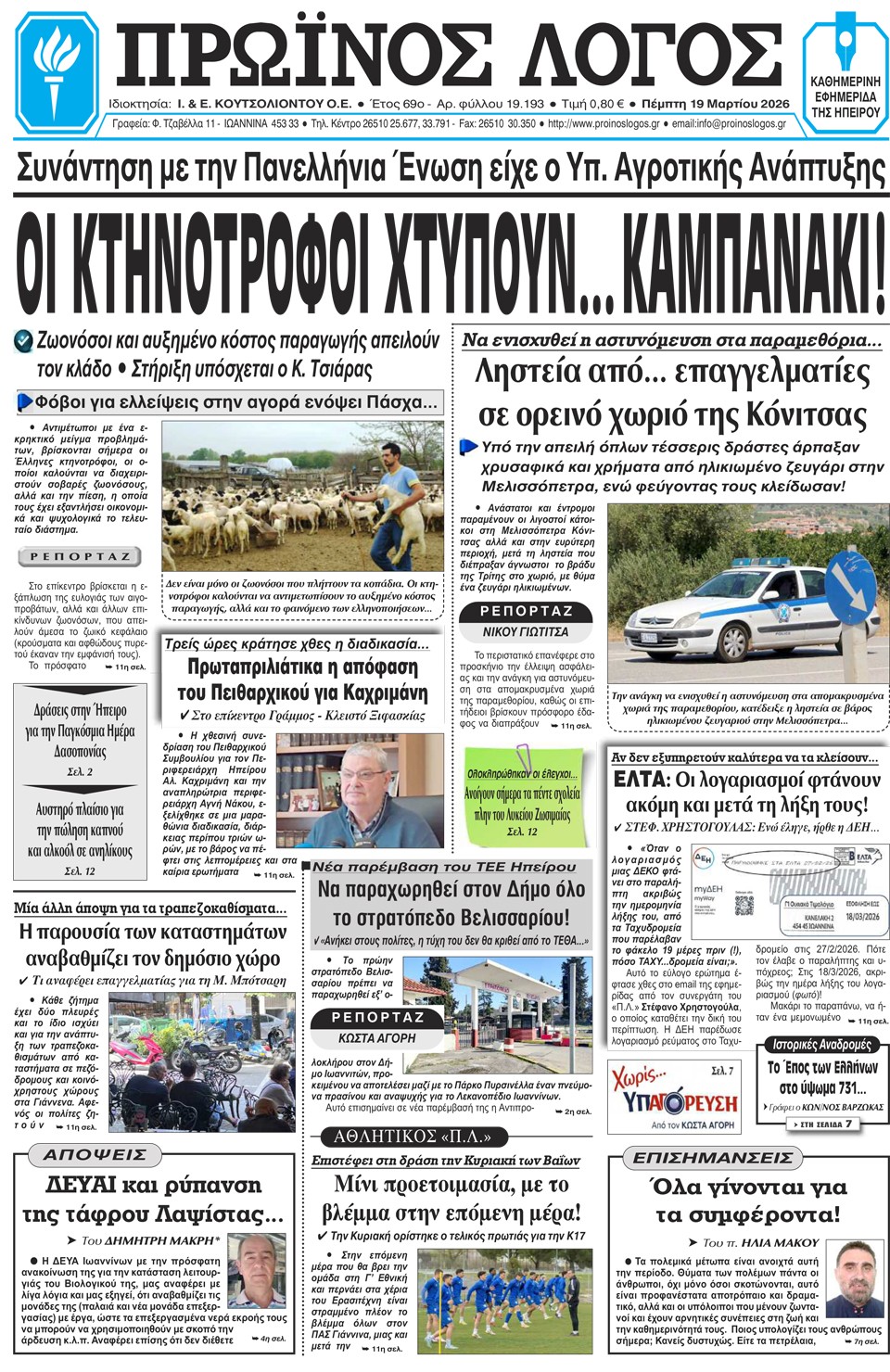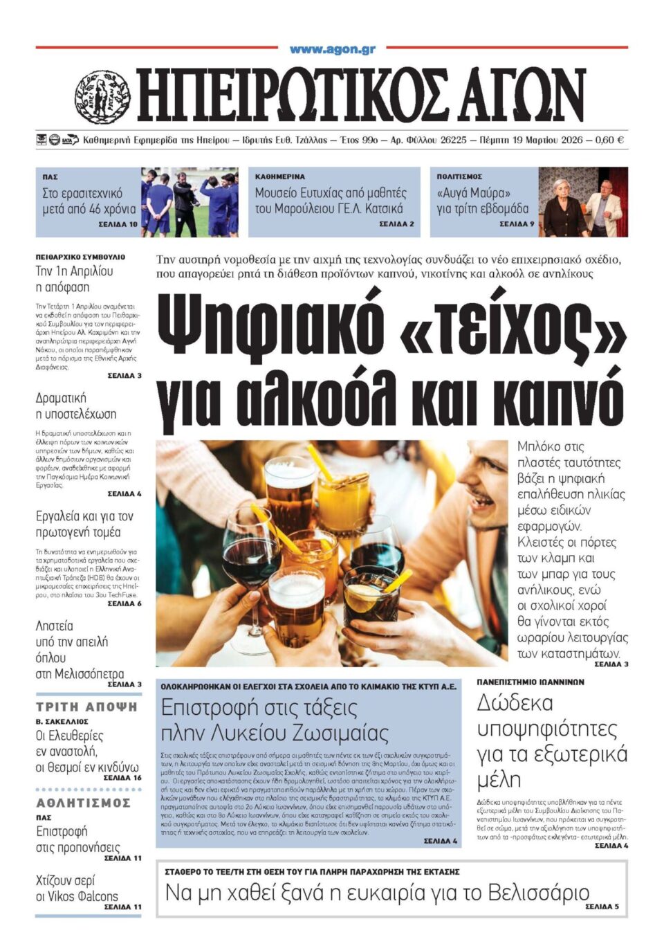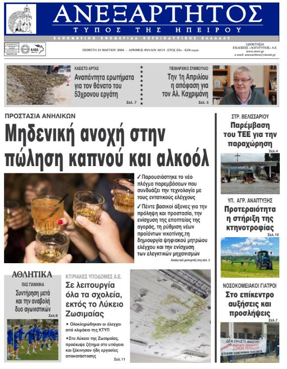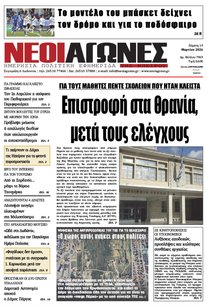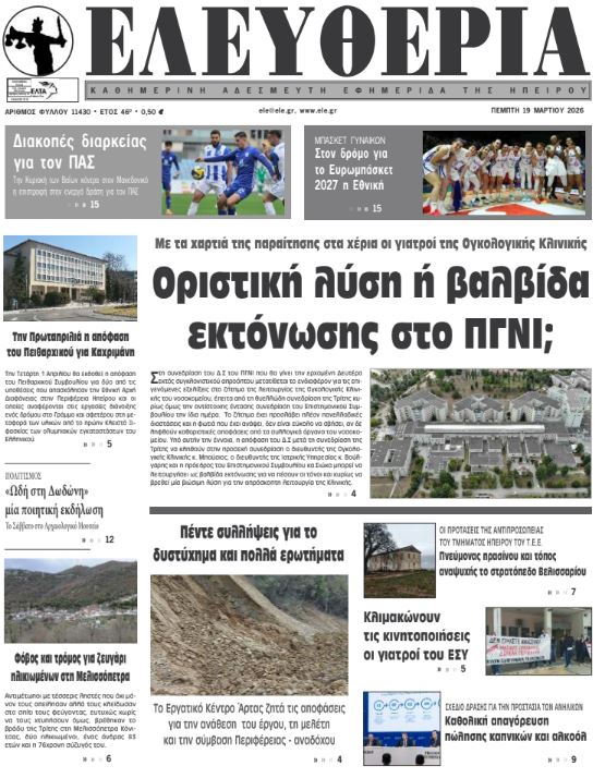 ΑρχικήTOP STORIES TOP STORIESΗΠΕΙΡΟΣ Τα πρωτοσέλιδα των γιαννιώτικων εφημερίδων 19.03.2026 0 FacebookTwitterWhatsAppEmailΤυπώνωViber Διαβάστε στα πρωτοσέλιδα των γιαννιώτικων εφημερίδων Πέμπτη 19-3-2026 TagsΓΙΑΝΝΙΩΤΙΚΕΣ ΕΦΗΜΕΡΙΔΕΣΠΡΩΤΟΣΕΛΙΔΑ FacebookTwitterWhatsAppEmailΤυπώνωViber Προηγούμενο άρθροΤα του Καίσαρος…Επόμενο άρθροΤζούφη: Η υγεία δεν είναι πεδίο επενδύσεων, είναι κοινωνικό δικαίωμα ΣΧΕΤΙΚΑ ΑΡΘΡΑ Τα πρωτοσέλιδα των γιαννιώτικων εφημερίδων ΗΠΕΙΡΟΣ 18.03.2026 Τα πρωτοσέλιδα των γιαννιώτικων εφημερίδων ΗΠΕΙΡΟΣ 17.03.2026 Τα πρωτοσέλιδα των γιαννιώτικων εφημερίδων ΗΠΕΙΡΟΣ 14.03.2026 Τα πρωτοσέλιδα των γιαννιώτικων εφημερίδων ΗΠΕΙΡΟΣ 13.03.2026 Τα πρωτοσέλιδα των γιαννιώτικων εφημερίδων ΗΠΕΙΡΟΣ 12.03.2026 Τα πρωτοσέλιδα των γιαννιώτικων εφημερίδων ΗΠΕΙΡΟΣ 11.03.2026 ΣΤΗΝ ΙΔΙΑ ΚΑΤΗΓΟΡΙΑ Πρόταση για πλήρη παραχώρηση του στρατοπέδου Βελισσαρίου στον Δήμο ΗΠΕΙΡΟΣ 19.03.2026 Όχι στους εργολάβους στα νοσοκομεία Άρτας και Πρέβεζας ΗΠΕΙΡΟΣ 19.03.2026 Χώρο για την κίνηση με ποδήλατο ζητούν τα παιδιά ΗΠΕΙΡΟΣ 19.03.2026 Οριστική λύση ή βαλβίδα εκτόνωσης στο ΠΓΝΙ; ΗΠΕΙΡΟΣ 19.03.2026 Στα Γιάννενα 14μελής αποστολή από το Ηράκλειο Κρήτης ΗΠΕΙΡΟΣ 18.03.2026 Ν. ΕΞΑΡΧΟΣ -Να καταβληθούν τα δεδουλευμένα στους εργαζόμενους στο ΚΔΑΥ Ιωαννίνων… ΗΠΕΙΡΟΣ 18.03.2026 ΜΗ ΧΑΣΕΤΕ Οριστική λύση ή βαλβίδα εκτόνωσης στο ΠΓΝΙ; Ολοκληρώθηκαν οι έλεγχοι στα σχολεία -Ποια ανοίγουν από σήμερα Την Πρωταπριλιά η απόφαση του Πειθαρχικού για Καχριμάνη Πέντε συλλήψεις για το δυστύχημα στην Άρτα και πολλά ερωτήματα Κόνιτσα: Νύχτα τρόμου για ηλικιωμένο ζευγάρι μετά από ένοπλη ληστεία στο σπίτι τους ΔΗΜΟΦΙΛΗ Τα του Καίσαρος… Πρόταση για πλήρη παραχώρηση του στρατοπέδου Βελισσαρίου στον Δήμο Διακοπές διαρκείας για τον ΠΑΣ Χώρο για την κίνηση με ποδήλατο ζητούν τα παιδιά Όχι στους εργολάβους στα νοσοκομεία Άρτας και Πρέβεζας