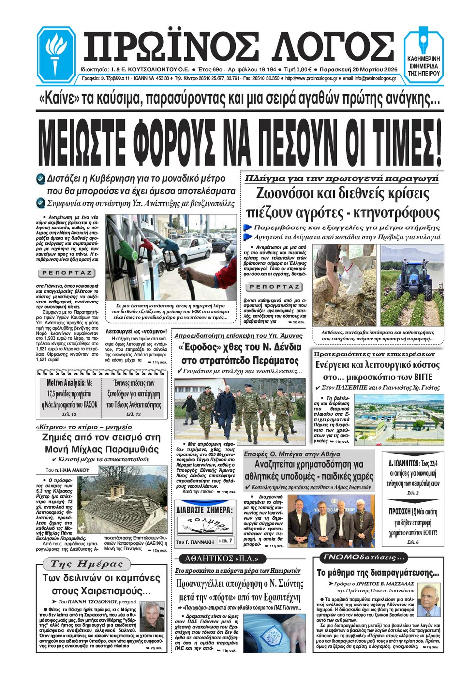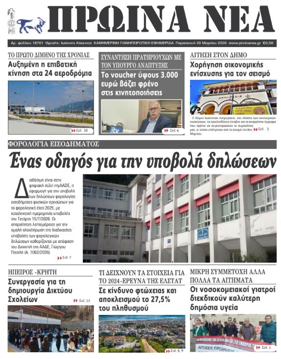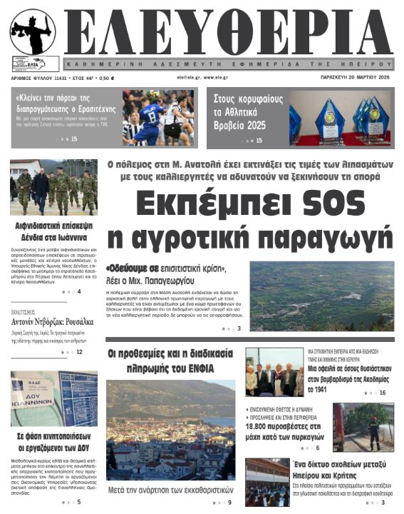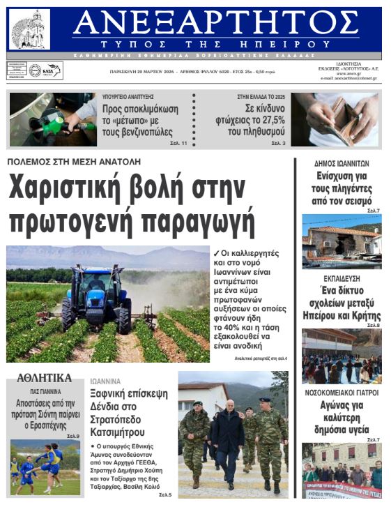 ΑρχικήTOP STORIES TOP STORIESΗΠΕΙΡΟΣ Τα πρωτοσέλιδα των γιαννιώτικων εφημερίδων 20.03.2026 0 FacebookTwitterWhatsAppEmailΤυπώνωViber Διαβάστε στα πρωτοσέλιδα των γιαννιώτικων εφημερίδων Παρασκευή 20-3-2026 TagsΓΙΑΝΝΙΩΤΙΚΕΣ ΕΦΗΜΕΡΙΔΕΣΠΡΩΤΟΣΕΛΙΔΑ FacebookTwitterWhatsAppEmailΤυπώνωViber Προηγούμενο άρθροΣε φάση κινητοποιήσεων οι εργαζόμενοι των ΔΟΥΕπόμενο άρθροΕκπέμπει SOS η αγροτική παραγωγή ΣΧΕΤΙΚΑ ΑΡΘΡΑ Τα πρωτοσέλιδα των γιαννιώτικων εφημερίδων ΗΠΕΙΡΟΣ 19.03.2026 Τα πρωτοσέλιδα των γιαννιώτικων εφημερίδων ΗΠΕΙΡΟΣ 18.03.2026 Τα πρωτοσέλιδα των γιαννιώτικων εφημερίδων ΗΠΕΙΡΟΣ 17.03.2026 Τα πρωτοσέλιδα των γιαννιώτικων εφημερίδων ΗΠΕΙΡΟΣ 14.03.2026 Τα πρωτοσέλιδα των γιαννιώτικων εφημερίδων ΗΠΕΙΡΟΣ 13.03.2026 Τα πρωτοσέλιδα των γιαννιώτικων εφημερίδων ΗΠΕΙΡΟΣ 12.03.2026 ΣΤΗΝ ΙΔΙΑ ΚΑΤΗΓΟΡΙΑ Αρνητικά για ευλογιά 445 δείγματα από την Πρέβεζα ΗΠΕΙΡΟΣ 20.03.2026 Σε εκκρεμότητα η έγκριση του Δήμου για το Καλλιτεχνικό Σχολείο ΗΠΕΙΡΟΣ 20.03.2026 Εκπέμπει SOS η αγροτική παραγωγή ΗΠΕΙΡΟΣ 20.03.2026 Σε φάση κινητοποιήσεων οι εργαζόμενοι των ΔΟΥ ΗΠΕΙΡΟΣ 20.03.2026 Εκτροπή ΙΧ στη Φιλιππιάδα – Απεγκλωβίστηκε τραυματισμένη γυναίκα ΗΠΕΙΡΟΣ 19.03.2026 Ντράπηκε και η ντροπή… ΗΠΕΙΡΟΣ 19.03.2026 ΜΗ ΧΑΣΕΤΕ Αρνητικά για ευλογιά 445 δείγματα από την Πρέβεζα Σε εκκρεμότητα η έγκριση του Δήμου για το Καλλιτεχνικό Σχολείο Εκπέμπει SOS η αγροτική παραγωγή Σε φάση κινητοποιήσεων οι εργαζόμενοι των ΔΟΥ Απροειδοποίητη επίσκεψη Δένδια στο Στρατόπεδο Κατσιμήτρου ΔΗΜΟΦΙΛΗ Σε φάση κινητοποιήσεων οι εργαζόμενοι των ΔΟΥ Τα του Καίσαρος… Σε εκκρεμότητα η έγκριση του Δήμου για το Καλλιτεχνικό Σχολείο Η καλλιτεχνική εκπαίδευση δεν αναβαθμίζεται – Παγιώνονται ανισότητες Εκπέμπει SOS η αγροτική παραγωγή