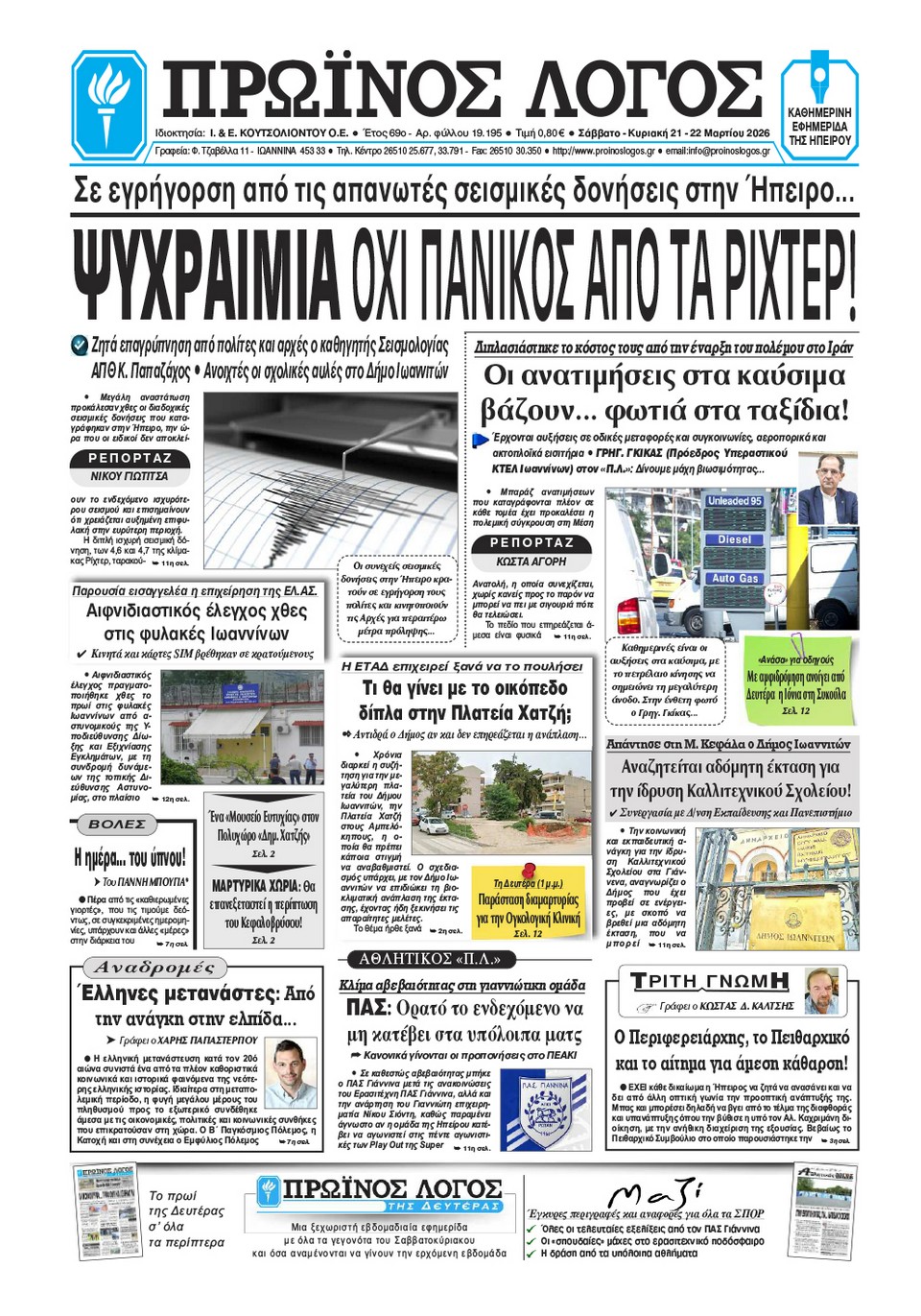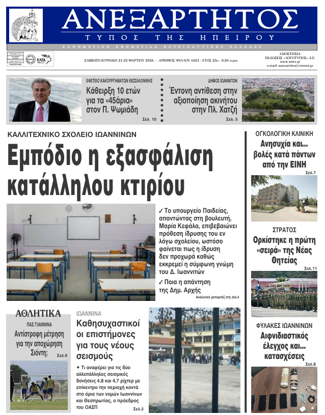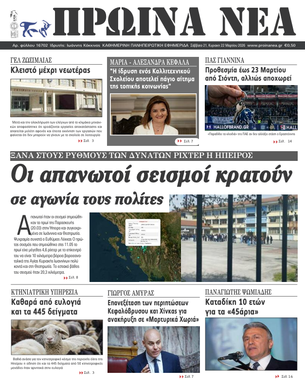 Διαβάστε στα πρωτοσέλιδα των γιαννιώτικων εφημερίδων 21 και 22 Μαρτίου 2026