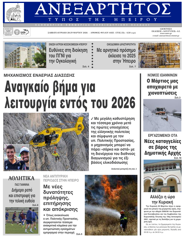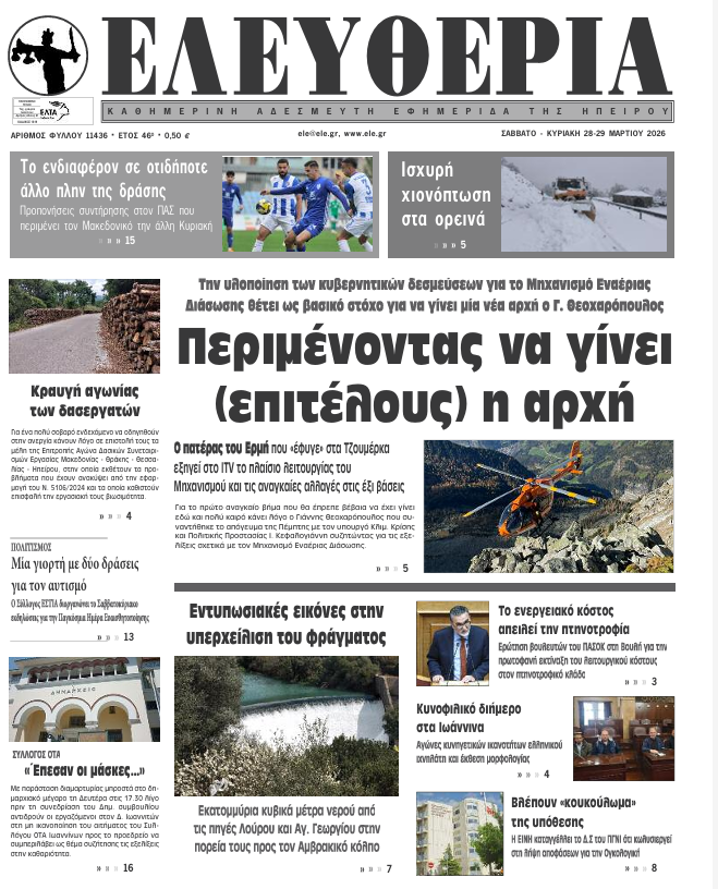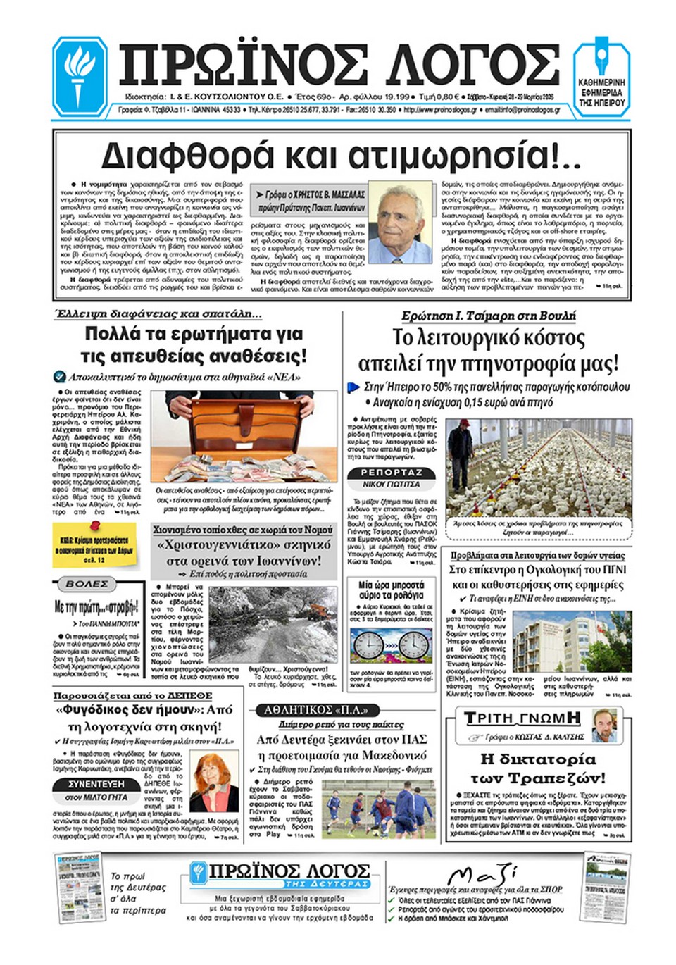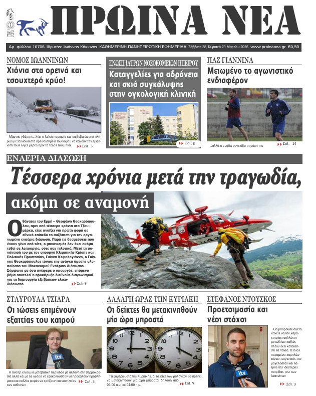 ΑρχικήTOP STORIES TOP STORIESΗΠΕΙΡΟΣ Τα πρωτοσέλιδα των γιαννιώτικων εφημερίδων 28.03.2026 0 FacebookTwitterWhatsAppEmailΤυπώνωViber Διαβάστε στα πρωτοσέλιδα των γιαννιώτικων εφημερίδων 28 και 29-3-2026 TagsΓΙΑΝΝΙΩΤΙΚΕΣ ΕΦΗΜΕΡΙΔΕΣΠΡΩΤΟΣΕΛΙΔΑ FacebookTwitterWhatsAppEmailΤυπώνωViber Προηγούμενο άρθροΚραυγή αγωνίας των δασεργατώνΕπόμενο άρθροΤο ενδιαφέρον σε οτιδήποτε άλλο πλην της δράσης ΣΧΕΤΙΚΑ ΑΡΘΡΑ Τα πρωτοσέλιδα των γιαννιώτικων εφημερίδων ΗΠΕΙΡΟΣ 27.03.2026 Τα πρωτοσέλιδα των γιαννιώτικων εφημερίδων ΗΠΕΙΡΟΣ 25.03.2026 Τα πρωτοσέλιδα των γιαννιώτικων εφημερίδων ΗΠΕΙΡΟΣ 24.03.2026 Τα πρωτοσέλιδα των γιαννιώτικων εφημερίδων ΗΠΕΙΡΟΣ 21.03.2026 Τα πρωτοσέλιδα των γιαννιώτικων εφημερίδων TOP STORIES 20.03.2026 Τα πρωτοσέλιδα των γιαννιώτικων εφημερίδων ΗΠΕΙΡΟΣ 19.03.2026 ΣΤΗΝ ΙΔΙΑ ΚΑΤΗΓΟΡΙΑ Περιμένοντας να γίνει (επιτέλους) η αρχή ΗΠΕΙΡΟΣ 28.03.2026 Εντυπωσιακές εικόνες στην υπερχείλιση στο φράγμα του Λούρου ΗΠΕΙΡΟΣ 28.03.2026 Σε επιφυλακή ο μηχανισμός Πολιτικής Προστασίας του Δήμου Πωγωνίου για το κύμα κακοκαιρίας ΗΠΕΙΡΟΣ 27.03.2026 Κυνοφιλικό διήμερο στα Ιωάννινα ΗΠΕΙΡΟΣ 27.03.2026 Αντιπολεμική συγκέντρωση το Σάββατο στα Ιωάννινα ΗΠΕΙΡΟΣ 27.03.2026 ΕΙΝΗ: Καμία απόφαση για την Ογκολογική Κλινική του ΠΓΝΙ ΗΠΕΙΡΟΣ 27.03.2026 ΜΗ ΧΑΣΕΤΕ Κραυγή αγωνίας των δασεργατών Περιμένοντας να γίνει (επιτέλους) η αρχή Εντυπωσιακές εικόνες στην υπερχείλιση στο φράγμα του Λούρου Άστατος ο καιρός Παρασκευή και Σάββατο με βροχές και καταιγίδες Fuel Pass: Την ερχόμενη εβδομάδα το άνοιγμα της ηλεκτρονικής εφαρμογής ΔΗΜΟΦΙΛΗ Χαβάη: 3 νεκροί και 2 τραυματίες μετά από συντριβή τουριστικού ελικοπτέρου (βίντεο) Κραυγή αγωνίας των δασεργατών Πότε πληρώνονται τα επιδόματα του ΟΠΕΚΑ για τον Μάρτιο Νέο Ηράκλειο: Συνελήφθη μαθητής που εντοπίστηκε με μαχαίρια στο σχολείο Το ενδιαφέρον σε οτιδήποτε άλλο πλην της δράσης