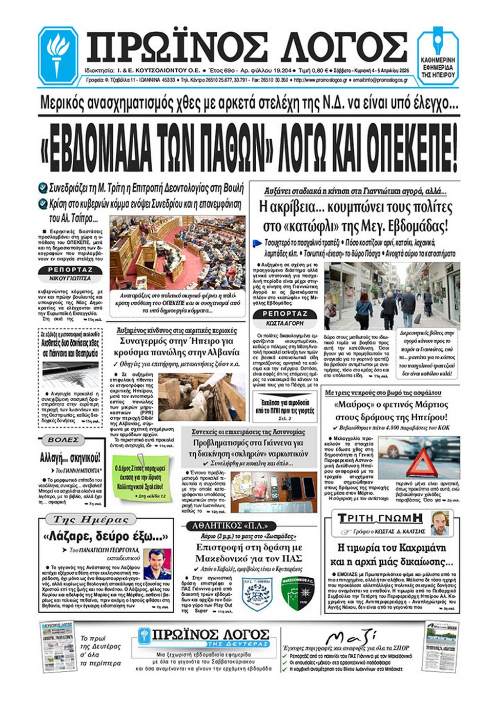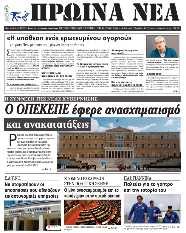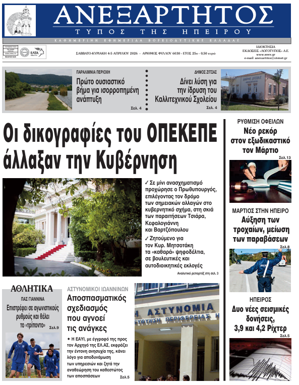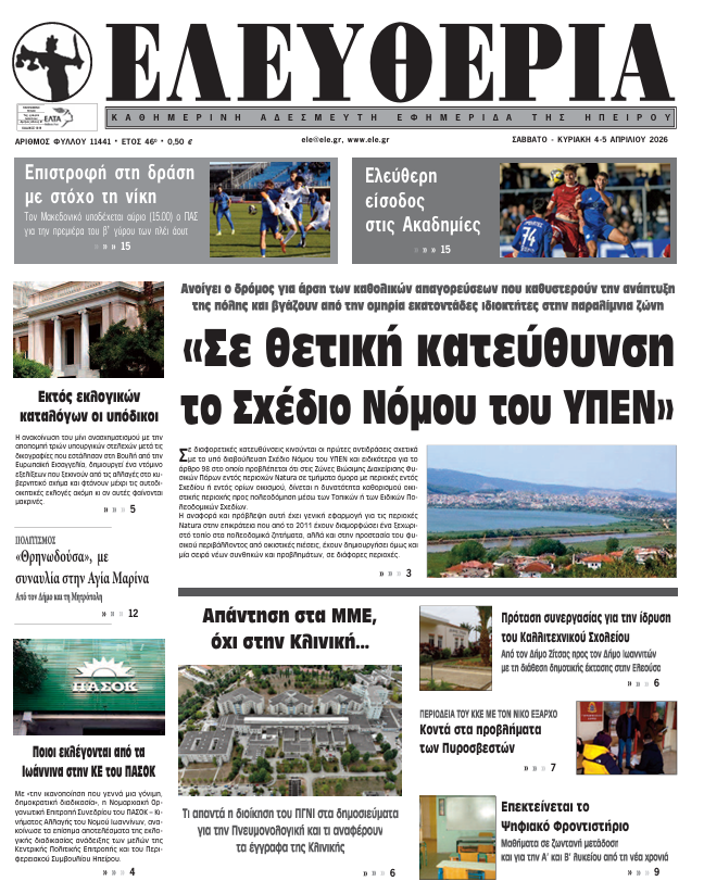 ΑρχικήTOP STORIES TOP STORIESΗΠΕΙΡΟΣ Τα πρωτοσέλιδα των γιαννιώτικων εφημερίδων 04.04.2026 0 FacebookTwitterWhatsAppEmailΤυπώνωViber Διαβάστε στα πρωτοσέλιδα των γιαννιώτικων εφημερίδων Σάββατο 4 και Κυριακή 5 Απριλίου TagsΓΙΑΝΝΙΩΤΙΚΕΣ ΕΦΗΜΕΡΙΔΕΣΠΡΩΤΟΣΕΛΙΔΑ FacebookTwitterWhatsAppEmailΤυπώνωViber Προηγούμενο άρθροΒιολάντα: Προθεσμία για τις 27 Απριλίου πήραν δύο στελέχη του εργοστασίουΕπόμενο άρθροΑπάντηση στα ΜΜΕ, όχι στην Κλινική… ΣΧΕΤΙΚΑ ΑΡΘΡΑ Τα πρωτοσέλιδα των γιαννιώτικων εφημερίδων ΗΠΕΙΡΟΣ 03.04.2026 Τα πρωτοσέλιδα των γιαννιώτικων εφημερίδων ΗΠΕΙΡΟΣ 02.04.2026 Τα πρωτοσέλιδα των γιαννιώτικων εφημερίδων ΗΠΕΙΡΟΣ 01.04.2026 Τα πρωτοσέλιδα των γιαννιώτικων εφημερίδων ΗΠΕΙΡΟΣ 31.03.2026 Τα πρωτοσέλιδα των γιαννιώτικων εφημερίδων ΗΠΕΙΡΟΣ 28.03.2026 Τα πρωτοσέλιδα των γιαννιώτικων εφημερίδων ΗΠΕΙΡΟΣ 27.03.2026 ΣΤΗΝ ΙΔΙΑ ΚΑΤΗΓΟΡΙΑ ΑΝΕΡΓΙΑ -Στο 8,5% τον Φεβρουάριο ΗΠΕΙΡΟΣ 04.04.2026 «Η υπόθεση ενός ερωτευμένου αγοριού»… και μιας Περιφέρειας που ψάχνει προτεραιότητες ΗΠΕΙΡΟΣ 04.04.2026 «Σε θετική κατεύθυνση το Σχέδιο Νόμου του ΥΠΕΝ» ΗΠΕΙΡΟΣ 04.04.2026 Απάντηση στα ΜΜΕ, όχι στην Κλινική… ΗΠΕΙΡΟΣ 04.04.2026 Σεισμός μεγέθους 4,2 Ρίχτερ στην Λεπτοκαρυά Θεσπρωτίας ΗΠΕΙΡΟΣ 03.04.2026 ΕΛΜΕ ΙΩΑΝΝΙΝΩΝ ΓΙΑ ΓΕΛ ΖΩΣΙΜΑΙΑΣ -Οι αρμόδιοι να βρουν λύσεις για φυσική εκπαιδευτική διαδικασία ΗΠΕΙΡΟΣ 03.04.2026 ΜΗ ΧΑΣΕΤΕ «Η υπόθεση ενός ερωτευμένου αγοριού»… και μιας Περιφέρειας που ψάχνει προτεραιότητες Εκτός εκλογικών καταλόγων οι υπόδικοι «Σε θετική κατεύθυνση το Σχέδιο Νόμου του ΥΠΕΝ» Απάντηση στα ΜΜΕ, όχι στην Κλινική… Αύξηση τροχαίων και παραβάσεων τον Μάρτιο στην Ήπειρο ΔΗΜΟΦΙΛΗ Τα αρσενικά χταπόδια χρησιμοποιούν ένα ειδικό πλοκάμι για να ζευγαρώσουν Τα του Καίσαρος… Απάντηση στα ΜΜΕ, όχι στην Κλινική… Εκτός εκλογικών καταλόγων οι υπόδικοι Εξωδικαστικός Μηχανισμός: Νέο ρεκόρ ρυθμίσεων τον Μάρτιο