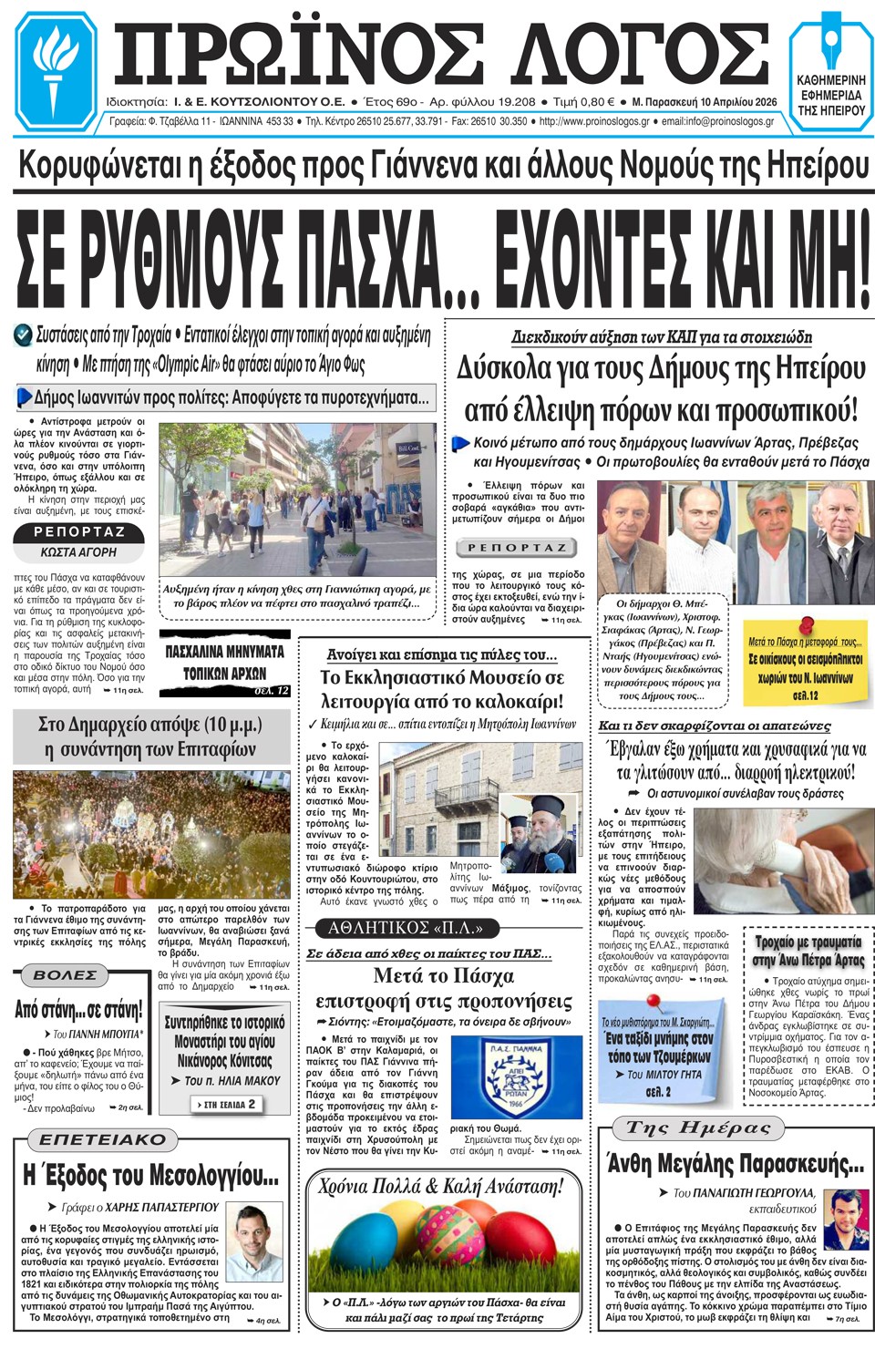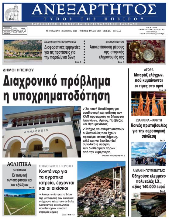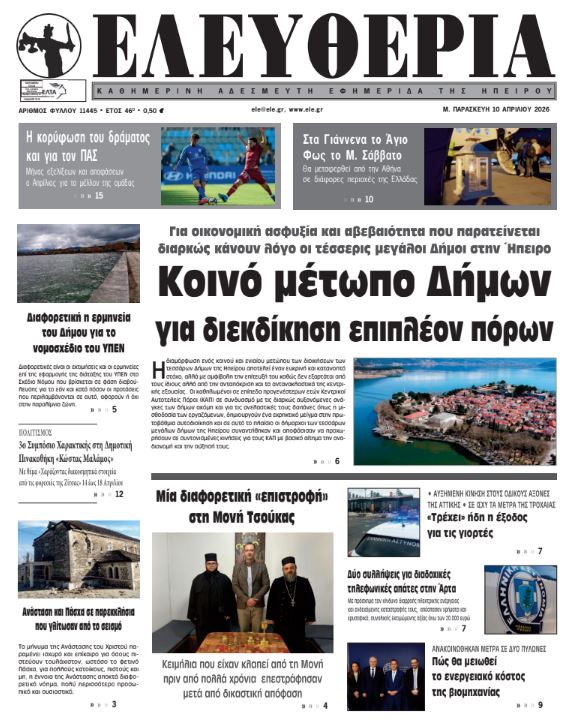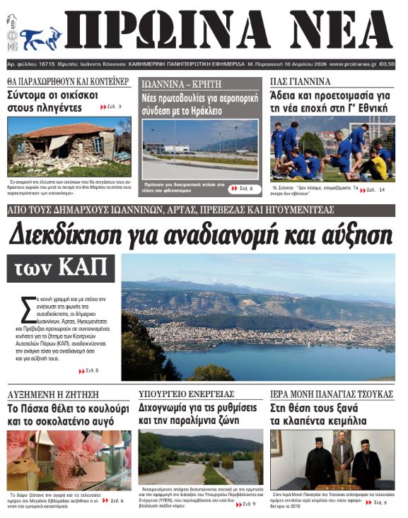 ΑρχικήTOP STORIES TOP STORIESΗΠΕΙΡΟΣ Τα πρωτοσέλιδα των γιαννιώτικων εφημερίδων 10.04.2026 0 FacebookTwitterWhatsAppEmailΤυπώνωViber Διαβάστε στα πρωτοσέλιδα των γιαννιώτικων εφημερίδων Μ. Παρασκευή 10-4-2026 FacebookTwitterWhatsAppEmailΤυπώνωViber Προηγούμενο άρθροΑΑΔΕ -Πληρωμές 19,8 εκατ. ευρώ σε 57.000 αγρότες ΣΤΗΝ ΙΔΙΑ ΚΑΤΗΓΟΡΙΑ Ανάσταση και Πάσχα σε παρεκκλήσια που γλίτωσαν από το σεισμό ΗΠΕΙΡΟΣ 09.04.2026 Διαφορετική η ερμηνεία του Δήμου για το Σ/Ν του ΥΠΕΝ ΗΠΕΙΡΟΣ 09.04.2026 ΕΠΙΜΕΛΗΤΗΡΙΟ ΙΩΑΝΝΙΝΩΝ -Ζητά μέτρα για την επιβίωση των μικρομεσαίων παραγωγών φωτοβολταϊκών ΗΠΕΙΡΟΣ 09.04.2026 Μία διαφορετική «επιστροφή» στη Μονή Τσούκας ΗΠΕΙΡΟΣ 09.04.2026 Πώς θα λειτουργήσουν καταστήματα και σούπερ μάρκετ Μ. Παρασκευή και Μ. Σάββατο ΗΠΕΙΡΟΣ 09.04.2026 Data Center υπό αυστηρές περιβαλλοντικές και κοινωνικές προϋποθέσεις ΗΠΕΙΡΟΣ 09.04.2026 ΜΗ ΧΑΣΕΤΕ Ανάσταση και Πάσχα σε παρεκκλήσια που γλίτωσαν από το σεισμό Διαφορετική η ερμηνεία του Δήμου για το Σ/Ν του ΥΠΕΝ Μία διαφορετική «επιστροφή» στη Μονή Τσούκας Συντονισμένη πρωτοβουλία δήμων Ηπείρου για ανακατανομή και ενίσχυση των ΚΑΠ Κρύο το Μεγάλο Σάββατο, θερμές αέριες μάζες και άνοδος της θερμοκρασίας την Κυριακή ΔΗΜΟΦΙΛΗ