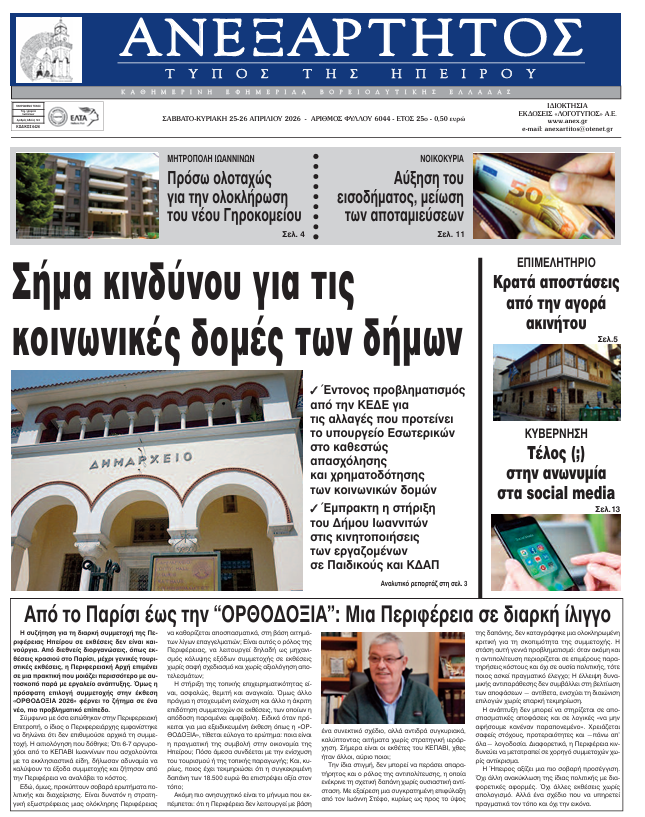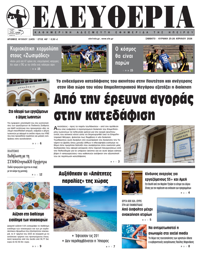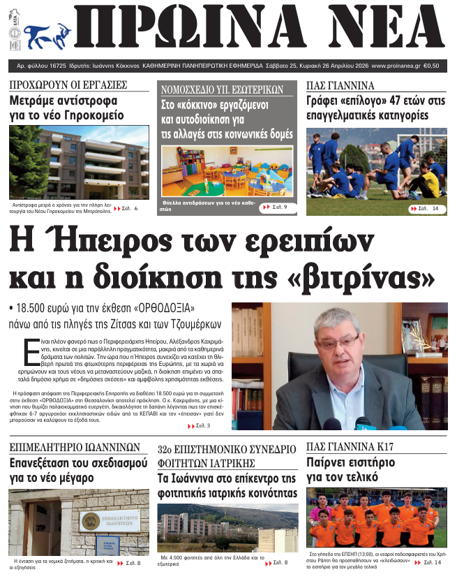 ΑρχικήTOP STORIES TOP STORIESΗΠΕΙΡΟΣ Τα πρωτοσέλιδα των γιαννιώτικων εφημερίδων 25.04.2026 0 FacebookTwitterWhatsAppEmailΤυπώνωViber Διαβάστε στα πρωτοσέλιδα των γιαννιώτικων εφημερίδων 25-4-2026 TagsΓΙΑΝΝΙΩΤΙΚΕΣ ΕΦΗΜΕΡΙΔΕΣΠΡΩΤΟΣΕΛΙΔΑ FacebookTwitterWhatsAppEmailΤυπώνωViber Προηγούμενο άρθροΗ Ήπειρος των ερειπίων και η διοίκηση της «βιτρίνας»: 18.500 ευρώ για την έκθεση «ΟΡΘΟΔΟΞΙΑ» πάνω από τις πληγές της Ζίτσας και των ΤζουμέρκωνΕπόμενο άρθροΚυριακάτικη χαρμολύπη στους «Ζωσιμάδες» ΣΧΕΤΙΚΑ ΑΡΘΡΑ Τα πρωτοσέλιδα των γιαννιώτικων εφημερίδων ΗΠΕΙΡΟΣ 24.04.2026 Τα πρωτοσέλιδα των γιαννιώτικων εφημερίδων ΗΠΕΙΡΟΣ 23.04.2026 Τα πρωτοσέλιδα των γιαννιώτικων εφημερίδων ΗΠΕΙΡΟΣ 22.04.2026 Τα πρωτοσέλιδα των γιαννιώτικων εφημερίδων ΗΠΕΙΡΟΣ 21.04.2026 Τα πρωτοσέλιδα των γιαννιώτικων εφημερίδων ΗΠΕΙΡΟΣ 18.04.2026 Τα πρωτοσέλιδα των γιαννιώτικων εφημερίδων TOP STORIES 17.04.2026 ΣΤΗΝ ΙΔΙΑ ΚΑΤΗΓΟΡΙΑ 4.500 φοιτητές Ιατρικής στα Ιωάννινα ΗΠΕΙΡΟΣ 25.04.2026 Στο πλευρό των εργαζόμενων ο Δ. Ιωαννιτών ΗΠΕΙΡΟΣ 25.04.2026 Η Ήπειρος των ερειπίων και η διοίκηση της «βιτρίνας»: 18.500 ευρώ για την έκθεση «ΟΡΘΟΔΟΞΙΑ» πάνω από τις πληγές της Ζίτσας και των Τζουμέρκων ΗΠΕΙΡΟΣ 25.04.2026 Ο «χάρτης» των πληρωμών από 27 έως 30 Απριλίου από e-ΕΦΚΑ και ΔΥΠΑ TOP STORIES 25.04.2026 Απαγόρευση αλιείας από 1 έως και 31 Μαΐου ΗΠΕΙΡΟΣ 25.04.2026 Από την έρευνα αγοράς στην κατεδάφιση ΗΠΕΙΡΟΣ 24.04.2026 ΜΗ ΧΑΣΕΤΕ Η Ήπειρος των ερειπίων και η διοίκηση της «βιτρίνας»: 18.500 ευρώ για την έκθεση «ΟΡΘΟΔΟΞΙΑ» πάνω από τις πληγές της Ζίτσας και των Τζουμέρκων Ο «χάρτης» των πληρωμών από 27 έως 30 Απριλίου από e-ΕΦΚΑ και ΔΥΠΑ Από την έρευνα αγοράς στην κατεδάφιση Περιφέρεια και Δήμος απέναντι στην ΚΤΥΠ για τη Ζωσιμαία Πρώτο βήμα η νυχτερινή διέλευση και βλέπουμε ΔΗΜΟΦΙΛΗ Tρία κρούσματα λεπτοσπείρωσης στη Ζάκυνθο -Νεκρός 74χρονος 4.500 φοιτητές Ιατρικής στα Ιωάννινα Στο πλευρό των εργαζόμενων ο Δ. Ιωαννιτών Κυριακάτικη χαρμολύπη στους «Ζωσιμάδες» Τα του Καίσαρος…