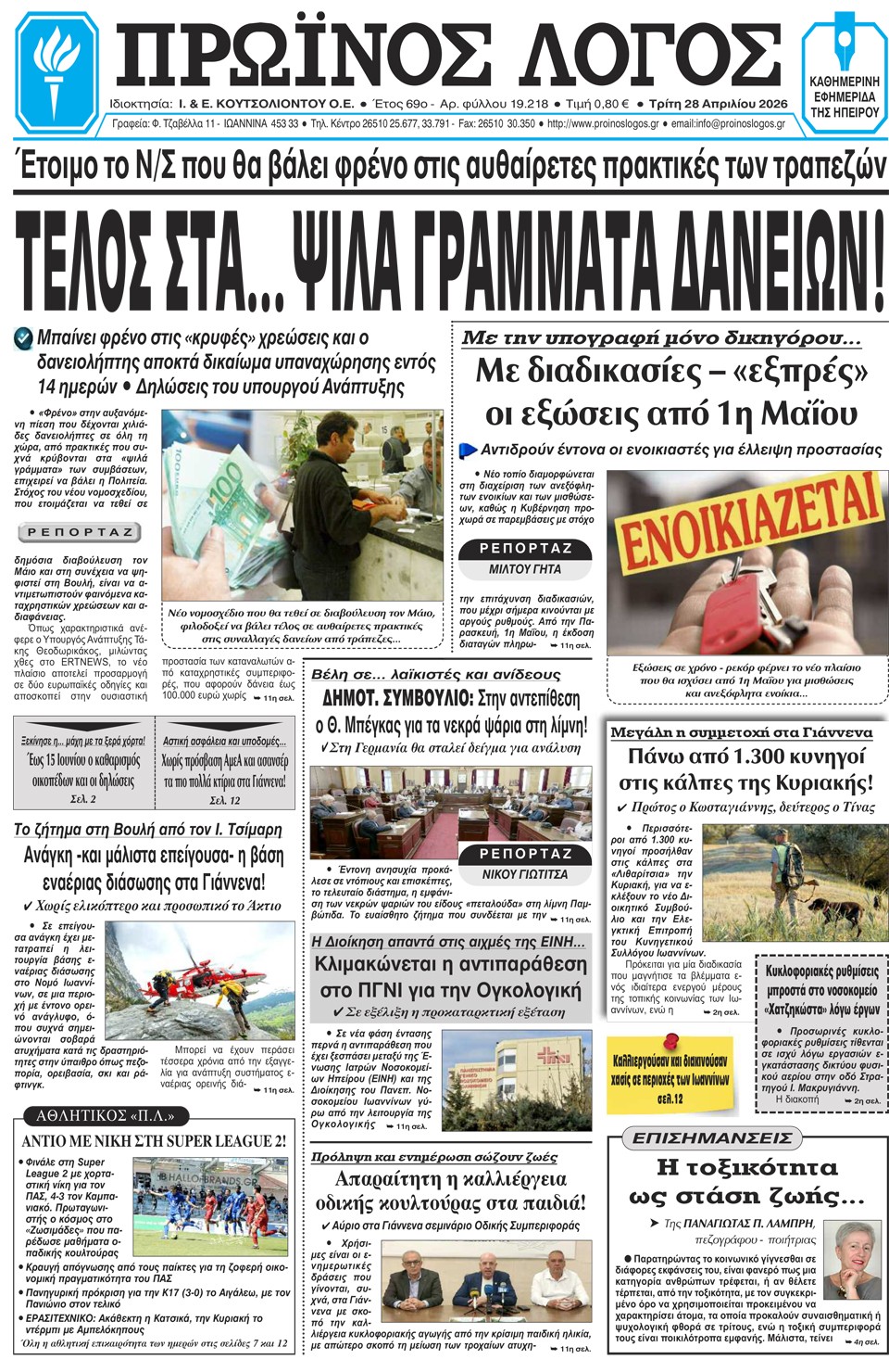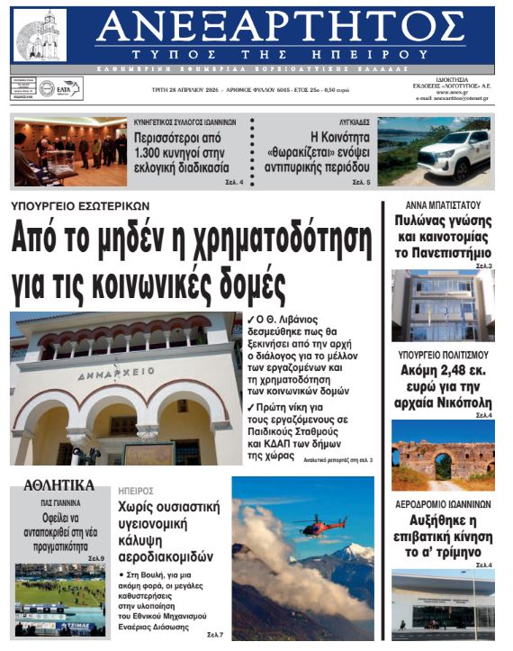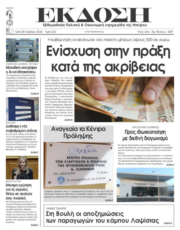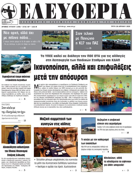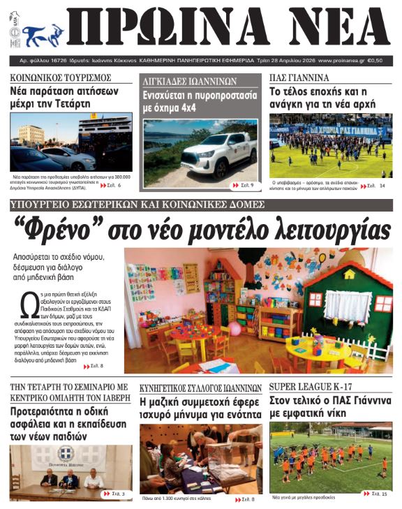 ΑρχικήTOP STORIES TOP STORIESΗΠΕΙΡΟΣ Τα πρωτοσέλιδα των γιαννιώτικων εφημερίδων 28.04.2026 0 FacebookTwitterWhatsAppEmailΤυπώνωViber Διαβάστε στα πρωτοσέλιδα των γιαννιώτικων εφημερίδων 28-4-2026 FacebookTwitterWhatsAppEmailΤυπώνωViber Προηγούμενο άρθροΚέρκυρα: Αυτοκίνητο παρέσυρε και τραυμάτισε 63χρονη και τον 32χρονο γιο της ΣΤΗΝ ΙΔΙΑ ΚΑΤΗΓΟΡΙΑ Πάνω από 1.100 μαθητές σε δράση για την οδική ασφάλεια ΗΠΕΙΡΟΣ 27.04.2026 Μαζική η συμμετοχή των κυνηγών στις κάλπες – Τα αποτελέσματα ΗΠΕΙΡΟΣ 27.04.2026 Η «Αρωγή» έφερε όχημα πυρόσβεσης στους Λυγκιάδες ΗΠΕΙΡΟΣ 27.04.2026 Καθαρισμός οικοπέδων: Νέα προθεσμία και αυστηρότερα πρόστιμα TOP STORIES 27.04.2026 Εξιχνιάστηκαν διαδοχικές κλοπές μοτοποδηλάτων στα Ιωάννινα ΗΠΕΙΡΟΣ 27.04.2026 Δέκα συλλήψεις σε δέκα μέρες για υποθέσεις ναρκωτικών ΗΠΕΙΡΟΣ 27.04.2026 ΜΗ ΧΑΣΕΤΕ Η «Αρωγή» έφερε όχημα πυρόσβεσης στους Λυγκιάδες Καθαρισμός οικοπέδων: Νέα προθεσμία και αυστηρότερα πρόστιμα Δικαιολογία ότι είναι κλειστή η Ζωσιμαία και δε μαζεύουν ούτε τα κλαδιά Παράταση αιτήσεων για 300.000 επιταγές Kοινωνικού Tουρισμού της ΔΥΠΑ Νταντάδες της γειτονιάς: Ξεκινούν οι αιτήσεις – Τα κριτήρια και τα ποσά ΔΗΜΟΦΙΛΗ