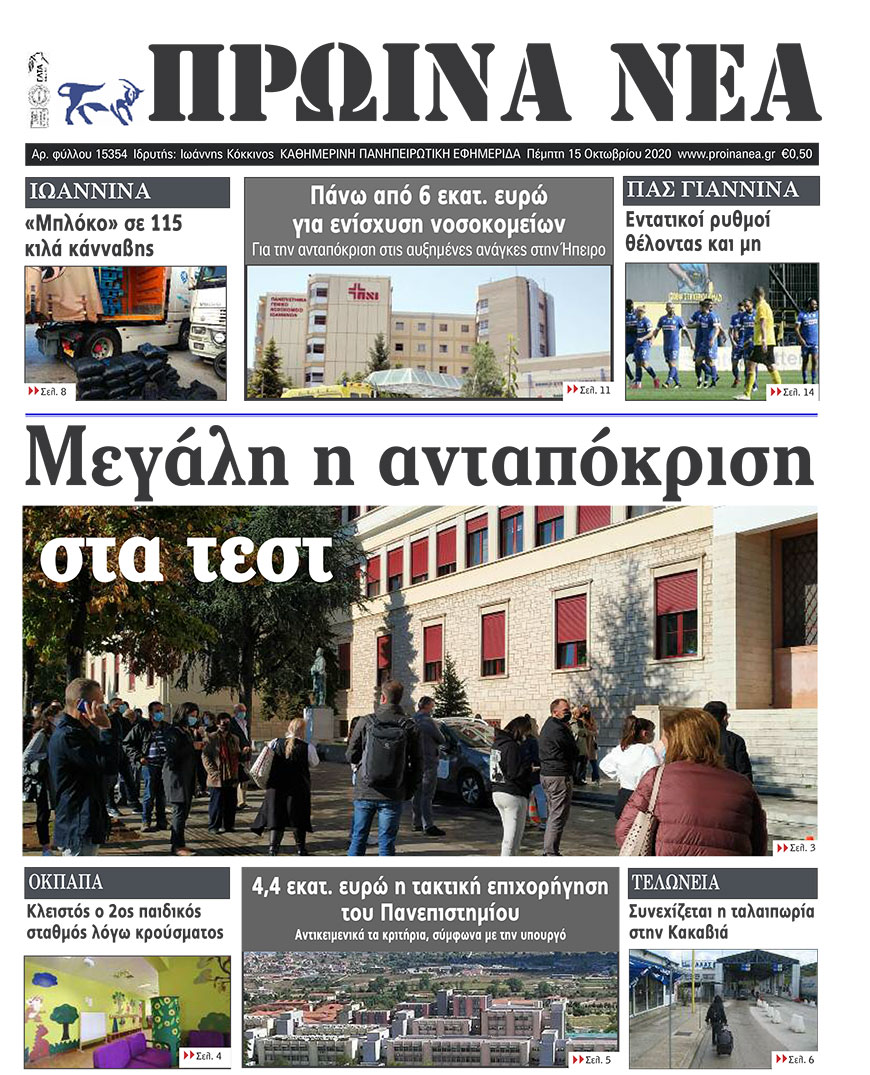 Διαβάστε στα πρωτοσέλιδα των γιαννιώτικων εφημερίδων της Πέμπτης 15 Οκτωβρίου