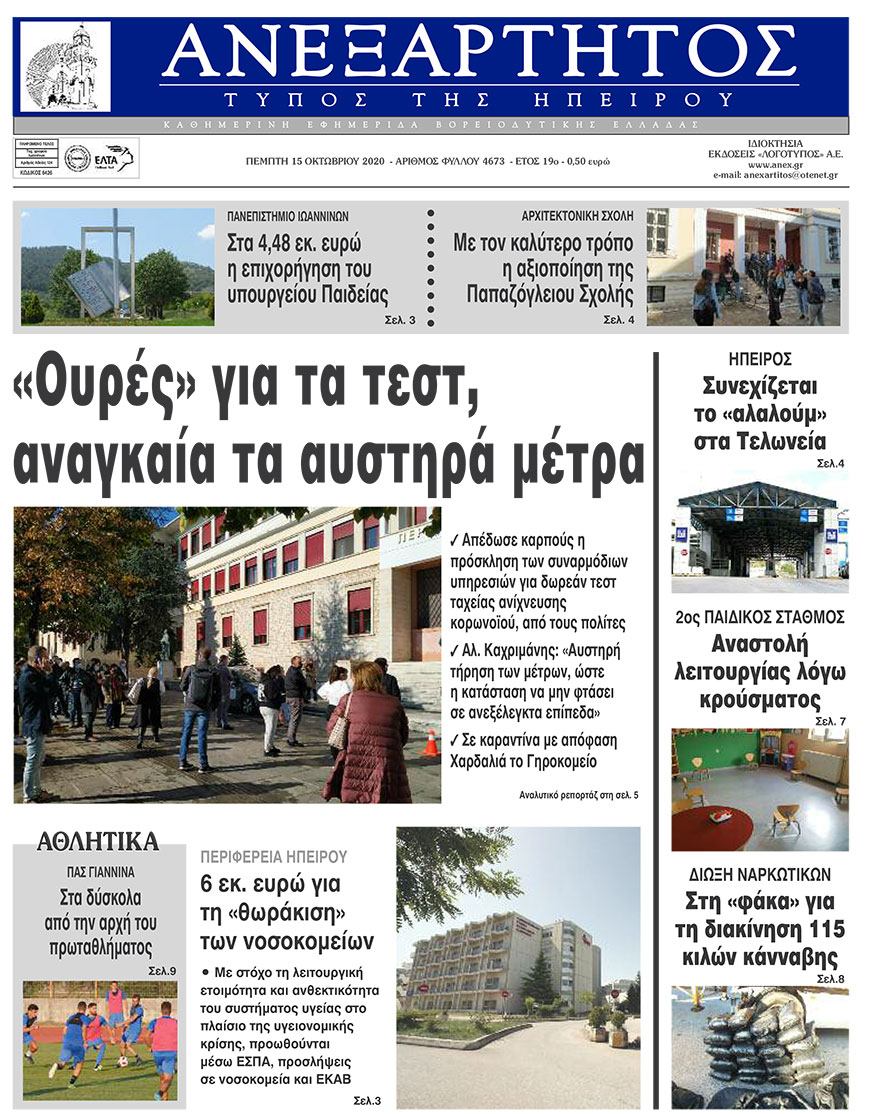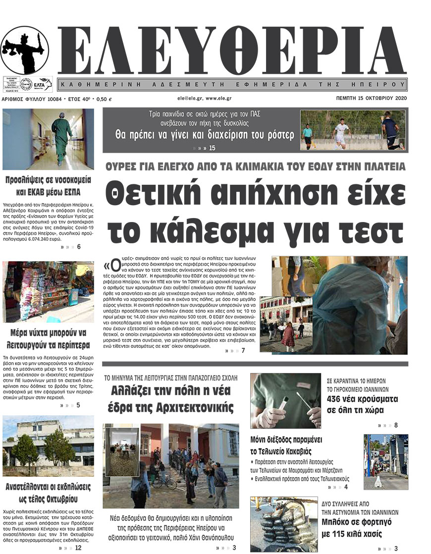 Διαβάστε στα πρωτοσέλιδα των γιαννιώτικων εφημερίδων της Πέμπτης 15 Οκτωβρίου