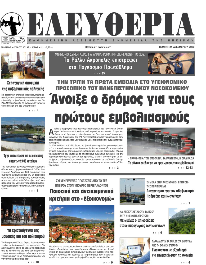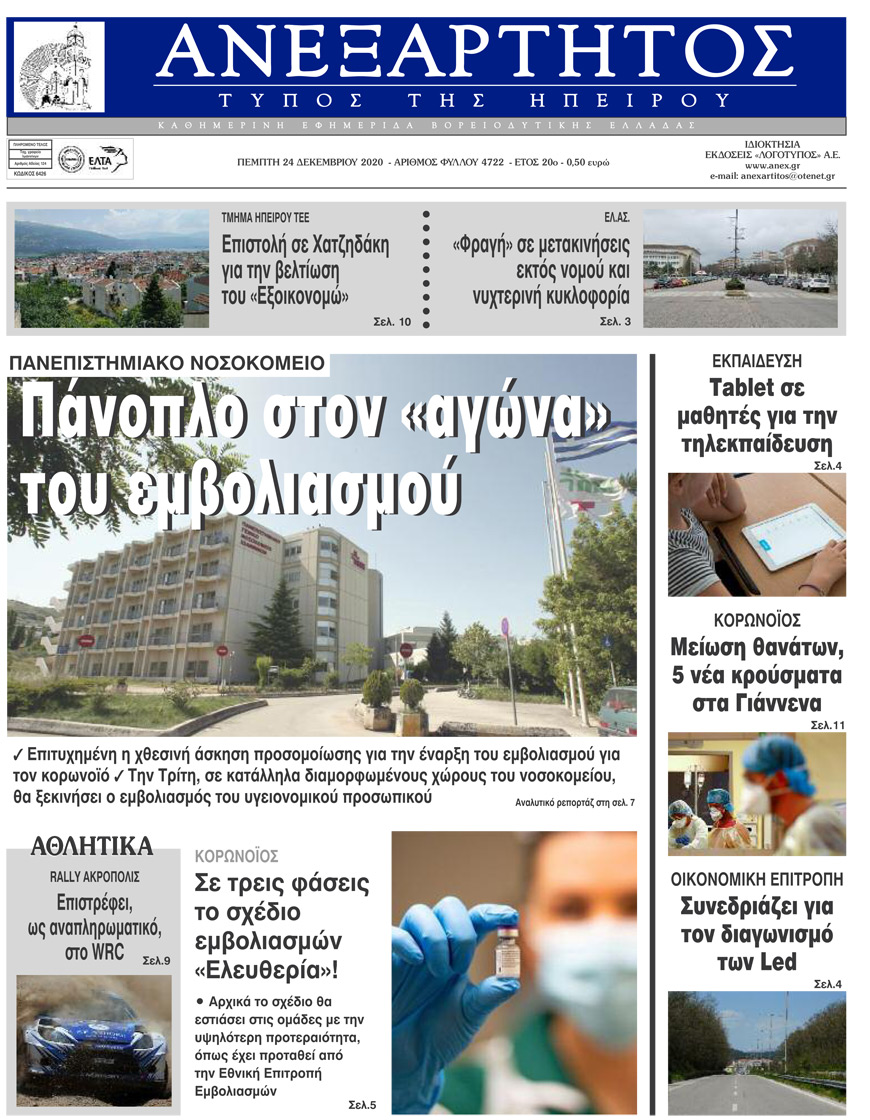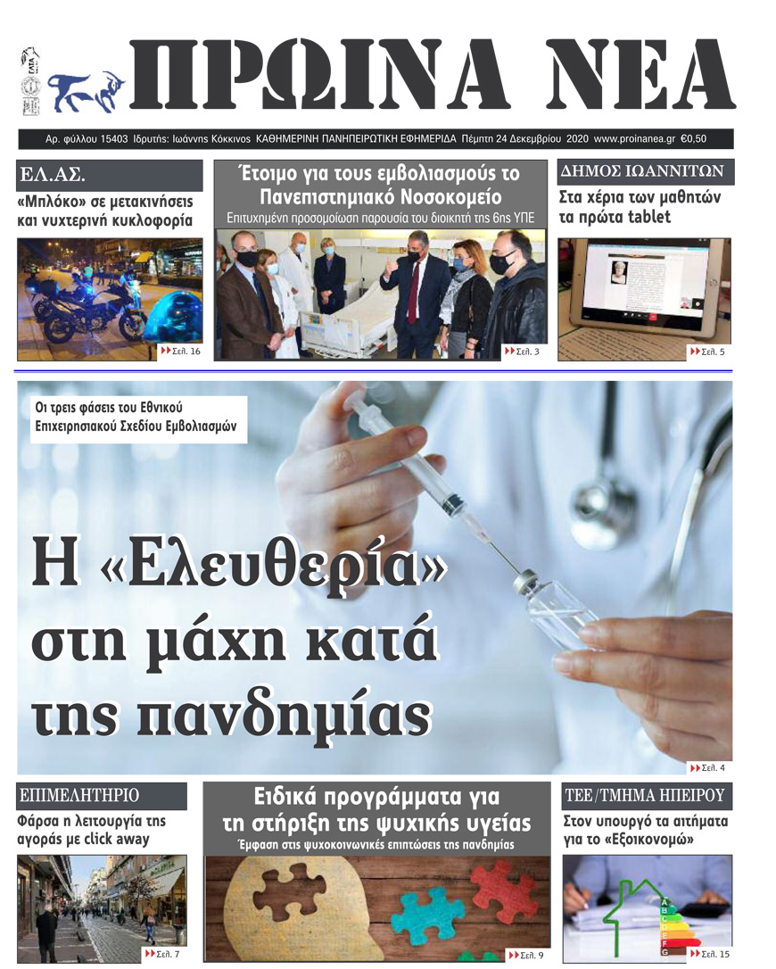 Διαβάστε στα πρωτοσέλιδα των γιαννιώτικων εφημερίδων της Πέμπτης 24 Δεκεμβρίου