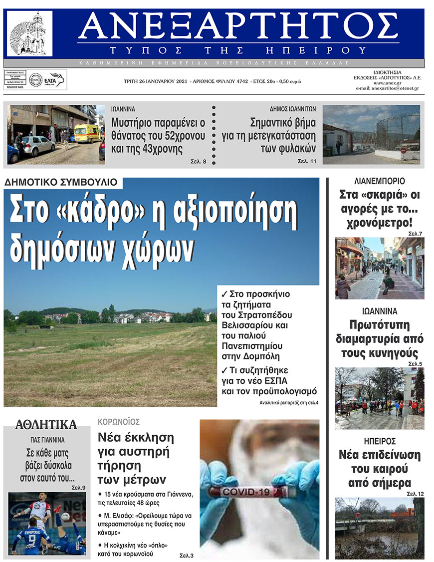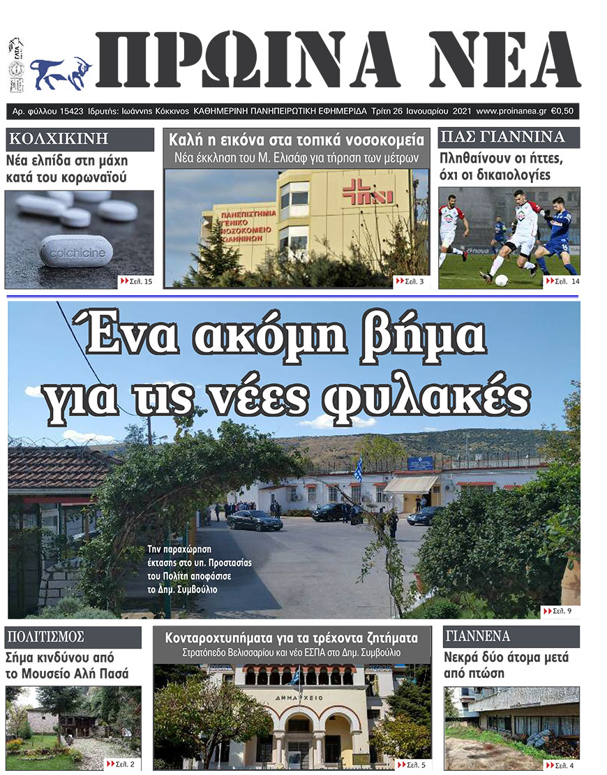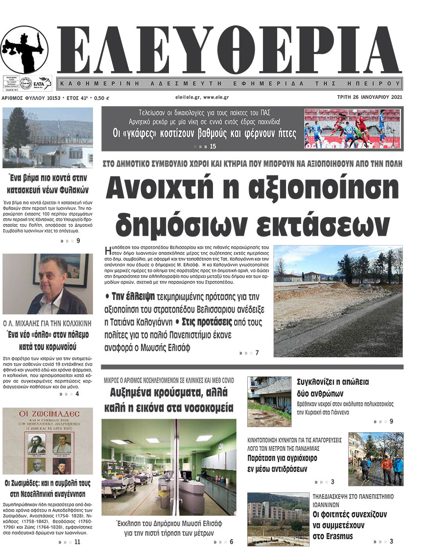 ΑρχικήTOP STORIES TOP STORIESΗΠΕΙΡΟΣ Τα πρωτοσέλιδα των γιαννιώτικων εφημερίδων 26.01.2021 72 FacebookTwitterWhatsAppEmailΤυπώνωViber Διαβάστε στα πρωτοσέλιδα των γιαννιώτικων εφημερίδων της Τρίτης 26 Ιανουαρίου TagsΓΙΑΝΝΙΩΤΙΚΕΣ ΕΦΗΜΕΡΙΔΕΣΠΡΩΤΟΣΕΛΙΔΑ FacebookTwitterWhatsAppEmailΤυπώνωViber Προηγούμενο άρθροΜόσιαλος: Τι ισχύει για το εμβόλιο κορωνοϊού και τα μωρά που θηλάζουνΕπόμενο άρθροΈνα βήμα πιο κοντά στην κατασκευή νέων Φυλακών ΣΧΕΤΙΚΑ ΑΡΘΡΑ Τα πρωτοσέλιδα των γιαννιώτικων εφημερίδων TOP STORIES 18.11.2025 Τα πρωτοσέλιδα των γιαννιώτικων εφημερίδων ΗΠΕΙΡΟΣ 15.11.2025 Τα πρωτοσέλιδα των γιαννιώτικων εφημερίδων ΗΠΕΙΡΟΣ 14.11.2025 Τα πρωτοσέλιδα των γιαννιώτικων εφημερίδων ΗΠΕΙΡΟΣ 13.11.2025 Τα πρωτοσέλιδα των γιαννιώτικων εφημερίδων ΗΠΕΙΡΟΣ 12.11.2025 Τα πρωτοσέλιδα των γιαννιώτικων εφημερίδων ΗΠΕΙΡΟΣ 11.11.2025 ΣΤΗΝ ΙΔΙΑ ΚΑΤΗΓΟΡΙΑ Προσβάσεις – ντροπή στα σχολεία στο Τσιφλικόπουλο ΗΠΕΙΡΟΣ 18.11.2025 Βελτίωση και επέκταση οριζόντιας σήμανσης ΗΠΕΙΡΟΣ 18.11.2025 Πράσινο φως για την κατασκευή νέου Νηπιαγωγείου στα Γιάννενα ΗΠΕΙΡΟΣ 18.11.2025 250.000 ευρώ για νέες ψηφιακές υπηρεσίες στον Δήμο Ιωαννιτών ΗΠΕΙΡΟΣ 18.11.2025 875.000 ευρώ για την αναβάθμιση υποδομών στο Κουτσελιό ΗΠΕΙΡΟΣ 18.11.2025 ΕΜΥ: Επικίνδυνες βροχές σε Ιόνιο, Ήπειρο και Αιτωλοακαρνανία ΗΠΕΙΡΟΣ 18.11.2025 ΜΗ ΧΑΣΕΤΕ Προσβάσεις – ντροπή στα σχολεία στο Τσιφλικόπουλο 250.000 ευρώ για νέες ψηφιακές υπηρεσίες στον Δήμο Ιωαννιτών ΕΜΥ: Επικίνδυνες βροχές σε Ιόνιο, Ήπειρο και Αιτωλοακαρνανία Στο επίκεντρο ακρίβεια, στεγαστική πολιτική και ενεργειακές συμφωνίες «Πάγωσε» το σχέδιο, όχι τα προβλήματα ΔΗΜΟΦΙΛΗ Συζήτηση για τις ανάγκες και τις προτεραιότητες του Δήμου Ζίτσας Αυξημένο πρωτογενές πλεόνασμα εμφάνισε ο προϋπολογισμός στο τέλος Οκτωβρίου 875.000 ευρώ για την αναβάθμιση υποδομών στο Κουτσελιό Μιχαηλίδου: Περισσότεροι οι δικαιούχοι στο πρόγραμμα «Σπίτι μου 2» Μικρότερα σχολικά τμήματα, καλύτερη εκπαίδευση