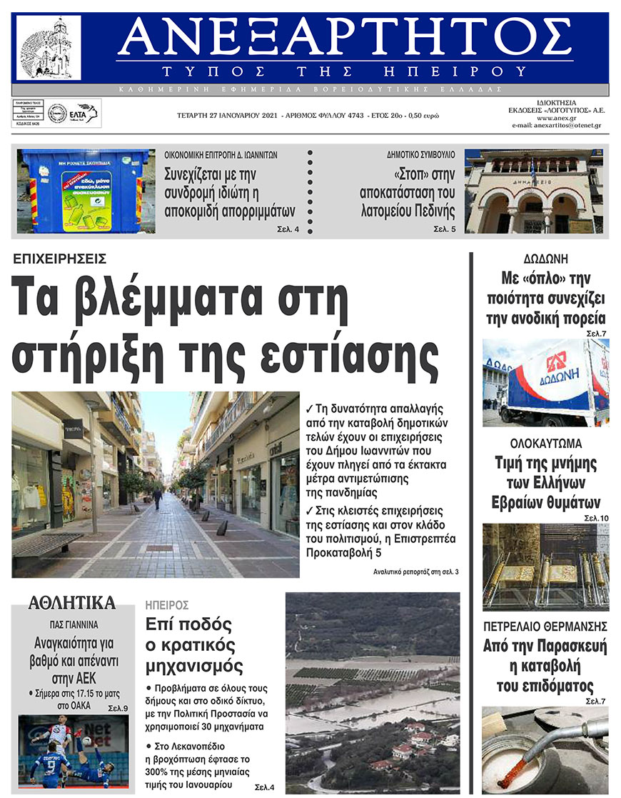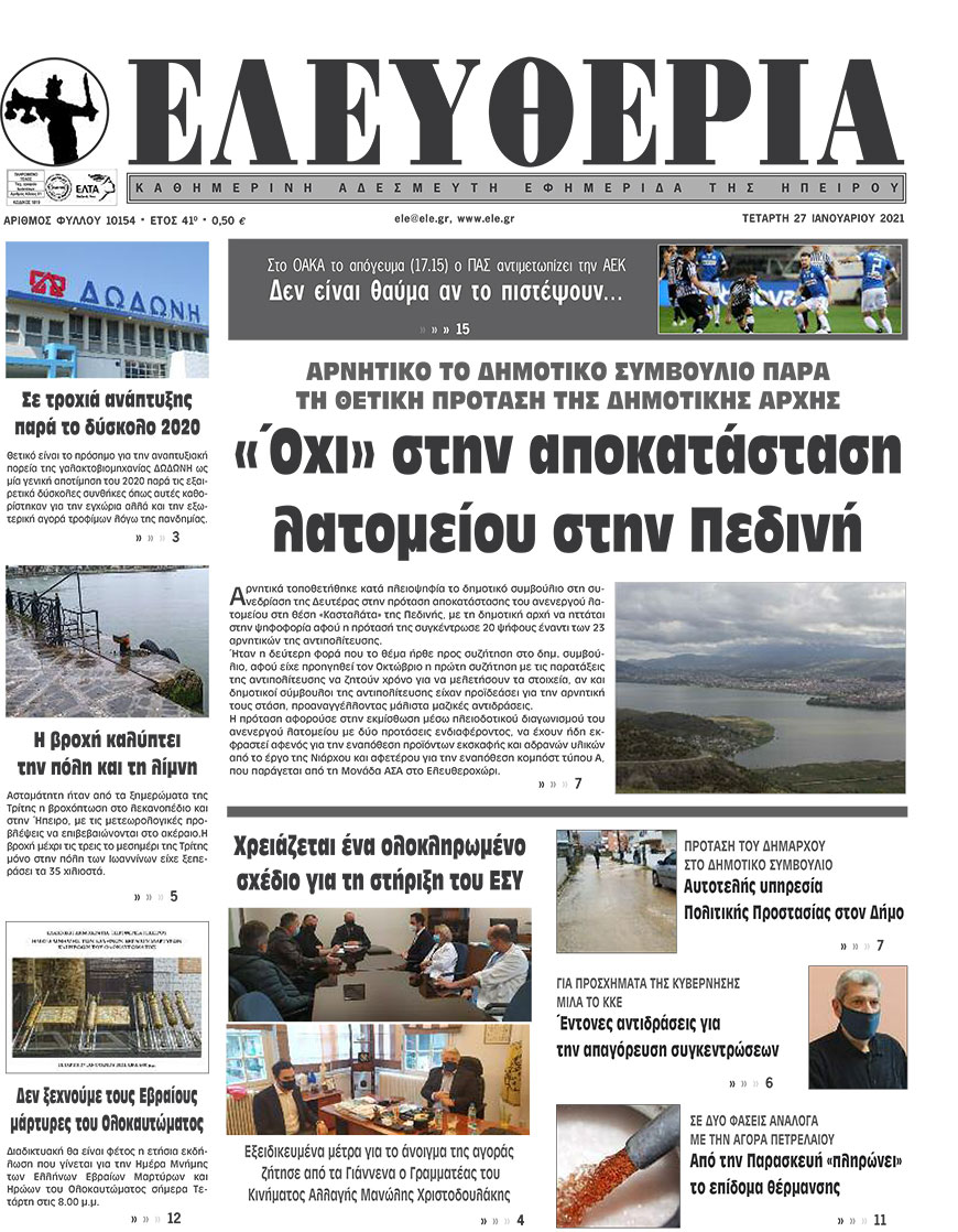 ΑρχικήTOP STORIES TOP STORIESΗΠΕΙΡΟΣ Τα πρωτοσέλιδα των γιαννιώτικων εφημερίδων 27.01.2021 103 FacebookTwitterWhatsAppEmailΤυπώνωViber Διαβάστε στα πρωτοσέλιδα των γιαννιώτικων εφημερίδων της Τετάρτης 27 Ιανουαρίου TagsΓΙΑΝΝΙΩΤΙΚΕΣ ΕΦΗΜΕΡΙΔΕΣΠΡΩΤΟΣΕΛΙΔΑ FacebookTwitterWhatsAppEmailΤυπώνωViber Προηγούμενο άρθροΣε τροχιά ανάπτυξης παρά το δύσκολο 2020Επόμενο άρθροΜάζια Ιωαννίνων: Λεωφορείο πήγαινε να παραλάβει μαθητές και γλίστρησε στον πάγο (φωτο) ΣΧΕΤΙΚΑ ΑΡΘΡΑ Τα πρωτοσέλιδα των γιαννιώτικων εφημερίδων ΗΠΕΙΡΟΣ 22.11.2025 Τα πρωτοσέλιδα των γιαννιώτικων εφημερίδων ΗΠΕΙΡΟΣ 21.11.2025 Τα πρωτοσέλιδα των γιαννιώτικων εφημερίδων TOP STORIES 20.11.2025 Τα πρωτοσέλιδα των γιαννιώτικων εφημερίδων ΗΠΕΙΡΟΣ 19.11.2025 Τα πρωτοσέλιδα των γιαννιώτικων εφημερίδων ΗΠΕΙΡΟΣ 18.11.2025 Τα πρωτοσέλιδα των γιαννιώτικων εφημερίδων ΗΠΕΙΡΟΣ 15.11.2025 ΣΤΗΝ ΙΔΙΑ ΚΑΤΗΓΟΡΙΑ Άμεση στήριξη υποσχέθηκε ο Χρ. Δήμας για τα Τζουμέρκα ΗΠΕΙΡΟΣ 24.11.2025 Ήδη σε κατάσταση έκτακτης ανάγκης ο Δήμος Βορείων Τζουμέρκων ΗΠΕΙΡΟΣ 24.11.2025 Κυκλοφοριακές ρυθμίσεις λόγω εργασιών αποκατάστασης στον Δήμο Ζηρού ΗΠΕΙΡΟΣ 24.11.2025 Σύλληψη φυγόποινου για φοροδιαφυγή ΗΠΕΙΡΟΣ 24.11.2025 Συνελήφθη αλλοδαπός με ένταλμα στη Θεσπρωτία ΗΠΕΙΡΟΣ 24.11.2025 Αντίστροφη μέτρηση για το εορταστικό ωράριο Χριστουγέννων TOP STORIES 24.11.2025 ΜΗ ΧΑΣΕΤΕ Άμεση στήριξη υποσχέθηκε ο Χρ. Δήμας για τα Τζουμέρκα Έκτακτο δελτίο καιρού: Ισχυρή κακοκαιρία από την Τρίτη με βροχές και καταιγίδες Πρόοδος στις διαπραγματεύσεις για το αμερικανικό σχέδιο ειρήνης Αντίστροφη μέτρηση για το εορταστικό ωράριο Χριστουγέννων Επίδομα 250 ευρώ: Ποιοι πληρώνονται – Αναλυτικά τα κριτήρια ΔΗΜΟΦΙΛΗ Μητσοτάκης: Καμία συμφωνία χωρίς την Ουκρανία Υπ. Περιβάλλοντος: 1,1 δισ. ευρώ για προγράμματα εξοικονόμησης το τελευταίο 15νθήμερο Σεισμός 4,2 Ρίχτερ στην Καρδίτσα Πρόοδος στις διαπραγματεύσεις για το αμερικανικό σχέδιο ειρήνης Ήδη σε κατάσταση έκτακτης ανάγκης ο Δήμος Βορείων Τζουμέρκων