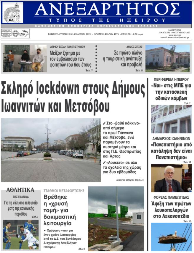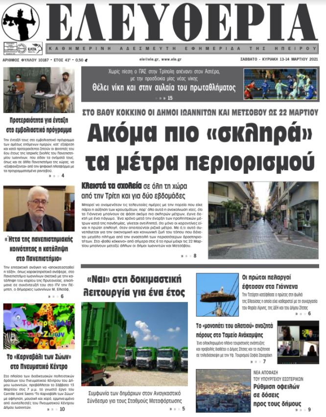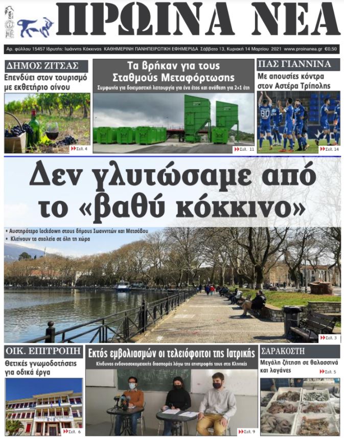ΑρχικήTOP STORIES TOP STORIESΗΠΕΙΡΟΣ Τα πρωτοσέλιδα των γιαννιώτικων εφημερίδων 13.03.2021 112 FacebookTwitterWhatsAppEmailΤυπώνωViber Διαβάστε στα πρωτοσέλιδα των γιαννιώτικων εφημερίδων του Σαββατοκύριακου 13-14 Μαρτίου TagsΓΙΑΝΝΙΩΤΙΚΕΣ ΕΦΗΜΕΡΙΔΕΣΠΡΩΤΟΣΕΛΙΔΑ FacebookTwitterWhatsAppEmailΤυπώνωViber Προηγούμενο άρθροΕλλάδα και Ισπανία πρωτοπόροι στο Ταμείο ΑνάκαμψηςΕπόμενο άρθροΔράση Ευαισθητοποίησης και Ενημέρωσης για την Κατάθλιψη ΣΧΕΤΙΚΑ ΑΡΘΡΑ Τα πρωτοσέλιδα των γιαννιώτικων εφημερίδων TOP STORIES 14.11.2025 Τα πρωτοσέλιδα των γιαννιώτικων εφημερίδων ΗΠΕΙΡΟΣ 13.11.2025 Τα πρωτοσέλιδα των γιαννιώτικων εφημερίδων ΗΠΕΙΡΟΣ 12.11.2025 Τα πρωτοσέλιδα των γιαννιώτικων εφημερίδων ΗΠΕΙΡΟΣ 11.11.2025 Τα πρωτοσέλιδα των γιαννιώτικων εφημερίδων TOP STORIES 08.11.2025 Τα πρωτοσέλιδα των γιαννιώτικων εφημερίδων ΗΠΕΙΡΟΣ 07.11.2025 ΣΤΗΝ ΙΔΙΑ ΚΑΤΗΓΟΡΙΑ ΑΠΟ ΤΗΝ ΠΕΡΙΦΕΡΕΙΑ -Συστάσεις λόγω υψηλών συγκεντρώσεων αιωρούμενων σωματιδίων ΗΠΕΙΡΟΣ 15.11.2025 Εκλογή του Παναγιώτη Σουκάκου στην Ακαδημία Αθηνών ΗΠΕΙΡΟΣ 14.11.2025 Εντυπωσιακό το αποτέλεσμα της αναστήλωσης στο τζαμί Καλούτσανης ΗΠΕΙΡΟΣ 14.11.2025 Παγκόσμια Ημέρα Προωρότητας: Μήνυμα ευαισθητοποίησης από το «Χατζηκώστα» και τον Δήμο Ιωαννιτών ΗΠΕΙΡΟΣ 14.11.2025 Ηγουμενίτσα: Κατασχέθηκαν πάνω από 350 κιλά κάνναβης σε κοινή επιχείρηση Λιμενικού και Δίωξης ΗΠΕΙΡΟΣ 14.11.2025 Άρτα: Σύλληψη για επικίνδυνη οδήγηση και σωματική βλάβη από αμέλεια ΗΠΕΙΡΟΣ 14.11.2025 ΜΗ ΧΑΣΕΤΕ Εντυπωσιακό το αποτέλεσμα της αναστήλωσης στο τζαμί Καλούτσανης Ενιαίο αστικό πάρκο στις παλιές στρατιωτικές φυλακές Τα πρωτοσέλιδα των γιαννιώτικων εφημερίδων Επιχείρηση της Αστυνομίας Ιωαννίνων στον Πειραιά – Σύλληψη για ναρκωτικά και οπλισμό Δένδρο στην πλατεία, συναυλία στο Πνευματικό Κέντρο; ΔΗΜΟΦΙΛΗ Σέρρες: Ποινές φυλάκισης στους 30 μετανάστες για τα επεισόδια σε δομή Πάνω από 50 αγελάδες πέθαναν σε πλοίο που τις μετέφερε στην Τουρκία ΑΠΟ ΤΗΝ ΠΕΡΙΦΕΡΕΙΑ -Συστάσεις λόγω υψηλών συγκεντρώσεων αιωρούμενων σωματιδίων Ο «χάρτης» των πληρωμών από e-ΕΦΚΑ, ΔΥΠΑ από 17 έως 21 Νοεμβρίου