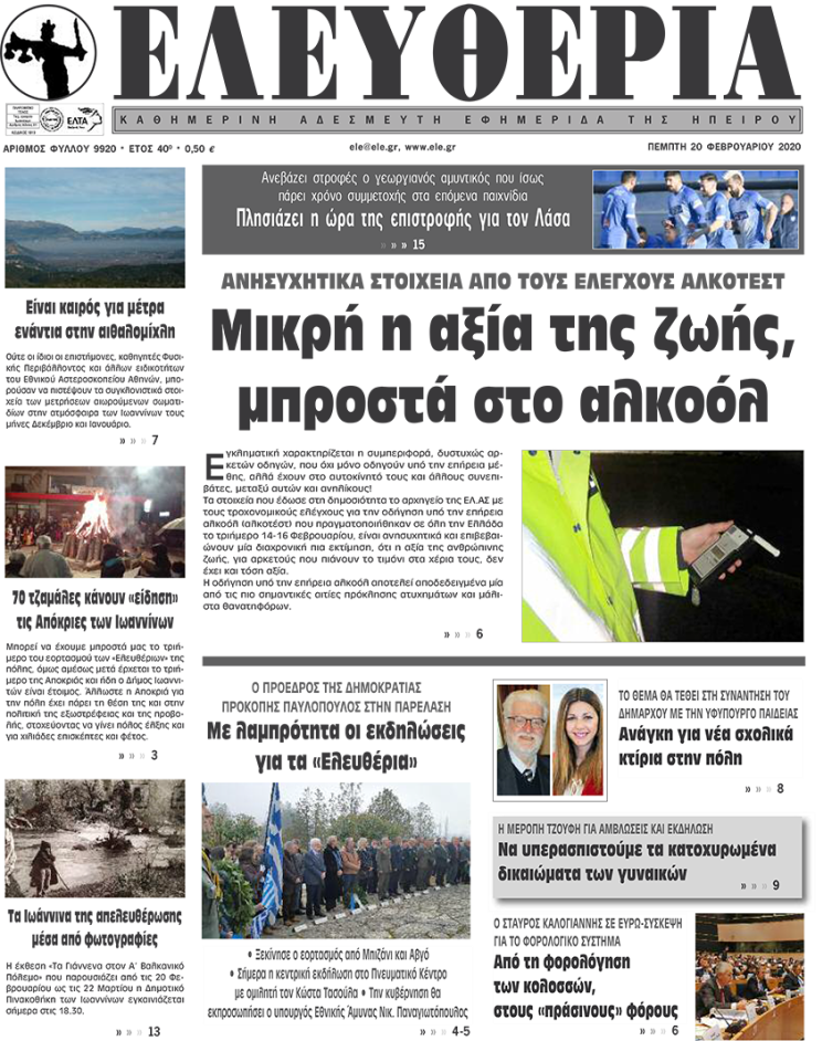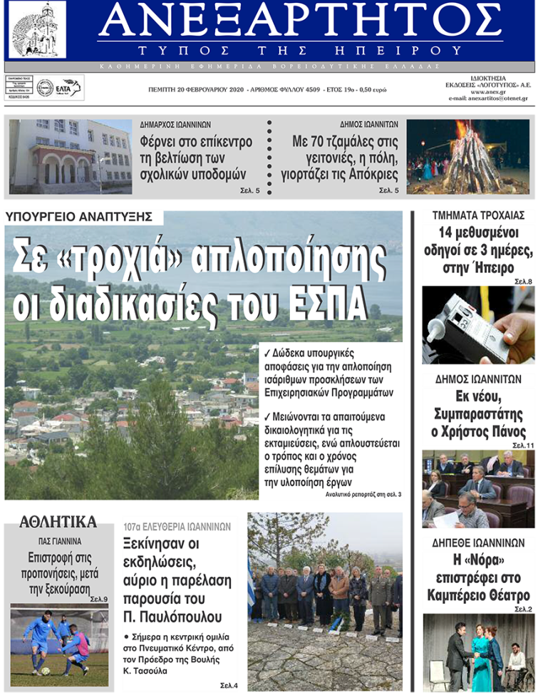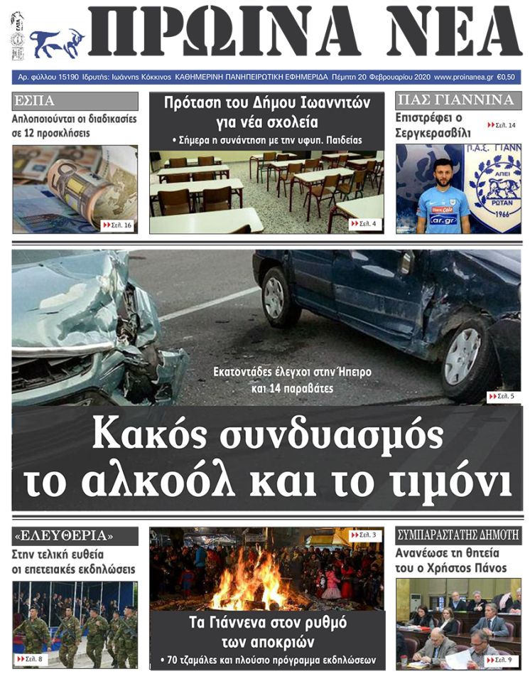 Διαβάστε στα πρωτοσέλιδα των γιαννιώτικων εφημερίδων σήμερα, Πέμπτη 20 Φεβρουαρίου.