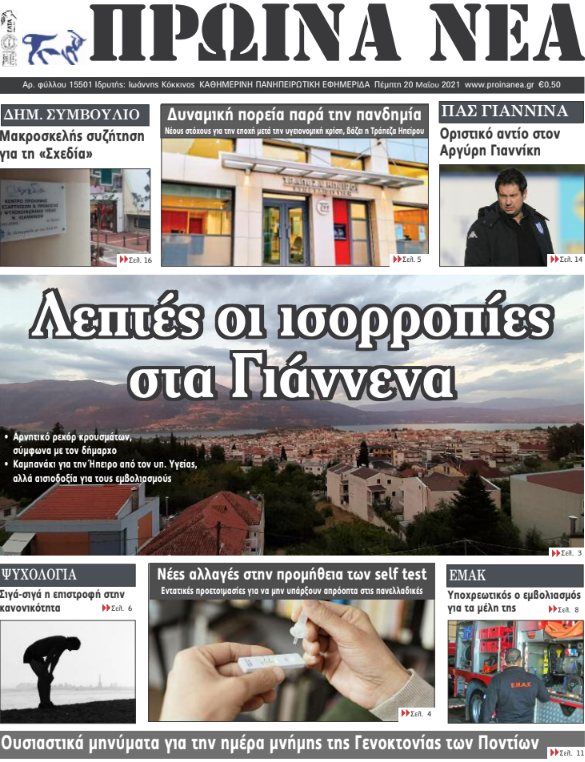 Διαβάστε στα πρωτοσέλιδα των γιαννιώτικων εφημερίδων της Πέμπτης 20 Μαΐου