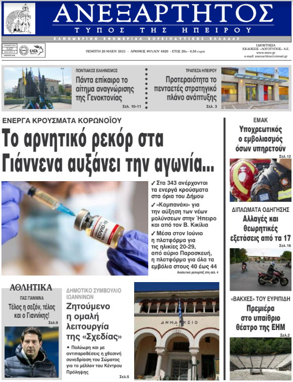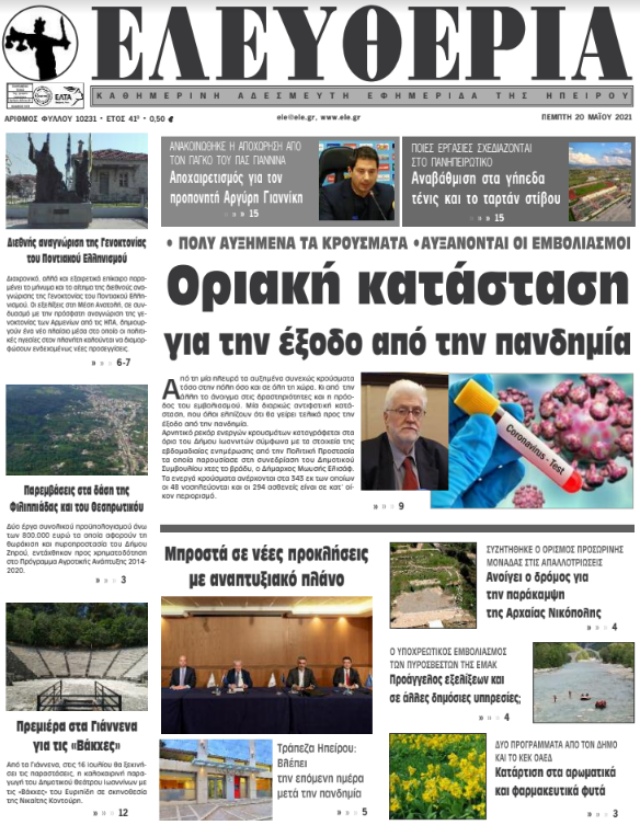 Διαβάστε στα πρωτοσέλιδα των γιαννιώτικων εφημερίδων της Πέμπτης 20 Μαΐου