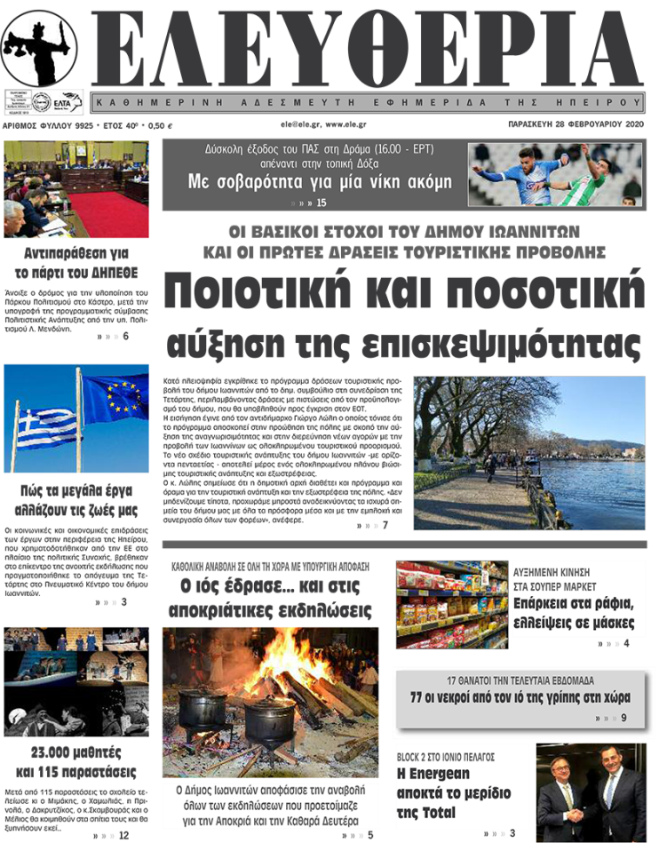 ΑρχικήΕΙΔΗΣΕΙΣΗΠΕΙΡΟΣ ΗΠΕΙΡΟΣ Τα πρωτοσέλιδα των γιαννιώτικων εφημερίδων 28.02.2020 246 FacebookTwitterWhatsAppEmailΤυπώνωViber Διαβάστε στα πρωτοσέλιδα των γιαννιώτικων εφημερίδων σήμερα, Παρασκευή 28 Φεβρουαρίου. TagsΓΙΑΝΝΙΩΤΙΚΕΣ ΕΦΗΜΕΡΙΔΕΣΠΡΩΤΟΣΕΛΙΔΑ FacebookTwitterWhatsAppEmailΤυπώνωViber Προηγούμενο άρθρο25 εικαστικοί με αναπηρία «Ταξιδεύουν την Τέχνη» στα ΙωάννιναΕπόμενο άρθροΤα Διαχειριστικά Σχέδια Βόσκησης απασχολούν τη Βουλή ΣΧΕΤΙΚΑ ΑΡΘΡΑ Τα πρωτοσέλιδα των γιαννιώτικων εφημερίδων TOP STORIES 14.01.2026 Τα πρωτοσέλιδα των γιαννιώτικων εφημερίδων ΗΠΕΙΡΟΣ 13.01.2026 Τα πρωτοσέλιδα των γιαννιώτικων εφημερίδων ΗΠΕΙΡΟΣ 11.01.2026 Τα πρωτοσέλιδα των γιαννιώτικων εφημερίδων ΗΠΕΙΡΟΣ 09.01.2026 Τα πρωτοσέλιδα των γιαννιώτικων εφημερίδων ΗΠΕΙΡΟΣ 08.01.2026 Τα πρωτοσέλιδα των γιαννιώτικων εφημερίδων ΗΠΕΙΡΟΣ 06.01.2026 ΣΤΗΝ ΙΔΙΑ ΚΑΤΗΓΟΡΙΑ Μήνυμα προσφοράς από την εθελοντική αιμοδοσία στην ενορία Περιβλέπτου ΗΠΕΙΡΟΣ 14.01.2026 Παράταση των εργασιών μέχρι τον Σεπτέμβριο ΗΠΕΙΡΟΣ 14.01.2026 Πυρ ομαδόν για τις περιβαλλοντικές επιπτώσεις ΗΠΕΙΡΟΣ 14.01.2026 Στην αγορά για αναζήτηση χώρων στάθμευσης ΗΠΕΙΡΟΣ 14.01.2026 «Οδηγός» για το Βελισσάριο, το Πάρκο Πυρσινέλλα ΗΠΕΙΡΟΣ 14.01.2026 Νικητής ο Δήμος στο μπρα ντε φερ με την Περιφέρεια ΗΠΕΙΡΟΣ 14.01.2026 ΜΗ ΧΑΣΕΤΕ Πυρ ομαδόν για τις περιβαλλοντικές επιπτώσεις Στην αγορά για αναζήτηση χώρων στάθμευσης «Οδηγός» για το Βελισσάριο, το Πάρκο Πυρσινέλλα Νικητής ο Δήμος στο μπρα ντε φερ με την Περιφέρεια Γ. Πρέντζας στον Α. Καχριμάνη: «Ένα ρουσφέτι είναι πάρτο πίσω!» ΔΗΜΟΦΙΛΗ Κρίσιμο τεστ επιβίωσης στην Καβάλα για τον ΠΑΣ Γιάννινα Τα πρωτοσέλιδα των γιαννιώτικων εφημερίδων Παράταση των εργασιών μέχρι τον Σεπτέμβριο Στην αγορά για αναζήτηση χώρων στάθμευσης Νικητής ο Δήμος στο μπρα ντε φερ με την Περιφέρεια