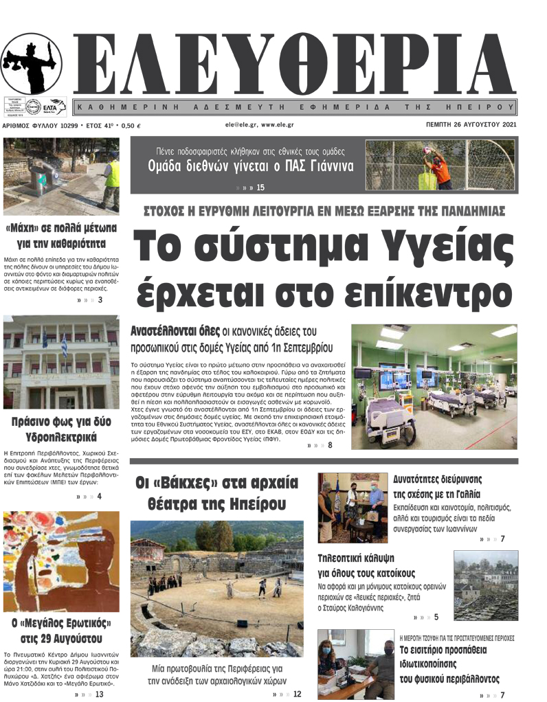 ΑρχικήTOP STORIES TOP STORIESΗΠΕΙΡΟΣ Τα πρωτοσέλιδα των γιαννιώτικων εφημερίδων 26.08.2021 100 FacebookTwitterWhatsAppEmailΤυπώνωViber Διαβάστε στα πρωτοσέλιδα των γιαννιώτικων εφημερίδων της Πέμπτης 26 Αυγούστου TagsΓΙΑΝΝΙΩΤΙΚΕΣ ΕΦΗΜΕΡΙΔΕΣΠΡΩΤΟΣΕΛΙΔΑ FacebookTwitterWhatsAppEmailΤυπώνωViber Προηγούμενο άρθροΕκδήλωση αποχαιρετισμού για το Θερινό ΜαντείοΕπόμενο άρθροΣυνελήφθη για κατοχή ηρωίνης, επικίνδυνη οδήγηση και απείθεια ΣΧΕΤΙΚΑ ΑΡΘΡΑ Τα πρωτοσέλιδα των γιαννιώτικων εφημερίδων TOP STORIES 31.12.2025 Τα πρωτοσέλιδα των γιαννιώτικων εφημερίδων ΗΠΕΙΡΟΣ 30.12.2025 Τα πρωτοσέλιδα των γιαννιώτικων εφημερίδων ΗΠΕΙΡΟΣ 24.12.2025 Τα πρωτοσέλιδα των γιαννιώτικων εφημερίδων ΗΠΕΙΡΟΣ 23.12.2025 Τα πρωτοσέλιδα των γιαννιώτικων εφημερίδων ΗΠΕΙΡΟΣ 19.12.2025 Τα πρωτοσέλιδα των γιαννιώτικων εφημερίδων ΗΠΕΙΡΟΣ 18.12.2025 ΣΤΗΝ ΙΔΙΑ ΚΑΤΗΓΟΡΙΑ ΓΙΑΝΝΗΣ ΣΤΕΦΟΣ – Βολές κατά Καχριμάνη για τη «φωτογραφική» πρόσληψη ΗΠΕΙΡΟΣ 31.12.2025 Παράταση αγωνίας για τους αντιδημάρχους ΗΠΕΙΡΟΣ 31.12.2025 Πρωτοχρονιάτικα κάλαντα στο Δημαρχείο Ιωαννίνων ΗΠΕΙΡΟΣ 31.12.2025 Τα κάλαντα της Πρωτοχρονιάς στην Περιφέρεια Ηπείρου ΗΠΕΙΡΟΣ 31.12.2025 Νέες διαδρομές περιήγησης στον αρχαιολογικό χώρο της Νικόπολης ΗΠΕΙΡΟΣ 31.12.2025 Η παιδική χορωδία του Δήμου Ζίτσας έψαλλε τα πρωτοχρονιάτικα κάλαντα ΗΠΕΙΡΟΣ 31.12.2025 ΜΗ ΧΑΣΕΤΕ ΓΙΑΝΝΗΣ ΣΤΕΦΟΣ – Βολές κατά Καχριμάνη για τη «φωτογραφική» πρόσληψη Παράταση αγωνίας για τους αντιδημάρχους Νέες διαδρομές περιήγησης στον αρχαιολογικό χώρο της Νικόπολης Εγνατία Οδός: Αυξάνονται τα διόδια, καταργείται το EgnatiaPass Αυξήσεις στα διόδια από 1η Ιανουαρίου 2026 ΔΗΜΟΦΙΛΗ ΓΙΑΝΝΗΣ ΣΤΕΦΟΣ – Βολές κατά Καχριμάνη για τη «φωτογραφική» πρόσληψη Τσιάρας: Κλείνει η χρονιά με ενισχύσεις στον πρωτογενή τομέα και νέα μέτρα στήριξης Τα του Καίσαρος… ΑΡΚΤΟΥΡΟΣ: Πρώτο ασθενοφόρο άγριων θηλαστικών στη χώρα Μεγάλες προσωπικότητες που έφυγαν από τη ζωή το 2025