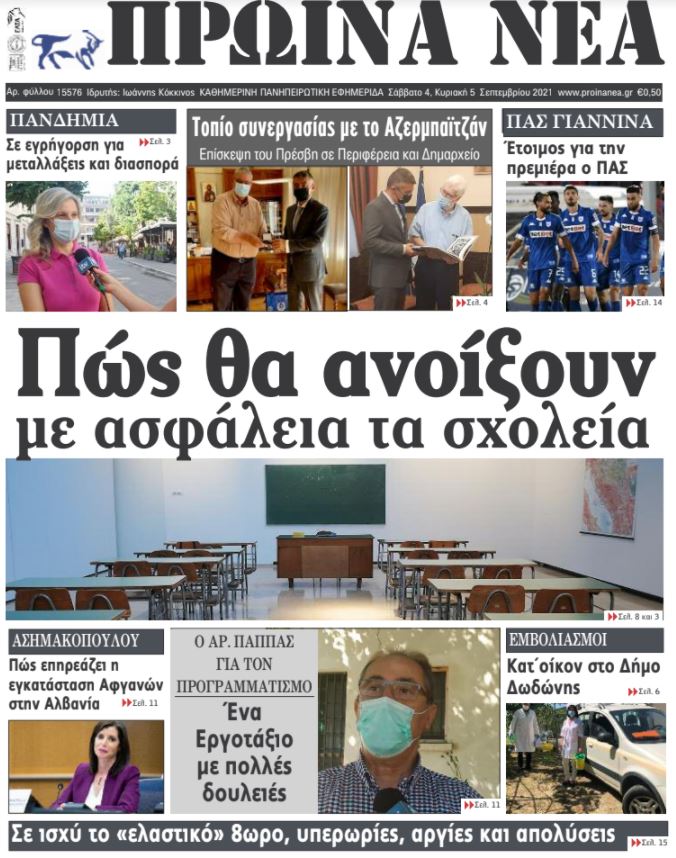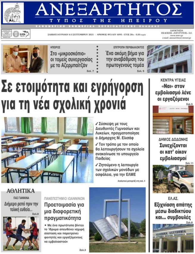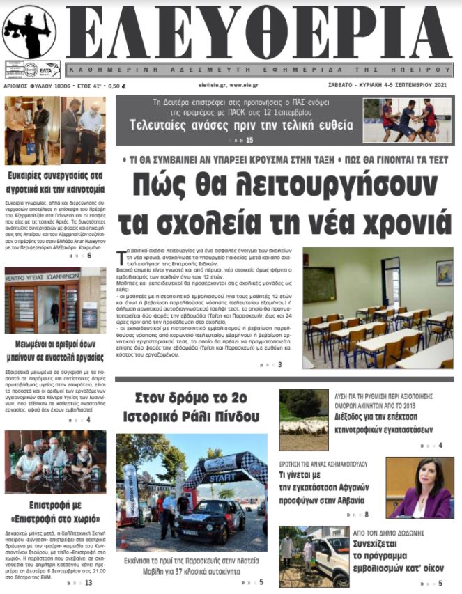 ΑρχικήTOP STORIES TOP STORIESΗΠΕΙΡΟΣ Τα πρωτοσέλιδα των γιαννιώτικων εφημερίδων 04.09.2021 58 FacebookTwitterWhatsAppEmailΤυπώνωViber Διαβάστε στα πρωτοσέλιδα των γιαννιώτικων εφημερίδων του Σαββατοκύριακου 4-5 Σεπτεμβρίου TagsΓΙΑΝΝΙΩΤΙΚΕΣ ΕΦΗΜΕΡΙΔΕΣΠΡΩΤΟΣΕΛΙΔΑ FacebookTwitterWhatsAppEmailΤυπώνωViber Προηγούμενο άρθροΔΗΜΟΣ ΑΡΤΑΙΩΝ-Έξι χιλιόμετρα ασφαλτοστρώσεων σε Πλησιούς και ΚιρκιζάτεςΕπόμενο άρθρο«Βαριά» πρόστιμα σε κομμωτήριο και καφενείο για μη τήρηση των μέτρων ΣΧΕΤΙΚΑ ΑΡΘΡΑ Τα πρωτοσέλιδα των γιαννιώτικων εφημερίδων ΗΠΕΙΡΟΣ 22.11.2025 Τα πρωτοσέλιδα των γιαννιώτικων εφημερίδων ΗΠΕΙΡΟΣ 21.11.2025 Τα πρωτοσέλιδα των γιαννιώτικων εφημερίδων TOP STORIES 20.11.2025 Τα πρωτοσέλιδα των γιαννιώτικων εφημερίδων ΗΠΕΙΡΟΣ 19.11.2025 Τα πρωτοσέλιδα των γιαννιώτικων εφημερίδων ΗΠΕΙΡΟΣ 18.11.2025 Τα πρωτοσέλιδα των γιαννιώτικων εφημερίδων ΗΠΕΙΡΟΣ 15.11.2025 ΣΤΗΝ ΙΔΙΑ ΚΑΤΗΓΟΡΙΑ Αντίστροφη μέτρηση για το εορταστικό ωράριο Χριστουγέννων TOP STORIES 24.11.2025 Πτώση της θερμοκρασίας και τοπικές νεφώσεις – Ο καιρός της εβδομάδας TOP STORIES 24.11.2025 Ο «χάρτης» των πληρωμών από τον e-ΕΦΚΑ και τη ΔΥΠΑ έως τις 28 Νοεμβρίου TOP STORIES 24.11.2025 Με νέα γραμματεία και νέο κανονισμό λειτουργίας η «Ενότητα Πολιτών Νέα Γιάννενα» ΗΠΕΙΡΟΣ 24.11.2025 Σε κατάσταση έκτακτης ανάγκης ο Δήμος Ιωαννιτών ΗΠΕΙΡΟΣ 24.11.2025 Τροχαίο με δύο τραυματίες στην Καστρίτσα από εκτροπή ΙΧ ΗΠΕΙΡΟΣ 23.11.2025 ΜΗ ΧΑΣΕΤΕ Πρόοδος στις διαπραγματεύσεις για το αμερικανικό σχέδιο ειρήνης Αντίστροφη μέτρηση για το εορταστικό ωράριο Χριστουγέννων Επίδομα 250 ευρώ: Ποιοι πληρώνονται σήμερα – Αναλυτικά τα κριτήρια Πτώση της θερμοκρασίας και τοπικές νεφώσεις – Ο καιρός της εβδομάδας Ο «χάρτης» των πληρωμών από τον e-ΕΦΚΑ και τη ΔΥΠΑ έως τις 28 Νοεμβρίου ΔΗΜΟΦΙΛΗ Αντίστροφη μέτρηση για το εορταστικό ωράριο Χριστουγέννων Ο Κυρ. Μητσοτάκης σε έκτακτη τηλεδιάσκεψη για την Ουκρανία Ο «χάρτης» των πληρωμών από τον e-ΕΦΚΑ και τη ΔΥΠΑ έως τις 28 Νοεμβρίου Πτώση της θερμοκρασίας και τοπικές νεφώσεις – Ο καιρός της εβδομάδας Μητσοτάκης: «Η χώρα, από έναν περιφερειακό παίκτη σε θέματα ενέργειας, καθίσταται πρωταγωνιστής»