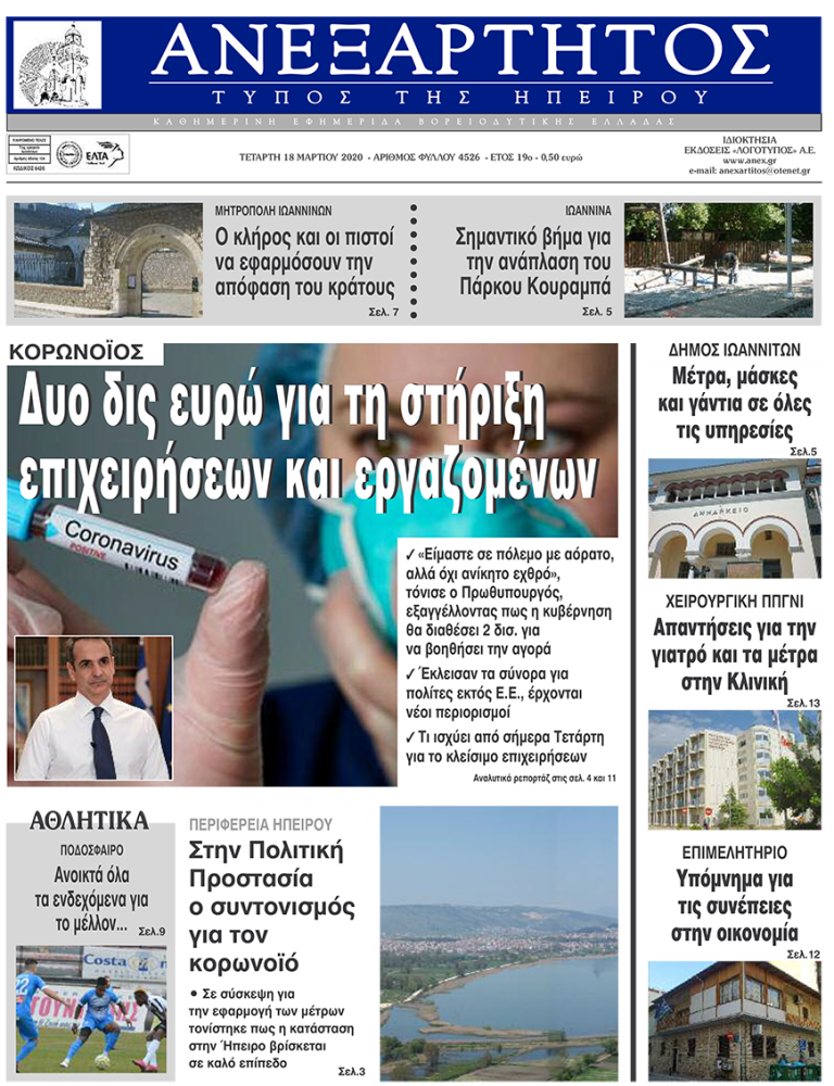 ΑρχικήΕΙΔΗΣΕΙΣΗΠΕΙΡΟΣ ΗΠΕΙΡΟΣ Τα πρωτοσέλιδα των γιαννιώτικων εφημερίδων 18.03.2020 244 FacebookTwitterWhatsAppEmailΤυπώνωViber Διαβάστε σήμερα στα πρωτοσέλιδα των γιαννιώτικων εφημερίδων σήμερα, Τετάρτη 18 Μαρτίου. TagsΓΙΑΝΝΙΩΤΙΚΕΣ ΕΦΗΜΕΡΙΔΕΣΠΡΩΤΟΣΕΛΙΔΑ FacebookTwitterWhatsAppEmailΤυπώνωViber Προηγούμενο άρθροΚλειστά τα σύνορα της Ευρώπης για ένα μήναΕπόμενο άρθροΒρέθηκε άλμπουμ με φωτογραφίες γυναίκας με διάσημους ηθοποιούς ΣΧΕΤΙΚΑ ΑΡΘΡΑ Τα πρωτοσέλιδα των γιαννιώτικων εφημερίδων TOP STORIES 06.11.2025 Τα πρωτοσέλιδα των γιαννιώτικων εφημερίδων ΗΠΕΙΡΟΣ 05.11.2025 Τα πρωτοσέλιδα των γιαννιώτικων εφημερίδων ΗΠΕΙΡΟΣ 04.11.2025 Τα πρωτοσέλιδα των γιαννιώτικων εφημερίδων TOP STORIES 01.11.2025 Τα πρωτοσέλιδα των γιαννιώτικων εφημερίδων ΗΠΕΙΡΟΣ 31.10.2025 Τα πρωτοσέλιδα των γιαννιώτικων εφημερίδων ΗΠΕΙΡΟΣ 30.10.2025 ΣΤΗΝ ΙΔΙΑ ΚΑΤΗΓΟΡΙΑ Επιστροφή των εργαζομένων του «Γαλαξία» στις θέσεις τους ΗΠΕΙΡΟΣ 06.11.2025 Διαμαρτυρία των εργαζόμενων σε τουρισμό – επισιτισμό ΗΠΕΙΡΟΣ 06.11.2025 Καταγγελία της ΕΙΝΗ για τα «εντέλλεσθε» της 6ης ΥΠΕ ΗΠΕΙΡΟΣ 06.11.2025 Τα πρωτοσέλιδα των γιαννιώτικων εφημερίδων TOP STORIES 06.11.2025 «Άναψε πράσινο» για Σωφρονιστικό Κατάστημα στους Φιλιάτες ΗΠΕΙΡΟΣ 05.11.2025 206 πυρκαγιές με 61.000 καμένα στρέμματα στην Ήπειρο ΗΠΕΙΡΟΣ 05.11.2025 ΜΗ ΧΑΣΕΤΕ Υπεγράφη συμφωνία Energean, ExxonMobil και Helleniq Energy για γεώτρηση υδρογονανθράκων στο Ιόνιο Τα πρωτοσέλιδα των γιαννιώτικων εφημερίδων «Άναψε πράσινο» για Σωφρονιστικό Κατάστημα στους Φιλιάτες 206 πυρκαγιές με 61.000 καμένα στρέμματα στην Ήπειρο Κινητοποιήσεις για τα ΕΛΤΑ σε Μέτσοβο – Καναλάκι ΔΗΜΟΦΙΛΗ Εκδήλωση στην Ήπειρο για την Ευρωπαϊκή Ημέρα Γλωσσών Διαμαρτυρία των εργαζόμενων σε τουρισμό – επισιτισμό Μαρινάκης: Ο Νοέμβριος, μήνας πληρωμών για τους αγρότες – – Μειώσεις φόρων για όλους με το νέο φορολογικό Παρίστανε την αστυνομικό και απέσπασε 100.000 ευρώ από 57χρονη Συντριβή αεροσκάφους στις ΗΠΑ: Στους 12 οι νεκροί