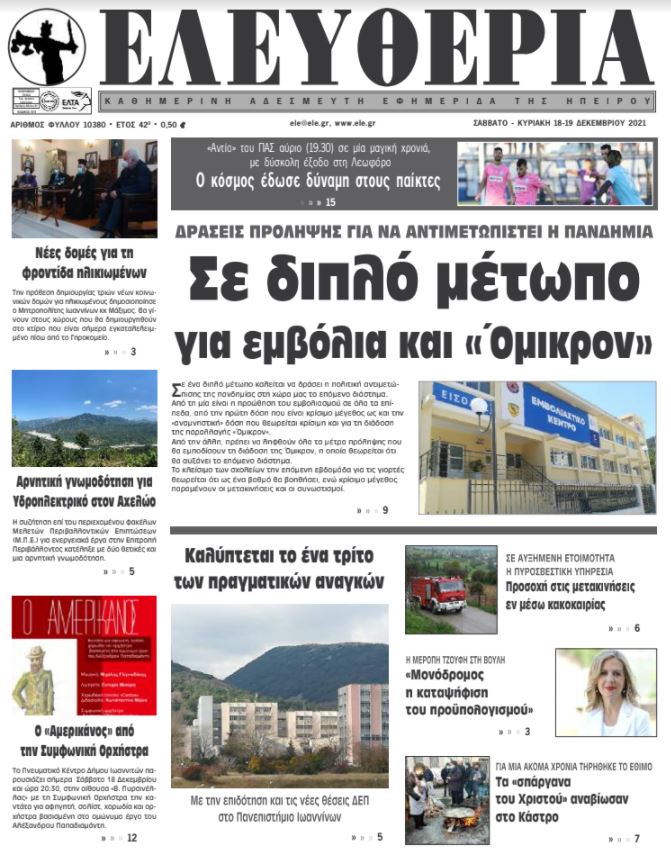 ΑρχικήTOP STORIES TOP STORIESΗΠΕΙΡΟΣ Τα πρωτοσέλιδα των γιαννιώτικων εφημερίδων 18.12.2021 144 FacebookTwitterWhatsAppEmailΤυπώνωViber Διαβάστε στα πρωτοσέλιδα των γιαννιώτικων εφημερίδων του Σαββατοκύριακου 18-19 Δεκεμβρίου TagsΓΙΑΝΝΙΩΤΙΚΕΣ ΕΦΗΜΕΡΙΔΕΣΠΡΩΤΟΣΕΛΙΔΑ FacebookTwitterWhatsAppEmailΤυπώνωViber Προηγούμενο άρθροΔύο «ναι» και ένα «όχι» η απάντηση σε ενεργειακά έργαΕπόμενο άρθροΣε διπλό μέτωπο για εμβόλια και «Όμικρον» ΣΧΕΤΙΚΑ ΑΡΘΡΑ Τα πρωτοσέλιδα των γιαννιώτικων εφημερίδων TOP STORIES 14.11.2025 Τα πρωτοσέλιδα των γιαννιώτικων εφημερίδων ΗΠΕΙΡΟΣ 13.11.2025 Τα πρωτοσέλιδα των γιαννιώτικων εφημερίδων ΗΠΕΙΡΟΣ 12.11.2025 Τα πρωτοσέλιδα των γιαννιώτικων εφημερίδων ΗΠΕΙΡΟΣ 11.11.2025 Τα πρωτοσέλιδα των γιαννιώτικων εφημερίδων TOP STORIES 08.11.2025 Τα πρωτοσέλιδα των γιαννιώτικων εφημερίδων ΗΠΕΙΡΟΣ 07.11.2025 ΣΤΗΝ ΙΔΙΑ ΚΑΤΗΓΟΡΙΑ Παγκόσμια Ημέρα Προωρότητας: Μήνυμα ευαισθητοποίησης από το «Χατζηκώστα» και τον Δήμο Ιωαννιτών ΗΠΕΙΡΟΣ 14.11.2025 Ηγουμενίτσα: Κατασχέθηκαν πάνω από 350 κιλά κάνναβης σε κοινή επιχείρηση Λιμενικού και Δίωξης ΗΠΕΙΡΟΣ 14.11.2025 Άρτα: Σύλληψη για επικίνδυνη οδήγηση και σωματική βλάβη από αμέλεια ΗΠΕΙΡΟΣ 14.11.2025 Συνελήφθη ημεδαπός στα Ιωάννινα για διακεκριμένες κλοπές ΗΠΕΙΡΟΣ 14.11.2025 Ενιαίο αστικό πάρκο στις παλιές στρατιωτικές φυλακές ΗΠΕΙΡΟΣ 14.11.2025 Τα πρωτοσέλιδα των γιαννιώτικων εφημερίδων TOP STORIES 14.11.2025 ΜΗ ΧΑΣΕΤΕ Ενιαίο αστικό πάρκο στις παλιές στρατιωτικές φυλακές Τα πρωτοσέλιδα των γιαννιώτικων εφημερίδων Επιχείρηση της Αστυνομίας Ιωαννίνων στον Πειραιά – Σύλληψη για ναρκωτικά και οπλισμό Δένδρο στην πλατεία, συναυλία στο Πνευματικό Κέντρο; «Λεόντειοι όροι» στη σύμβαση για τα LED ΔΗΜΟΦΙΛΗ Ρωσία και Κίνα εντείνουν τις κατασκοπευτικές τους δραστηριότητες στην Αρκτική Διεθνές Γραφείο του Πανεπιστημίου Ιωαννίνων στη Νέα Υόρκη Ποια πακέτα από Shein, Temu και AliExpress αφορά η επιβολή δασμών Καρκίνος του εντέρου σε νεότερες ηλικίες: Nέα μελέτη εξετάζει τον ρόλο της διατροφής Σαρώνουν τα μπλόκα του νέου ΚΟΚ