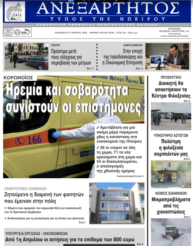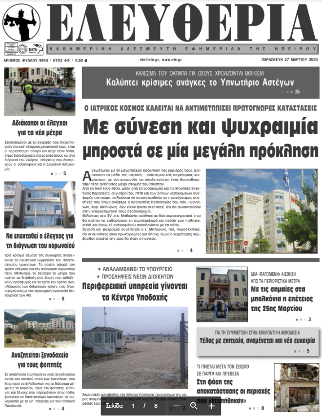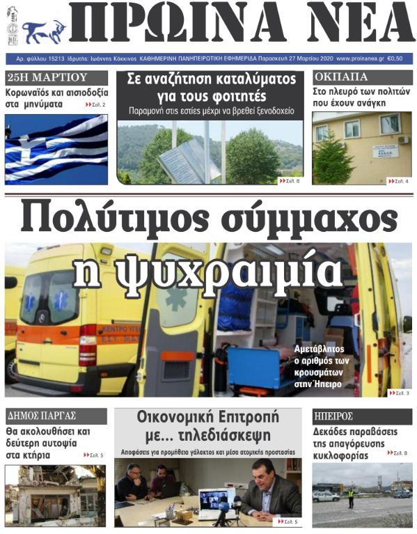 ΑρχικήΕΙΔΗΣΕΙΣΗΠΕΙΡΟΣ ΗΠΕΙΡΟΣ Τα πρωτοσέλιδα των γιαννιώτικων εφημερίδων 27.03.2020 250 FacebookTwitterWhatsAppEmailΤυπώνωViber Διαβάστε σήμερα στα πρωτοσέλιδα των γιαννιώτικων εφημερίδων σήμερα, Παρασκευή 27 Μαρτίου. TagsΓΙΑΝΝΙΩΤΙΚΕΣ ΕΦΗΜΕΡΙΔΕΣΠΡΩΤΟΣΕΛΙΔΑ FacebookTwitterWhatsAppEmailΤυπώνωViber Προηγούμενο άρθροΑναβάλλονται για 75 μέρες οι επιταγές – «Επίδομα» 600 ευρώ σε γιατρούς και δικηγόρουςΕπόμενο άρθροΑναβάλλεται ο διαγωνισμός ελαιόλαδου ATHIOOC ΣΧΕΤΙΚΑ ΑΡΘΡΑ Τα πρωτοσέλιδα των γιαννιώτικων εφημερίδων TOP STORIES 04.12.2025 Τα πρωτοσέλιδα των γιαννιώτικων εφημερίδων ΗΠΕΙΡΟΣ 03.12.2025 Τα πρωτοσέλιδα των γιαννιώτικων εφημερίδων TOP STORIES 02.12.2025 Τα πρωτοσέλιδα των γιαννιώτικων εφημερίδων ΗΠΕΙΡΟΣ 29.11.2025 Τα πρωτοσέλιδα των γιαννιώτικων εφημερίδων ΗΠΕΙΡΟΣ 28.11.2025 Τα πρωτοσέλιδα των γιαννιώτικων εφημερίδων ΗΠΕΙΡΟΣ 27.11.2025 ΣΤΗΝ ΙΔΙΑ ΚΑΤΗΓΟΡΙΑ Μελέτη αντιπλημμυρικών στα καμένα – Εντυπωσιακή η φυσική αναγέννηση του δάσους στο Ζηρό ΗΠΕΙΡΟΣ 04.12.2025 Τα πρωτοσέλιδα των γιαννιώτικων εφημερίδων TOP STORIES 04.12.2025 Κέρκυρα: Αυτοκίνητο έπεσε σε ποτάμι από ύψος 7 μέτρων -Επέβαιναν μητέρα και κόρη ΗΠΕΙΡΟΣ 03.12.2025 «Όλοι μαζί, χωρίς εμπόδια» ΗΠΕΙΡΟΣ 03.12.2025 Με μηνύσεις «απαντά» η Περιφέρεια Ηπείρου ΗΠΕΙΡΟΣ 03.12.2025 Εθελοντική αιμοδοσία στην Περιφέρεια Ηπείρου ΗΠΕΙΡΟΣ 03.12.2025 ΜΗ ΧΑΣΕΤΕ Επίδομα θέρμανσης: Αντίστροφη μέτρηση για την εκπνοή της προθεσμίας Μελέτη αντιπλημμυρικών στα καμένα – Εντυπωσιακή η φυσική αναγέννηση του δάσους στο Ζηρό Τα πρωτοσέλιδα των γιαννιώτικων εφημερίδων Με μηνύσεις «απαντά» η Περιφέρεια Ηπείρου Συνεχίζονται οι κινητοποιήσεις των αγροτών στο μπλόκο Καλπακίου ΔΗΜΟΦΙΛΗ Πανελλαδική 24ωρη απεργία των οικοδόμων στις 10 Δεκεμβρίου Τα πρωτοσέλιδα των γιαννιώτικων εφημερίδων Επίδομα θέρμανσης: Αντίστροφη μέτρηση για την εκπνοή της προθεσμίας Ψήφισμα του ΟΗΕ για την άμεση επιστροφή των παιδιών στην Ουκρανία Εκτροπή λεωφορείου με 25 εργαζόμενους στη ΔΕΗ – Νεκρός ο οδηγός