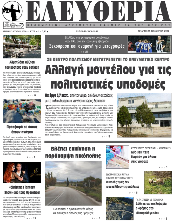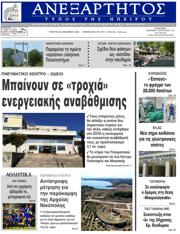 ΑρχικήTOP STORIES TOP STORIESΗΠΕΙΡΟΣ Τα πρωτοσέλιδα των γιαννιώτικων εφημερίδων 22.12.2021 98 FacebookTwitterWhatsAppEmailΤυπώνωViber Διαβάστε στα πρωτοσέλιδα των γιαννιώτικων εφημερίδων της Τετάρτης 22 Δεκεμβρίου TagsΓΙΑΝΝΙΩΤΙΚΕΣ ΕΦΗΜΕΡΙΔΕΣΠΡΩΤΟΣΕΛΙΔΑ FacebookTwitterWhatsAppEmailΤυπώνωViber Προηγούμενο άρθροΜετάλλαξη Όμικρον: Έρχονται νέοι περιορισμοί μετά τις γιορτέςΕπόμενο άρθροΗ Ήπειρος και τα Ιωάννινα πρωταγωνιστούν στο νέο σποτ για τον τουρισμό (βίντεο) ΣΧΕΤΙΚΑ ΑΡΘΡΑ Τα πρωτοσέλιδα των γιαννιώτικων εφημερίδων ΗΠΕΙΡΟΣ 22.11.2025 Τα πρωτοσέλιδα των γιαννιώτικων εφημερίδων ΗΠΕΙΡΟΣ 21.11.2025 Τα πρωτοσέλιδα των γιαννιώτικων εφημερίδων TOP STORIES 20.11.2025 Τα πρωτοσέλιδα των γιαννιώτικων εφημερίδων ΗΠΕΙΡΟΣ 19.11.2025 Τα πρωτοσέλιδα των γιαννιώτικων εφημερίδων ΗΠΕΙΡΟΣ 18.11.2025 Τα πρωτοσέλιδα των γιαννιώτικων εφημερίδων ΗΠΕΙΡΟΣ 15.11.2025 ΣΤΗΝ ΙΔΙΑ ΚΑΤΗΓΟΡΙΑ Άμεση στήριξη υποσχέθηκε ο Χρ. Δήμας για τα Τζουμέρκα ΗΠΕΙΡΟΣ 24.11.2025 Ήδη σε κατάσταση έκτακτης ανάγκης ο Δήμος Βορείων Τζουμέρκων ΗΠΕΙΡΟΣ 24.11.2025 Κυκλοφοριακές ρυθμίσεις λόγω εργασιών αποκατάστασης στον Δήμο Ζηρού ΗΠΕΙΡΟΣ 24.11.2025 Σύλληψη φυγόποινου για φοροδιαφυγή ΗΠΕΙΡΟΣ 24.11.2025 Συνελήφθη αλλοδαπός με ένταλμα στη Θεσπρωτία ΗΠΕΙΡΟΣ 24.11.2025 Αντίστροφη μέτρηση για το εορταστικό ωράριο Χριστουγέννων TOP STORIES 24.11.2025 ΜΗ ΧΑΣΕΤΕ Άμεση στήριξη υποσχέθηκε ο Χρ. Δήμας για τα Τζουμέρκα Έκτακτο δελτίο καιρού: Ισχυρή κακοκαιρία από την Τρίτη με βροχές και καταιγίδες Πρόοδος στις διαπραγματεύσεις για το αμερικανικό σχέδιο ειρήνης Αντίστροφη μέτρηση για το εορταστικό ωράριο Χριστουγέννων Επίδομα 250 ευρώ: Ποιοι πληρώνονται – Αναλυτικά τα κριτήρια ΔΗΜΟΦΙΛΗ Επίδομα 250 ευρώ: Ποιοι πληρώνονται – Αναλυτικά τα κριτήρια Πρόοδος στις διαπραγματεύσεις για το αμερικανικό σχέδιο ειρήνης Πτώση της θερμοκρασίας και τοπικές νεφώσεις – Ο καιρός της εβδομάδας Αναγκαία η άμεση δράση για την προστασία της δημόσιας υγείας Σεισμός 4,2 Ρίχτερ στην Καρδίτσα