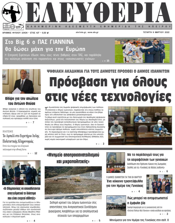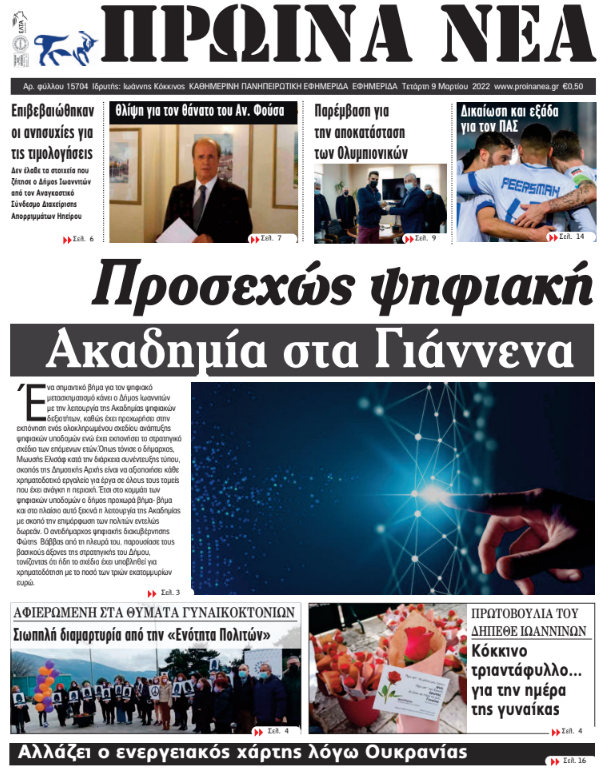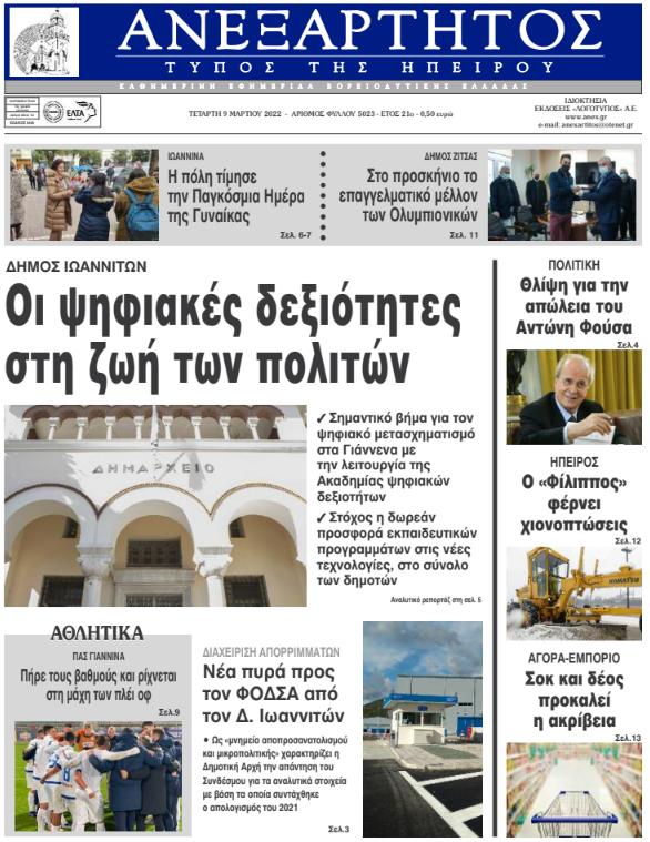 ΑρχικήTOP STORIES TOP STORIESΗΠΕΙΡΟΣ Τα πρωτοσέλιδα των γιαννιώτικων εφημερίδων 09.03.2022 99 FacebookTwitterWhatsAppEmailΤυπώνωViber Διαβάστε στα πρωτοσέλιδα των γιαννιώτικων εφημερίδων της Τετάρτης 9 Μαρτίου TagsΓΙΑΝΝΙΩΤΙΚΕΣ ΕΦΗΜΕΡΙΔΕΣΠΡΩΤΟΣΕΛΙΔΑ FacebookTwitterWhatsAppEmailΤυπώνωViber Προηγούμενο άρθροΚλειστά τα σχολεία στο Δήμο ΙωαννιτώνΕπόμενο άρθροΑπαγόρευση φορτηγών λόγω χιονιού στην Εγνατία- Μόνο με αλυσίδες τα ΙΧ ΣΧΕΤΙΚΑ ΑΡΘΡΑ Τα πρωτοσέλιδα των γιαννιώτικων εφημερίδων TOP STORIES 08.11.2025 Τα πρωτοσέλιδα των γιαννιώτικων εφημερίδων ΗΠΕΙΡΟΣ 07.11.2025 Τα πρωτοσέλιδα των γιαννιώτικων εφημερίδων ΗΠΕΙΡΟΣ 06.11.2025 Τα πρωτοσέλιδα των γιαννιώτικων εφημερίδων ΗΠΕΙΡΟΣ 05.11.2025 Τα πρωτοσέλιδα των γιαννιώτικων εφημερίδων ΗΠΕΙΡΟΣ 04.11.2025 Τα πρωτοσέλιδα των γιαννιώτικων εφημερίδων TOP STORIES 01.11.2025 ΣΤΗΝ ΙΔΙΑ ΚΑΤΗΓΟΡΙΑ Συντάξεις Δεκεμβρίου: Πότε θα καταβληθούν TOP STORIES 10.11.2025 Παρέλαβε δέμα με ναρκωτικά από θυρίδα ταχυμεταφορών ΗΠΕΙΡΟΣ 10.11.2025 Ο «χάρτης» των πληρωμών από τον e-ΕΦΚΑ και τη ΔΥΠΑ έως την Παρασκευή 14 Νοεμβρίου TOP STORIES 10.11.2025 Κοινό των Ηπειρωτών: Ανάγκη για πλήρη διαφάνεια στις παρεμβάσεις στον Γράμμο ΗΠΕΙΡΟΣ 10.11.2025 Η Ελλάδα πρώτη στην ΕΕ σε πολίτες χωρίς αναγκαία ιατρική περίθαλψη TOP STORIES 10.11.2025 Μεγάλα προβλήματα από την κακοκαιρία σε Φιλιππιάδα, Πρέβεζα και Βόνιτσα ΗΠΕΙΡΟΣ 10.11.2025 ΜΗ ΧΑΣΕΤΕ Συντάξεις Δεκεμβρίου: Πότε θα καταβληθούν Ο «χάρτης» των πληρωμών από τον e-ΕΦΚΑ και τη ΔΥΠΑ έως την Παρασκευή 14 Νοεμβρίου Η Ελλάδα πρώτη στην ΕΕ σε πολίτες χωρίς αναγκαία ιατρική περίθαλψη Μεγάλα προβλήματα από την κακοκαιρία σε Φιλιππιάδα, Πρέβεζα και Βόνιτσα Ξεκινούν οι αιτήσεις για το επίδομα θέρμανσης ΔΗΜΟΦΙΛΗ 4 αλλαγές στην καθημερινότητα για πιο υγιές έντερο Μεγάλα προβλήματα από την κακοκαιρία σε Φιλιππιάδα, Πρέβεζα και Βόνιτσα Ο «χάρτης» των πληρωμών από τον e-ΕΦΚΑ και τη ΔΥΠΑ έως την Παρασκευή 14 Νοεμβρίου Ισχυρές βροχές και καταιγίδες στα ηπειρωτικά και το Ιόνιο Κοινό των Ηπειρωτών: Ανάγκη για πλήρη διαφάνεια στις παρεμβάσεις στον Γράμμο
