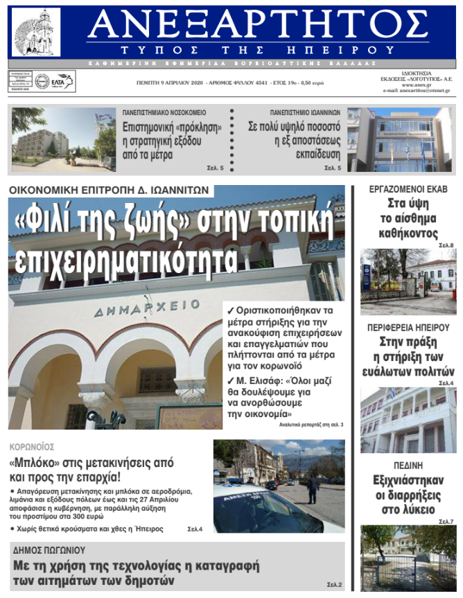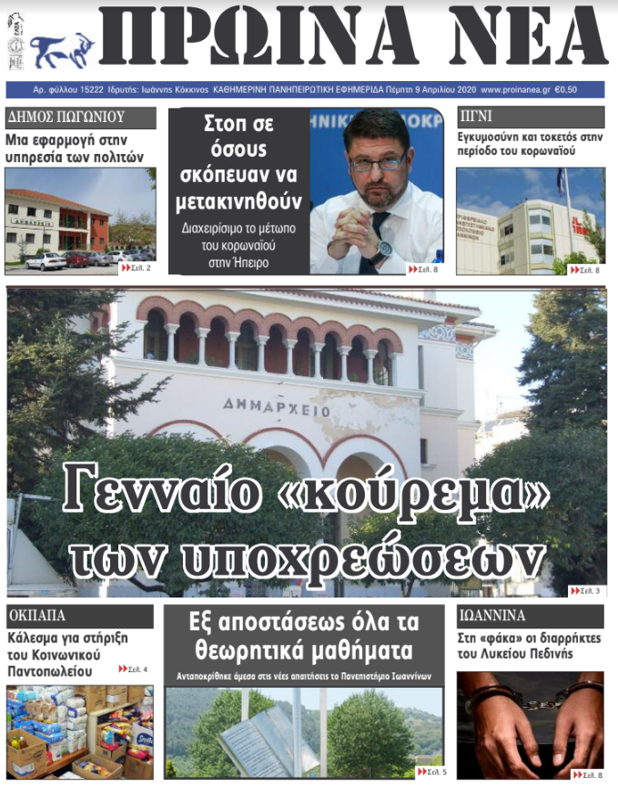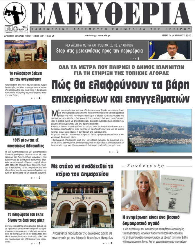 ΑρχικήΕΙΔΗΣΕΙΣΗΠΕΙΡΟΣ ΗΠΕΙΡΟΣ Τα πρωτοσέλιδα των γιαννιώτικων εφημερίδων 09.04.2020 232 FacebookTwitterWhatsAppEmailΤυπώνωViber Διαβάστε στα πρωτοσέλιδα των γιαννιώτικων εφημερίδων σήμερα, Πέμπτη 9 Απριλίου. TagsΓΙΑΝΝΙΩΤΙΚΕΣ ΕΦΗΜΕΡΙΔΕΣΠΡΩΤΟΣΕΛΙΔΑ FacebookTwitterWhatsAppEmailΤυπώνωViber Προηγούμενο άρθροΣΥΡΙΖΑ: «Κίνδυνος απώλειας του εαρινού εξαμήνου για τους καταρτιζόμενους των ΙΕΚ»Επόμενο άρθροΠώς θα ελαφρύνουν τα βάρη επιχειρήσεων και επαγγελματιών ΣΧΕΤΙΚΑ ΑΡΘΡΑ Τα πρωτοσέλιδα των γιαννιώτικων εφημερίδων TOP STORIES 11.11.2025 Τα πρωτοσέλιδα των γιαννιώτικων εφημερίδων TOP STORIES 08.11.2025 Τα πρωτοσέλιδα των γιαννιώτικων εφημερίδων ΗΠΕΙΡΟΣ 07.11.2025 Τα πρωτοσέλιδα των γιαννιώτικων εφημερίδων ΗΠΕΙΡΟΣ 06.11.2025 Τα πρωτοσέλιδα των γιαννιώτικων εφημερίδων ΗΠΕΙΡΟΣ 05.11.2025 Τα πρωτοσέλιδα των γιαννιώτικων εφημερίδων ΗΠΕΙΡΟΣ 04.11.2025 ΣΤΗΝ ΙΔΙΑ ΚΑΤΗΓΟΡΙΑ Ενημερωτική δράση για τον σακχαρώδη διαβήτη στα Ιωάννινα ΗΠΕΙΡΟΣ 11.11.2025 Συνελήφθη αλλοδαπός διωκόμενος στην Κακαβιά ΗΠΕΙΡΟΣ 11.11.2025 Κατασχέθηκαν 45 αρνιά στην Πρέβεζα – Δύο συλλήψεις ΗΠΕΙΡΟΣ 11.11.2025 43χρονος βρέθηκε νεκρός εντός Ι.Χ. στο Τέροβο ΗΠΕΙΡΟΣ 11.11.2025 Επί τάπητος υποδομές, περιβάλλον και ΤΠΣ ΗΠΕΙΡΟΣ 11.11.2025 Σε αυξημένη ετοιμότητα η Ήπειρος για τη γρίπη των πτηνών ΗΠΕΙΡΟΣ 11.11.2025 ΜΗ ΧΑΣΕΤΕ 43χρονος βρέθηκε νεκρός εντός Ι.Χ. στο Τέροβο Επίδομα θέρμανσης: Νέες οδηγίες της ΑΑΔΕ Σε αυξημένη ετοιμότητα η Ήπειρος για τη γρίπη των πτηνών Δωρεά ζωής από ασθενή στο ΠΓΝΙ Νέες αντιδράσεις για τις παρεμβάσεις στο Γράμμο ΔΗΜΟΦΙΛΗ Αριθμός ρεκόρ Ουκρανών έλαβαν προσωρινή προστασία στην ΕΕ από το 2023 Επίδομα παραμεθορίου στα στελέχη των Ενόπλων Δυνάμεων Τα του Καίσαρος… Αυστηρό μήνυμα ΗΠΑ προς Τουρκία: Σταματήστε αγορές αερίου και πετρελαίου από Ρωσία Λαβρόφ: Η Ρωσία θα διεξάγει πυρηνικές δοκιμές αν το κάνει οποιαδήποτε άλλη πυρηνική δύναμη
